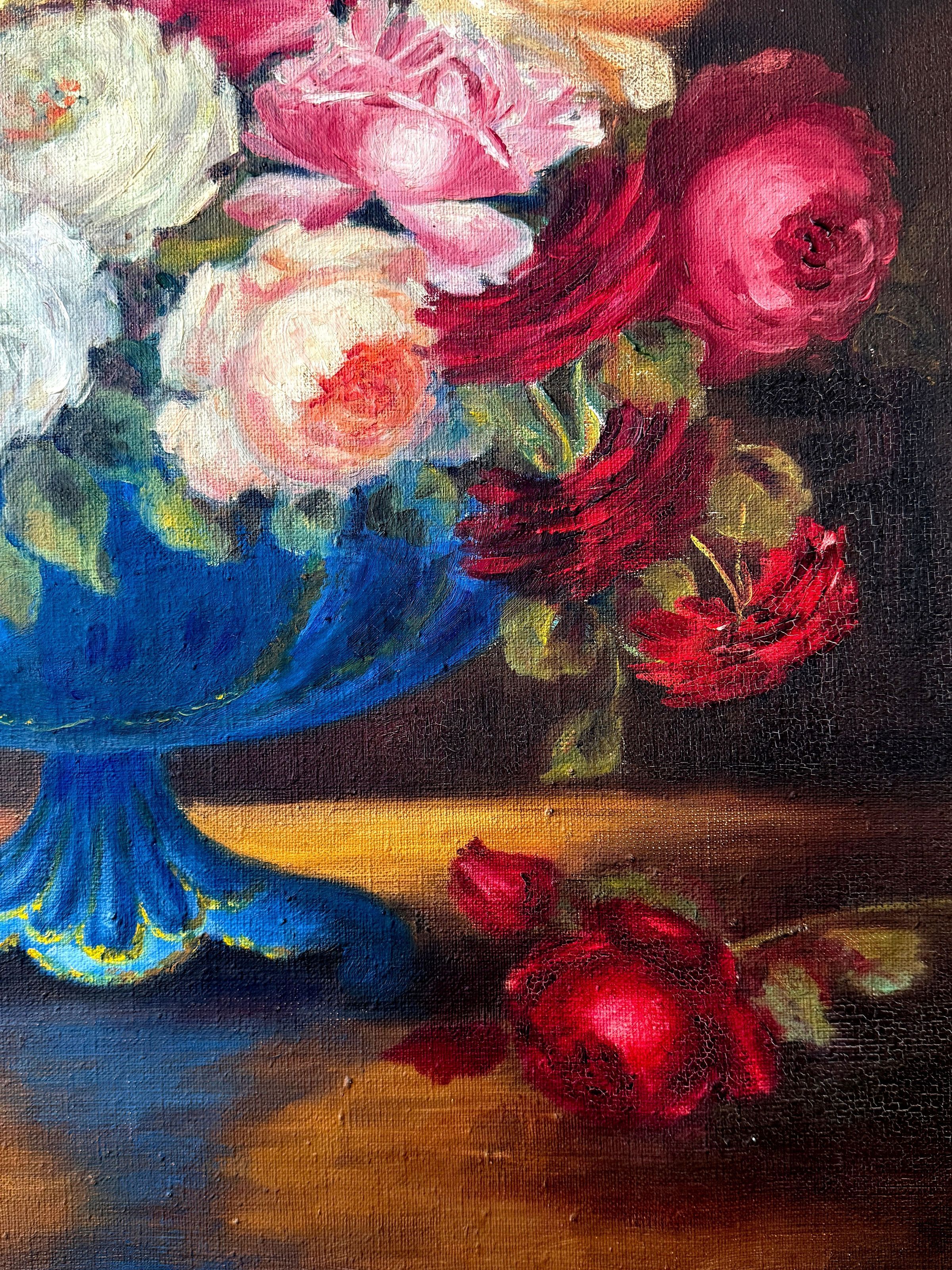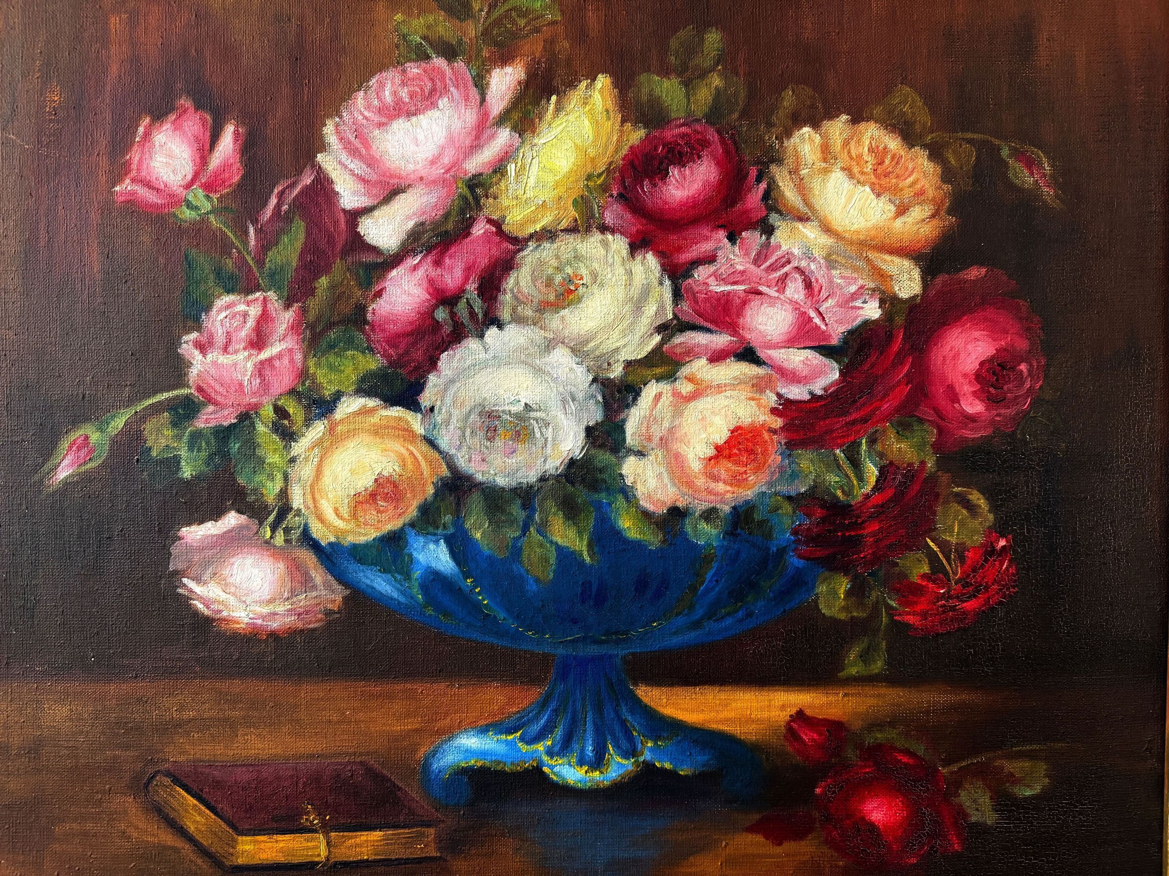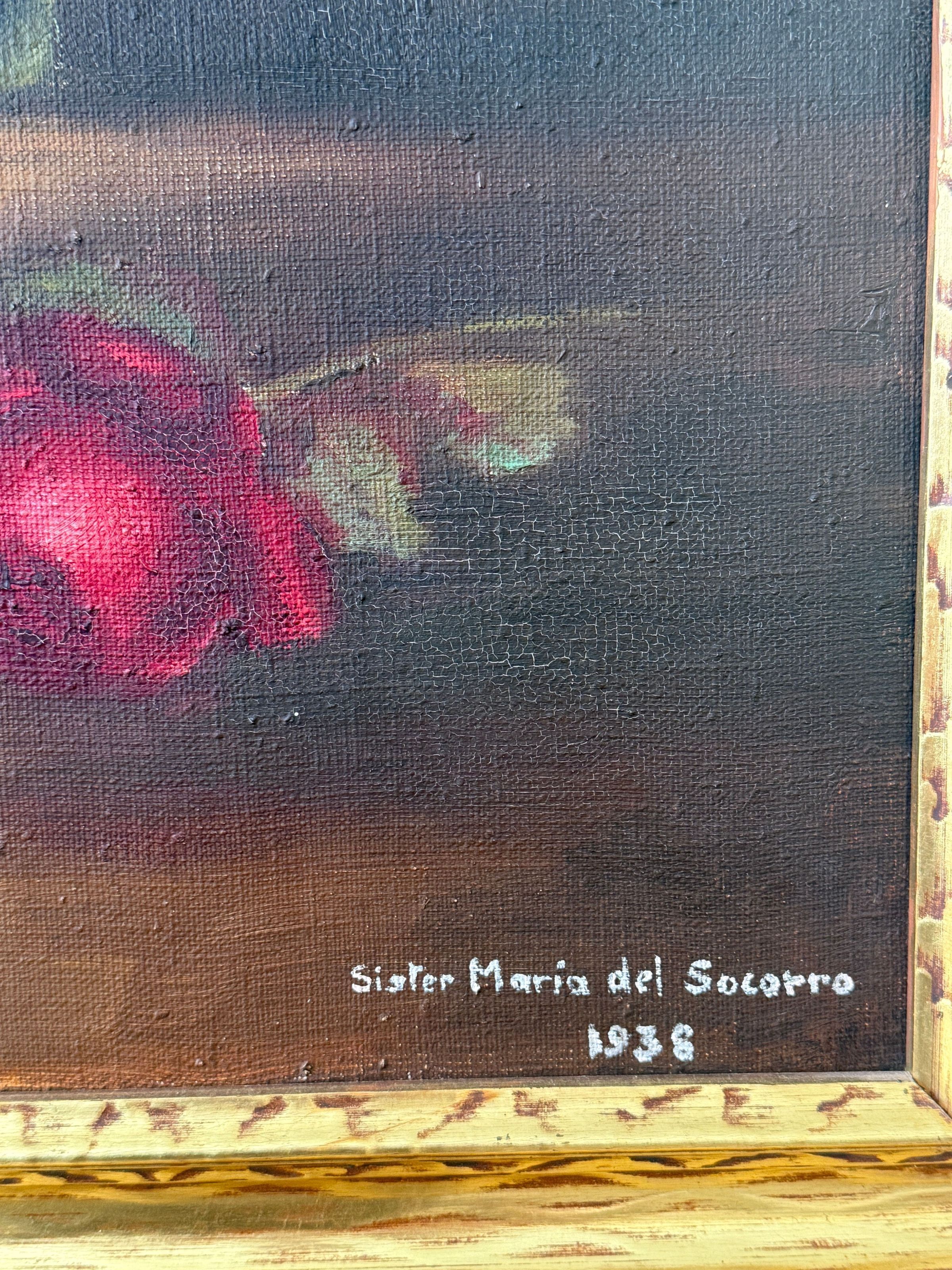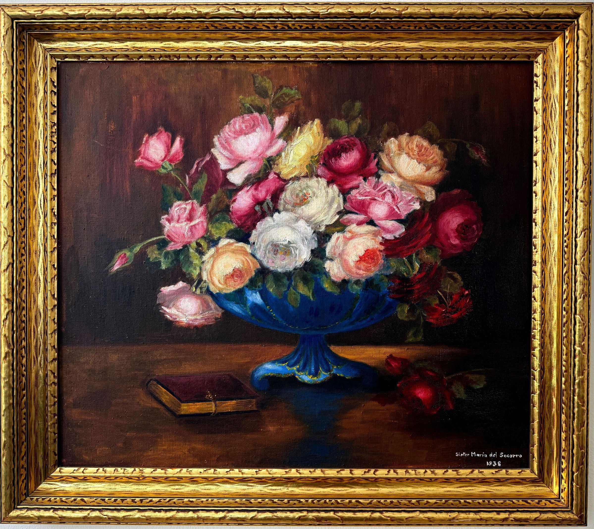Title [assigned by archives]: Still Life with Roses in a Blue Vase In this 1938 painting, Sister María del Socorro Lazo Houston (1893 – 1956) depicts jewel-toned pink, yellow and white roses in a blue bowl-shaped vase. A single fallen rose sits on the table next to the flower arrangement. On the left side of the composition sits a closed brown leather-bound book with gold-edged pages. Though this is one of Sister María del Socorro’s numerous still life paintings, its color palette is far darker and richer than her others. Sister María del Socorro painted this still life while working as an art instructor at Incarnate Word College. Título [asignado por los archivos]: Naturaleza muerta con rosas en un jarrón azul En esta pintura de 1938, la sor María del Socorro Lazo Houston (1893-1956) representa rosas de tonos joya, amarillas y blancas, en un jarrón azul con forma de cuenco. Una sola rosa caída descansa sobre la mesa junto al arreglo floral. En la parte izquierda de la composición hay un libro cerrado encuadernado en cuero marrón con páginas con bordes dorados. Aunque se trata de uno de los numerosos bodegones de sor María del Socorro, su paleta de colores es mucho más oscura y rica que la de los demás. La sor María del Socorro pintó este bodegón mientras trabajaba como profesora de arte en el Incarnate Word College.
