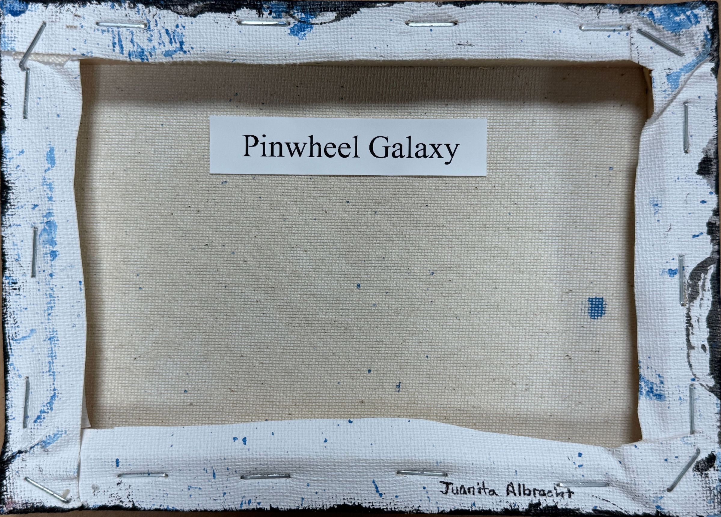 Title [assigned by artist]: Pinwheel Galaxy This painting of the Pinwheel Galaxy is part of a series of paintings of the cosmos by Sister Juanita Albracht, CCVI (1933 - ). Sister Juanita wrote, “The Pinwheel Galaxy, M 101, is a Barred Spiral Galaxy, type C, which group have loosely bound arms. They are also known as disk galaxies. 77% of all galaxies are spiral. The Pinwheel Galaxy is 25 million light years away from the Earth. The Pinwheel galaxy was discovered by Pierre Meehan in 1741. Hubble, in 1926, described it as described it as "a rotating disk that contains stars, dust, gas and a concoction of stars in the center bulge, surrounded by a cluster (hole) of stars." Título [asignado por el artista]: Galaxia del Remolino Esta pintura de la Galaxia del Remolino forma parte de una serie de pinturas del cosmos de la Hermana Juanita Albracht, CCVI (1933-). La Hermana Juanita escribió: «La Galaxia del Remolino, M 101, es una galaxia espiral barrada, tipo C, cuyo grupo presenta brazos ligeramente unidos. También se conocen como galaxias de disco. El 77 % de todas las galaxias son espirales. La Galaxia del Remolino se encuentra a 25 millones de años luz de la Tierra. Fue descubierta por Pierre Meehan en 1741. Hubble, en 1926, la describió como «un disco giratorio que contiene estrellas, polvo, gas y una mezcla de estrellas en el bulbo central, rodeado por un cúmulo (agujero) de estrellas».