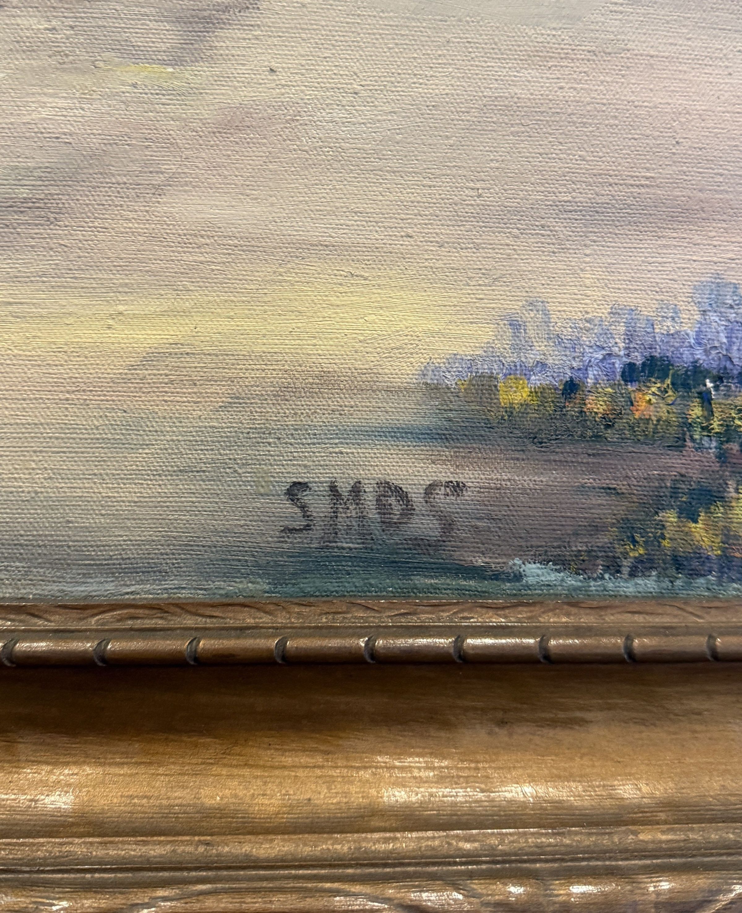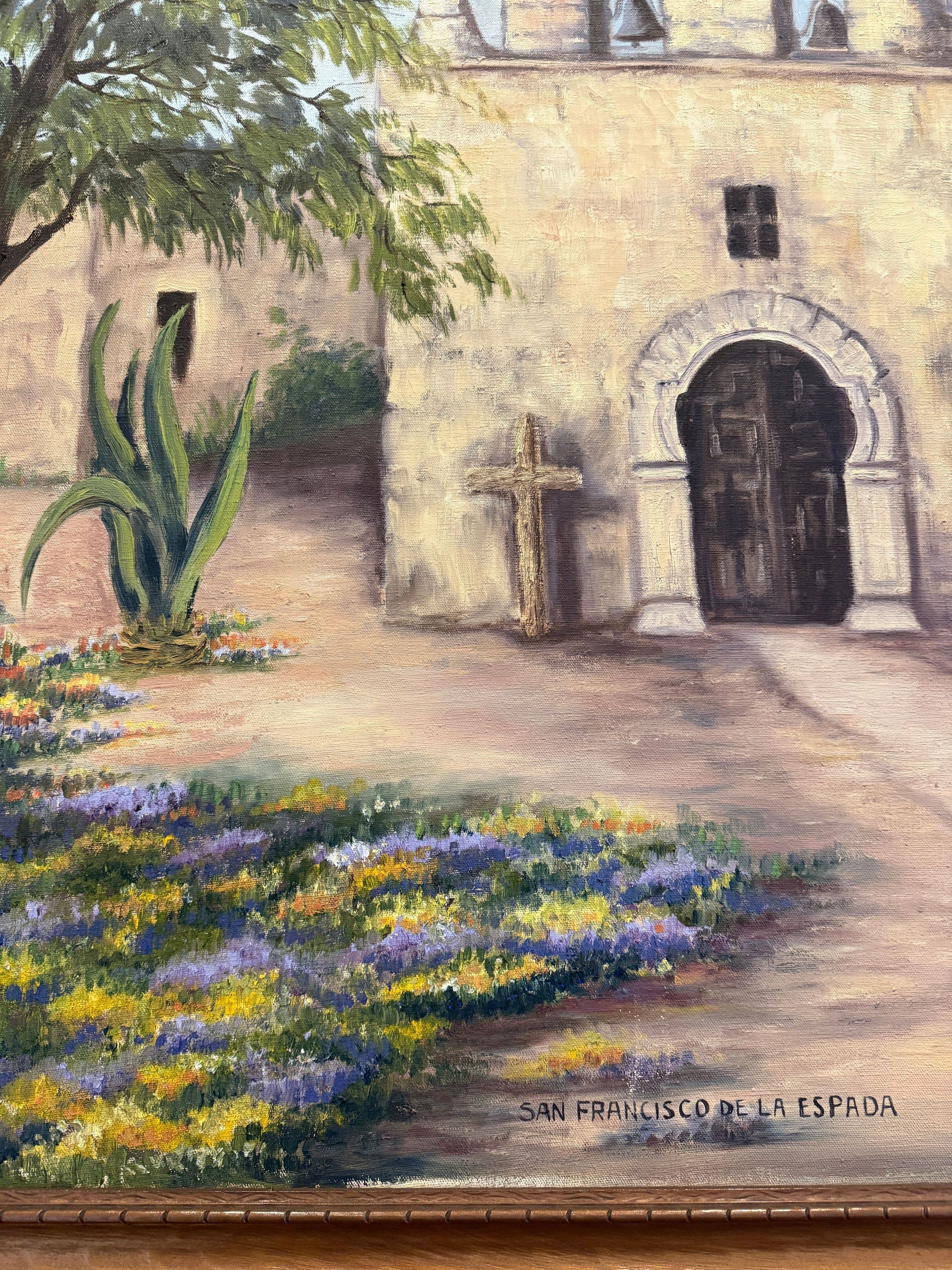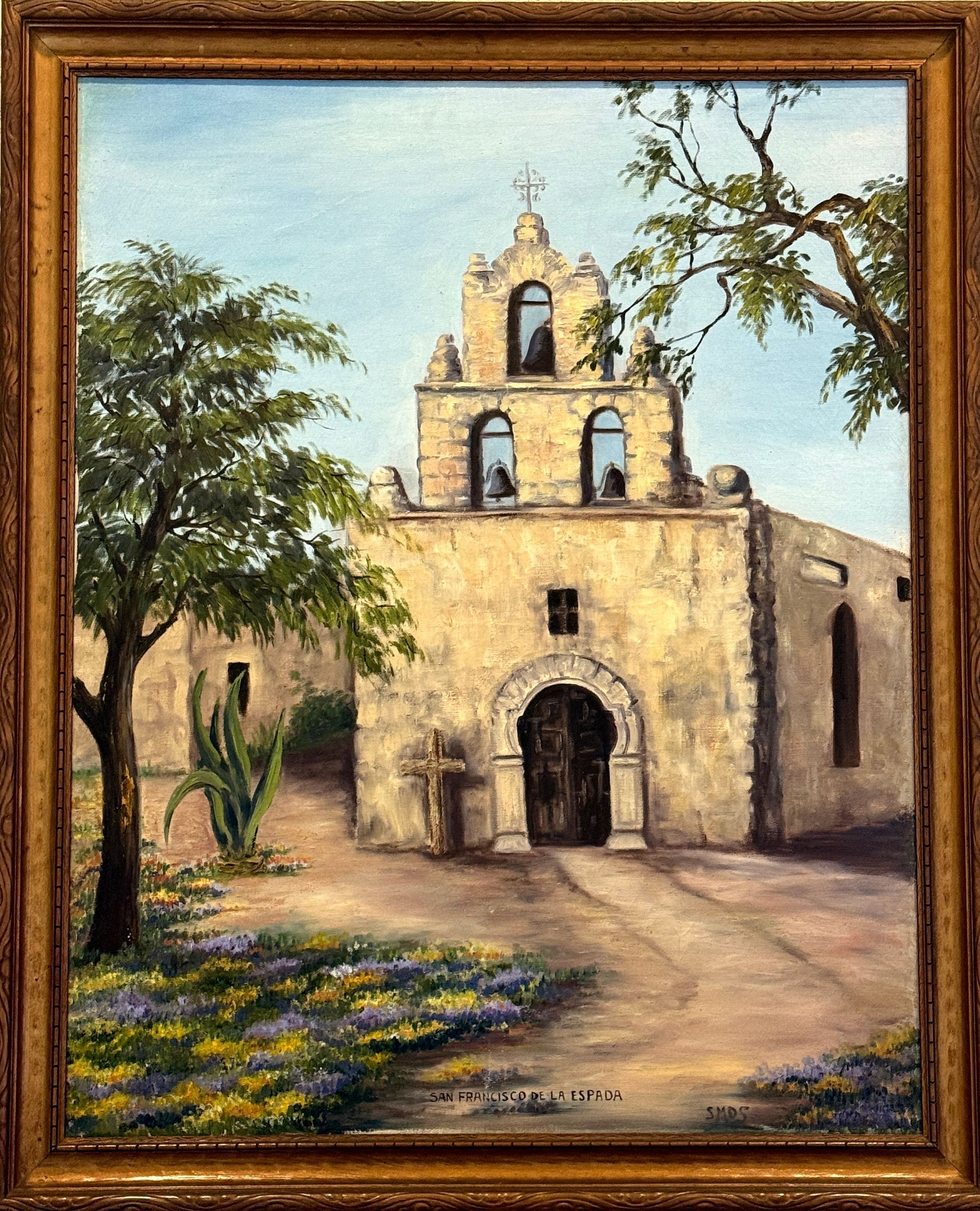 Title [assigned by artist]: San Francisco de la Espada Sister María del Socorro Lazo Houston, CCVI (1893 – 1956) created a series of large-scale oil paintings of the San Antonio Missions that can be found (as of 9/2025) on the University of the Incarnate Word campus. This painting, depicting the Mission San Francisco de la Espada, hangs in the lobby of the Bennack Concert Hall. Sister María del Socorro painted a front view of Mission Espada. Two trees frame the composition, towering over an agave plant and patches of yellow and purple flowers. A wooden cross stands to the side of the front doorway. Mission Espada was the first mission in Texas, founded in 1690. Sister Anne Quinn, CCVI wrote in 1969 about Sister María del Socorro’s love of Texan imagery, like the missions: “She herself maintained that Texas itself was the source of her inspiration for most of her paintings. She loved Texas passionately and found an affinity with the state which somehow reflects itself in much of her paintings.” Título [asignado por el artista]: San Francisco de la Espada Sor María del Socorro Lazo Houston, CCVI (1893-1956) creó una serie de pinturas al óleo a gran escala de las misiones de San Antonio que se pueden encontrar (a fecha de septiembre de 2025) en el campus de la Universidad del Verbo Encarnado. Esta pintura, que representa la Misión de San Francisco de la Espada, cuelga en el vestíbulo del Bennack Concert Hall. La hermana María del Socorro pintó una vista frontal de la Misión de Espada. Dos árboles enmarcan la composición, elevándose sobre una planta de agave y parches de flores amarillas y moradas. Una cruz de madera se encuentra al lado de la puerta principal. La Misión Espada fue la primera misión en Texas, fundada en 1690. La Sor Anne Quinn, CCVI, escribió en 1969 sobre el amor de la sor María del Socorro por las imágenes texanas, como las misiones: «Ella misma sostenía que Texas era la fuente de inspiración de la mayoría de sus pinturas. Amaba Texas apasionadamente y sentía una gran afinidad con el estado, lo que de alguna manera se refleja en muchas de sus pinturas».