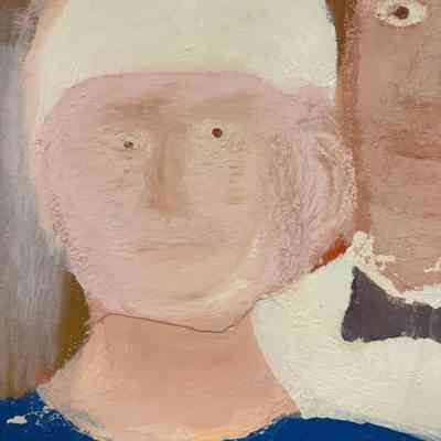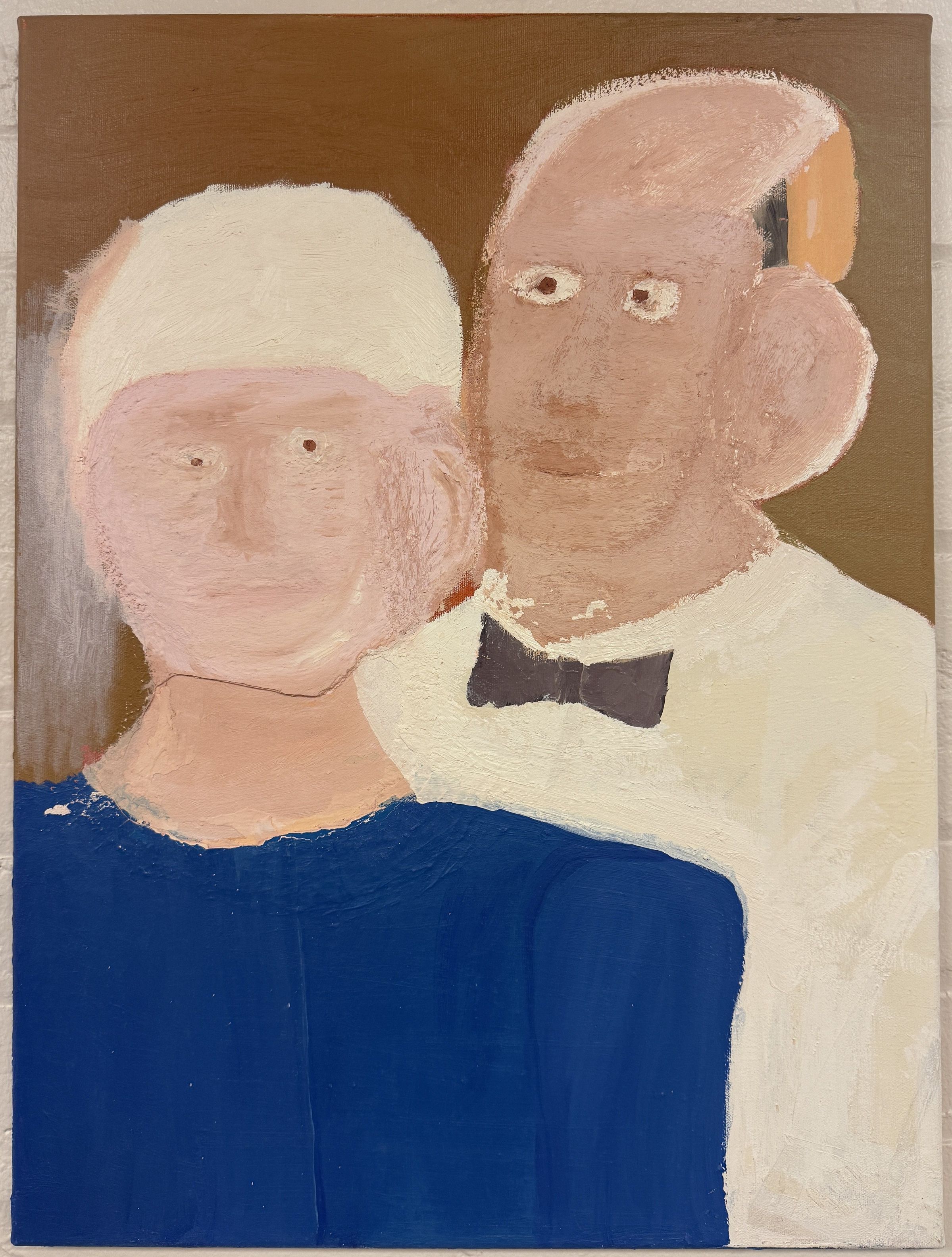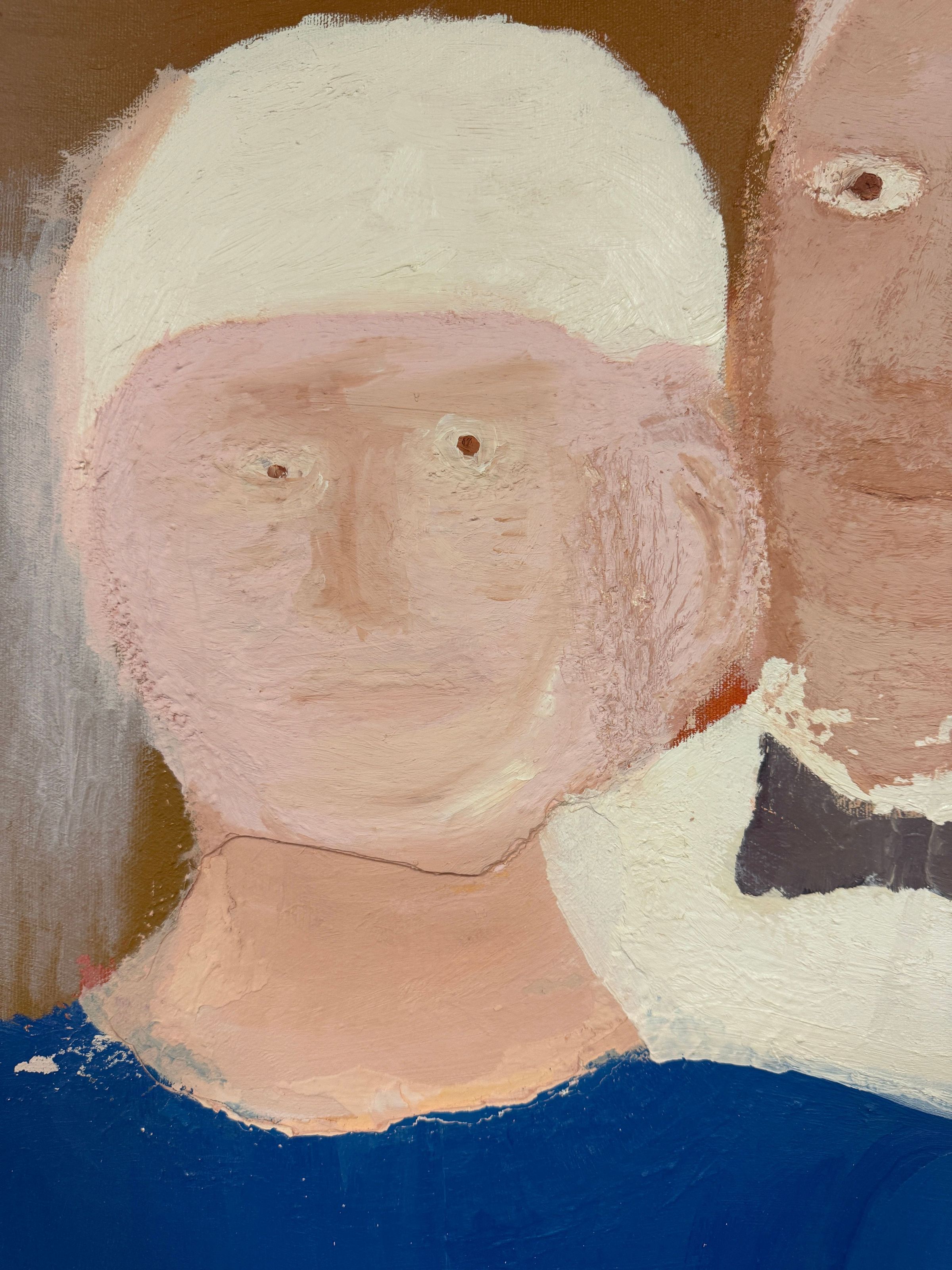 Title [assigned by archives]: Portrait of a Couple Sister Catalina Fresquez, CCVI (1937 – 2019) painted this portrait of a couple using an impasto technique. She applied paint thickly to the surface of the canvas, giving a sculpted, three-dimensional texture to the piece. Sister Catalina rendered this portrait of a couple in an abstract manner; heir features are blurred and undefined. The woman faces forward in a royal blue blouse while the man, positioned behind her, looks off to the side in a white shirt with a black bow tie. Título [asignado por los archivos]: Retrato de una pareja Sor Catalina Fresquez, CCVI (1937 - 2019) pintó este retrato de una pareja utilizando una técnica de empaste. Aplicó pintura espesa a la superficie del lienzo, dando una textura esculpida y tridimensional a la obra. La Hermana Catalina pintó este retrato de una pareja de forma abstracta; sus rasgos son borrosos e indefinidos. La mujer está de frente, con una blusa azul real, mientras que el hombre, situado detrás de ella, mira hacia un lado, con una camisa blanca y una pajarita negra.