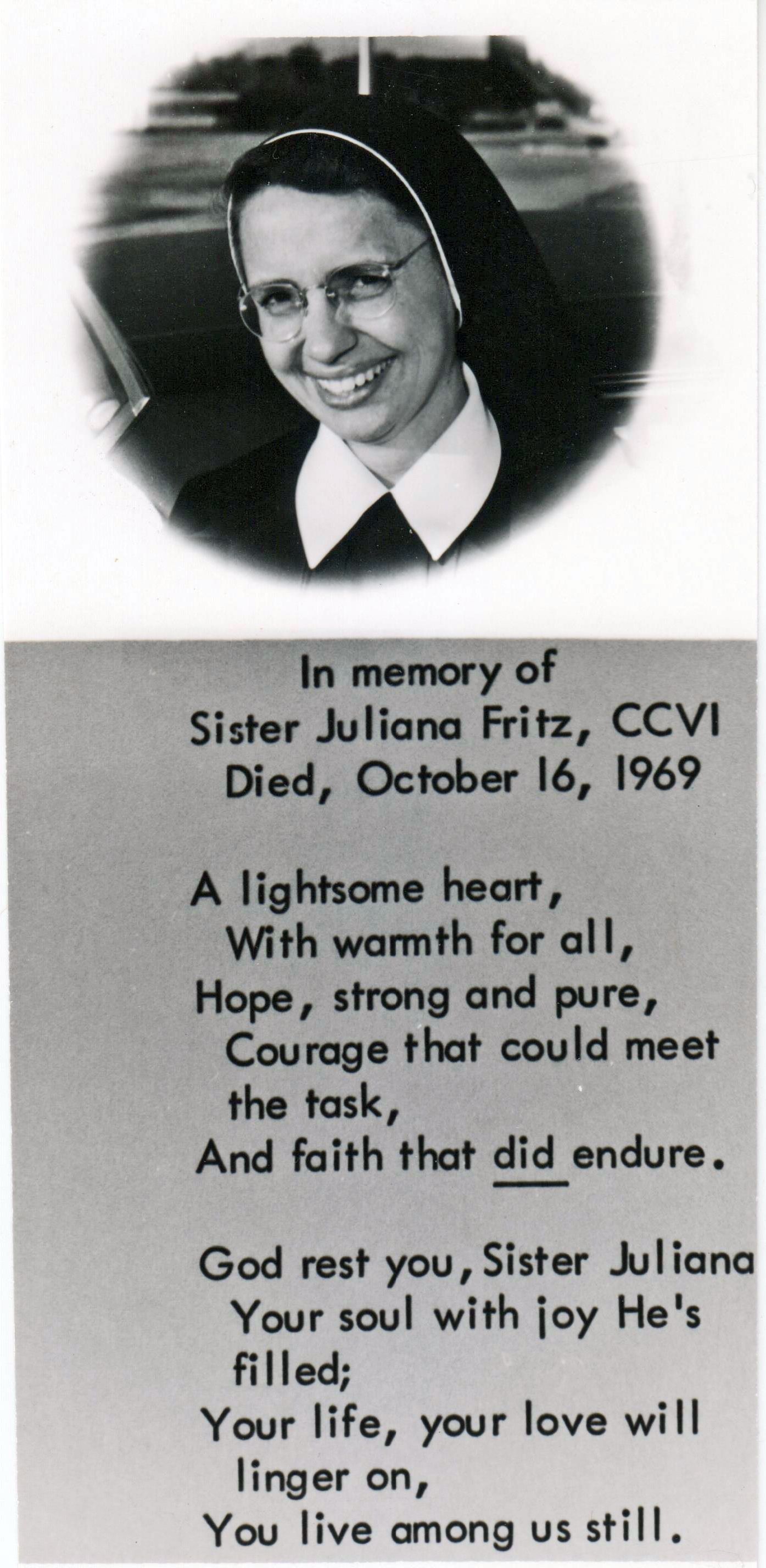 Sor Juliana Fritz, CCVI nació el 26 de marzo de 1934 en Castroville, Texas. Ingresó a la Congregación de las Hermanas de la Caridad del Verbo Encarnado en 1952, hizo sus primeros votos en 1955 y su profesión perpetua en 1960. Vivió una vida corta pero impactante y sirvió como educadora primaria y maestra de educación física en escuelas de Texas y Louisiana. La Hermana falleció de cáncer a la edad de 35 años el 16 de octubre de 1969. Fue recordada con cariño por sus Hermanas y alumnos; una alumna del instituto Archbishop Chapelle de Metairie, Luisiana, comentó: «La Hermana Juliana era una de las personas más valientes y completas que he conocido.»