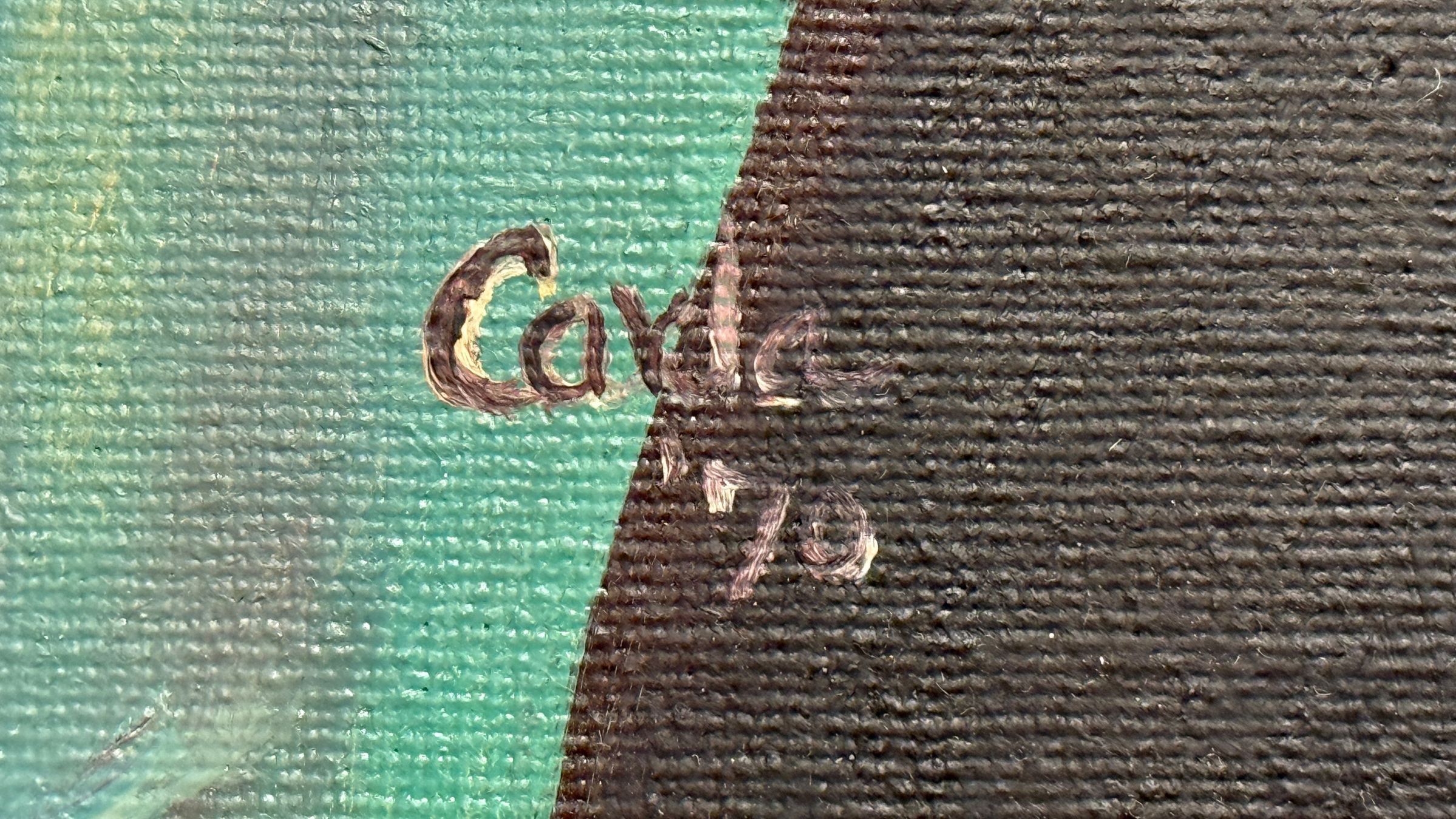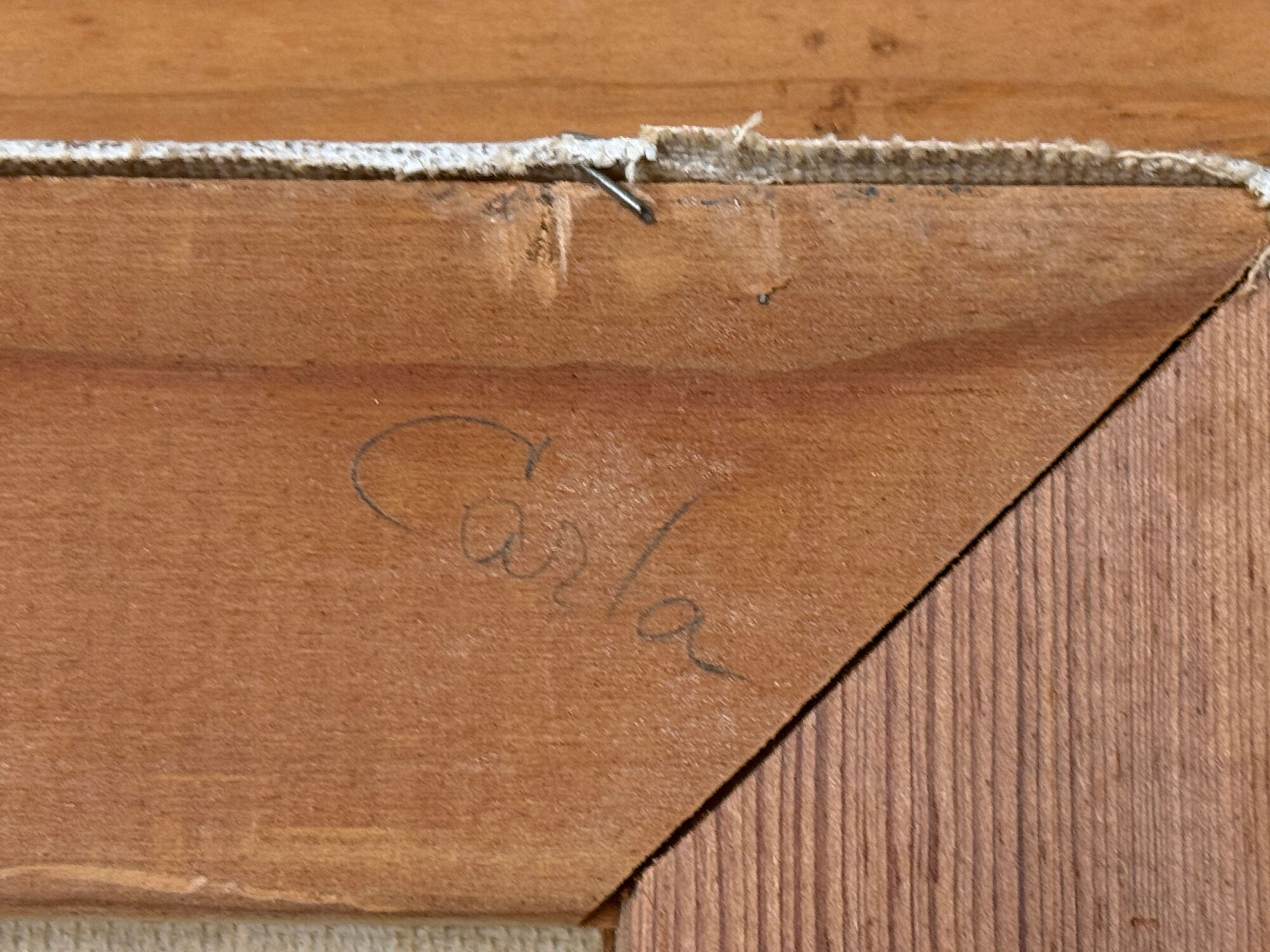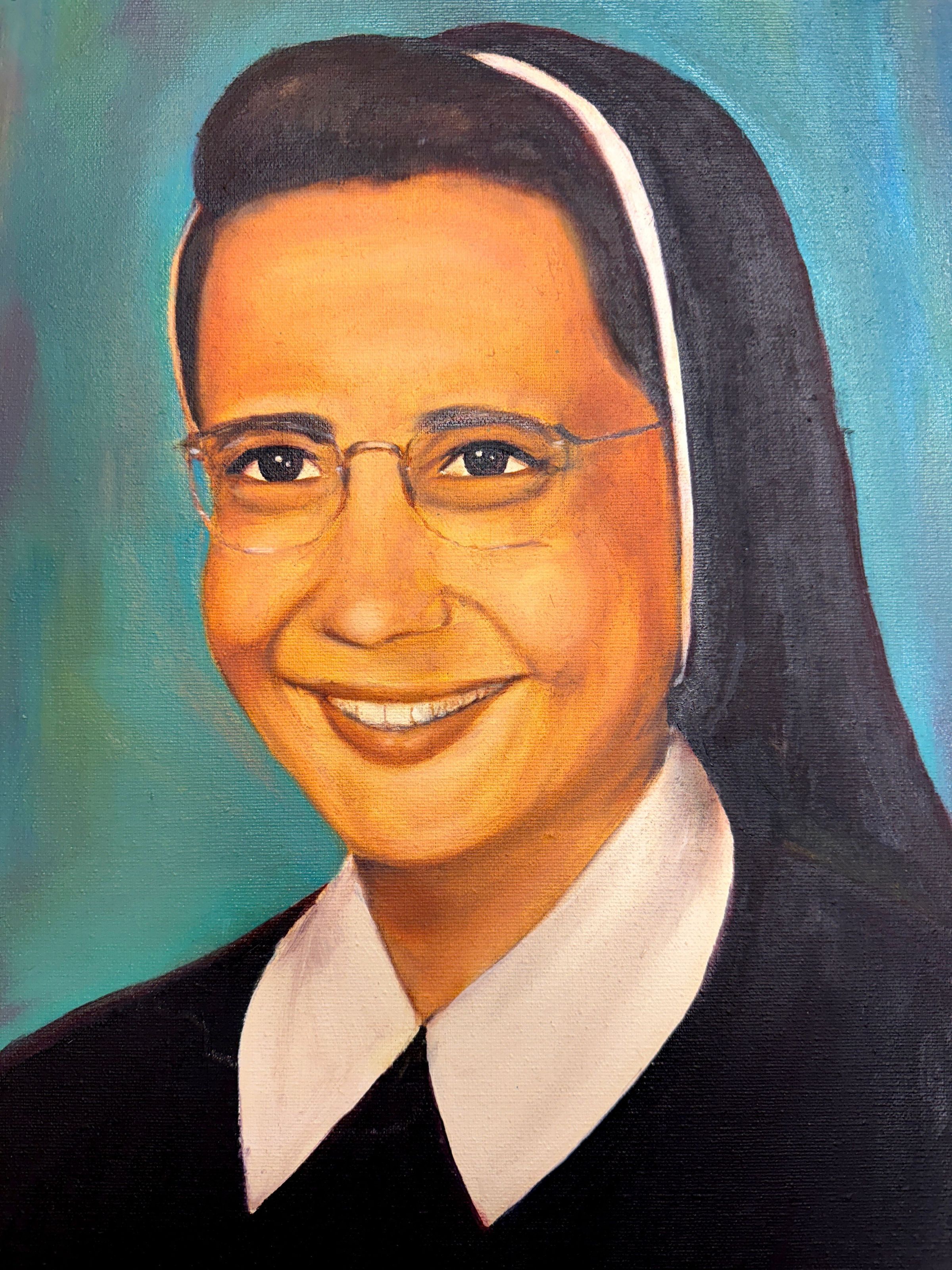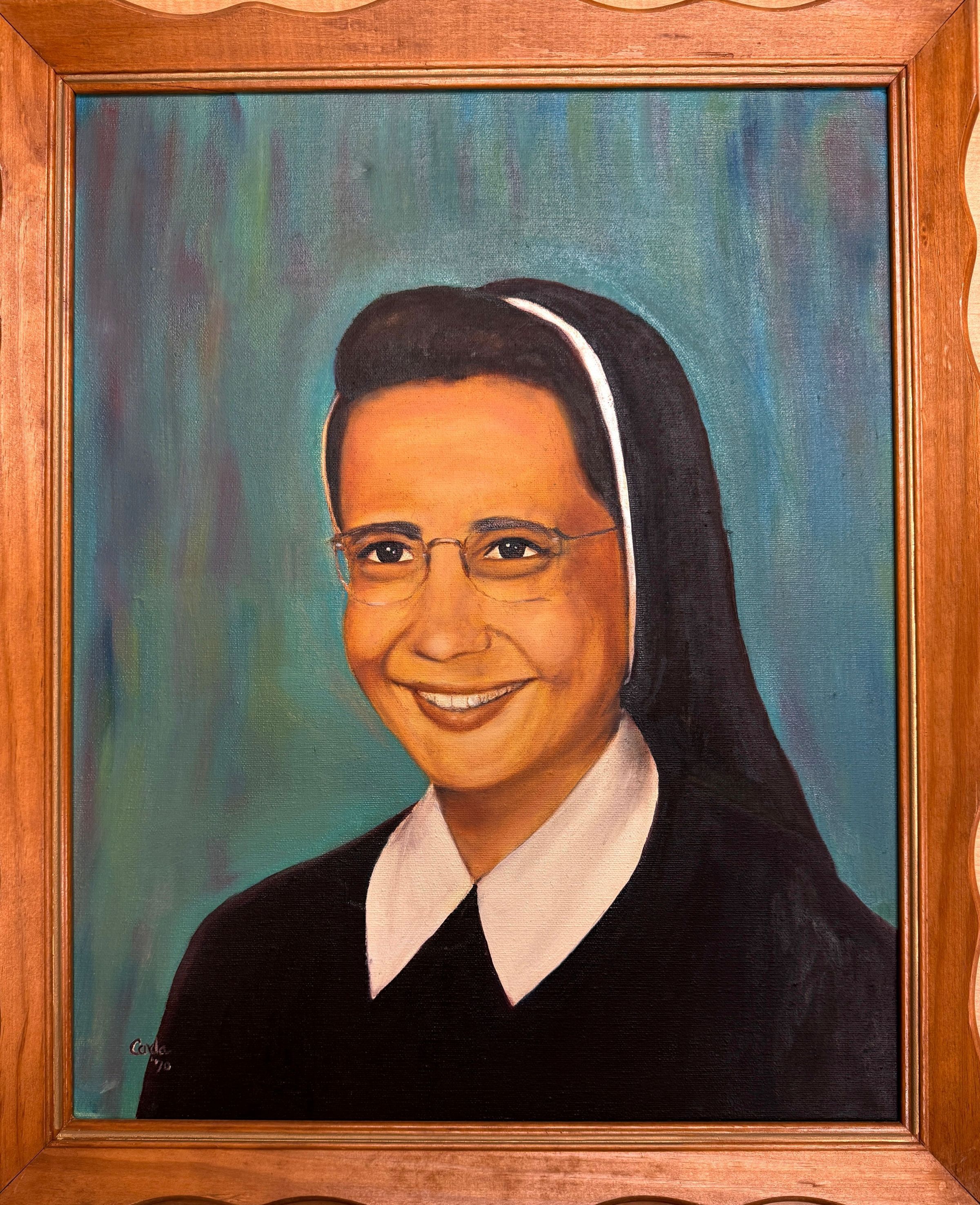 This oil on canvas portrait of Sister Juliana Fritz, CCVI (1934 – 1969) dates to 1970. It is signed by an artist named Carla, who has yet to be identified by Archives. As indicated by an inscription on the back of the fame, the family of Sister Juliana donated this portrait to the Congregation of the Sisters of Charity of the Incarnate Word (CCVI) in October 1981. This portrait, likely modeled after a headshot, depicts Sister from the shoulders up, smiling in front of a blue background with streaks of purple and green.