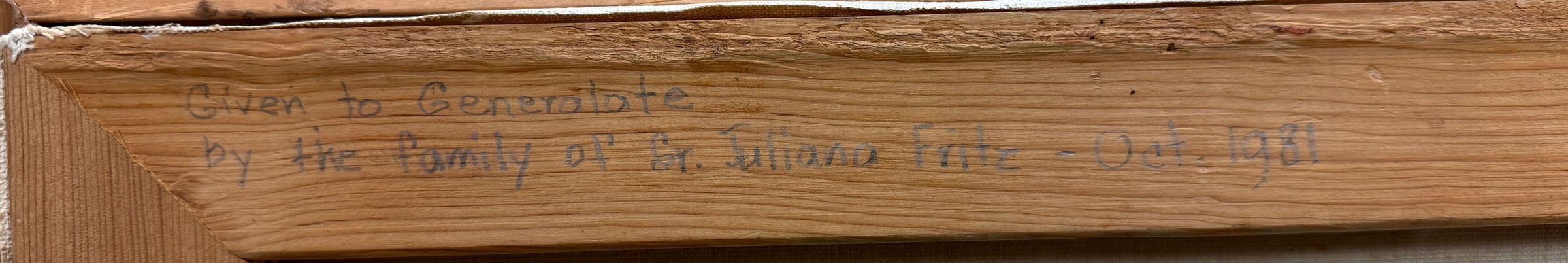 Este retrato al óleo sobre lienzo de Sor Juliana Fritz, CCVI (1934 - 1969) data de 1970. Está firmado por una artista llamada Carla, que aún no ha sido identificada por los Archivos. Como lo indica una inscripción en la parte posterior de la fama, la familia de Sor Juliana donó este retrato a la Congregación de las Hermanas de la Caridad del Verbo Encarnado (CCVI) en octubre de 1981. Este retrato, probablemente modelado a partir de un retrato de frente, muestra a la Hermana de los hombros para arriba, sonriendo frente a un fondo azul con vetas moradas y verdes.Type of Painting