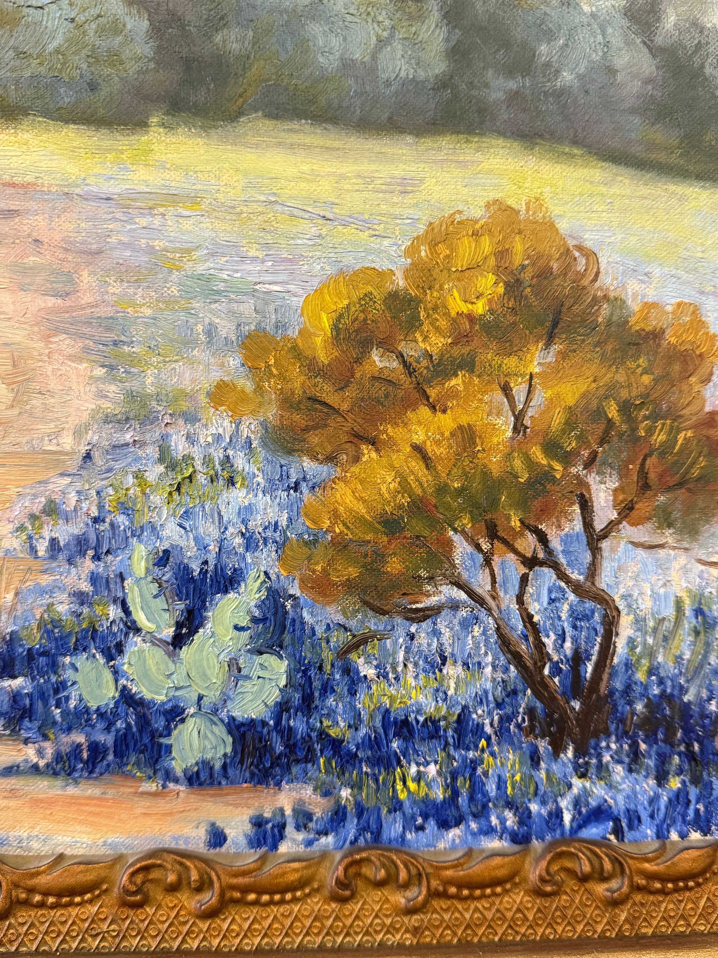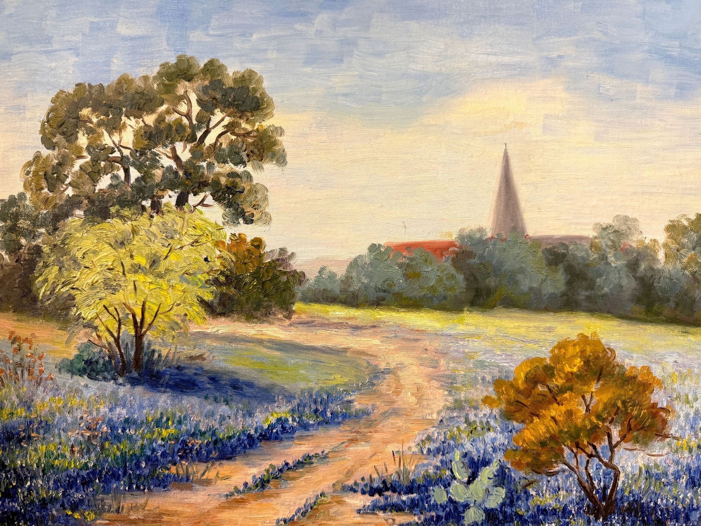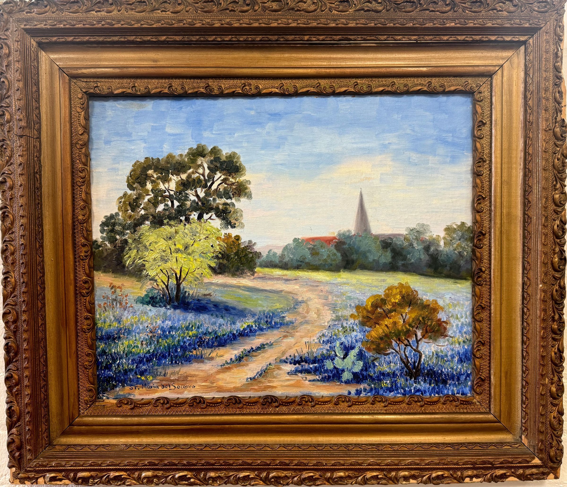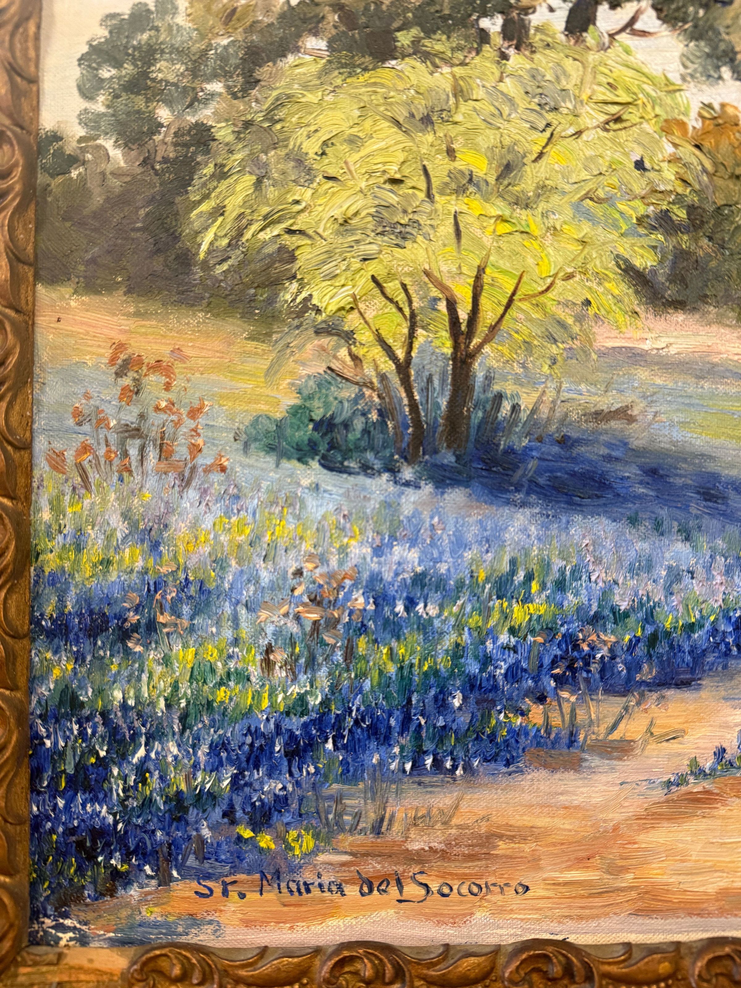 Title [assigned by archives]: Landscape with Bluebonnets and Church In a 1969 monograph on Sister Maria del Socorro Lazo, CCVI (1893 – 1956), Sister Anne Quinn, CCVI wrote, “Many have questioned Sister's preoccupation with bluebonnets in her paintings. This can readily be explained by the fact that before the campus had so many buildings, bluebonnets grew here lavishly. Sister and her students spent days painting them from all angles. She herself maintained that Texas itself was the source of her inspiration for most of her paintings. She loved Texas passionately and found an affinity with the state which somehow reflects itself in much of her paintings.” In this landscape painting, Sister María del Socorro foregrounded a field full of her beloved Texas bluebonnets. Several trees of varying green and brown shades rise above the flowers. A dirt path runs through the middle of the scene, winding its way back towards a red church hidden behind the trees. Título [asignado por los archivos]: Paisaje con bluebonnets y iglesia En una monografía de 1969 sobre Sor María del Socorro Lazo, CCVI (1893-1956), Sor Anne Quinn, CCVI escribió: «Muchos se han preguntado por qué la hermana se centraba tanto en los bluebonnets en sus pinturas. Esto se explica fácilmente por el hecho de que, antes de que el campus tuviera tantos edificios, los bluebonnets crecían aquí en abundancia. La hermana y sus alumnos pasaban días pintándolos desde todos los ángulos. Ella misma sostenía que Texas era la fuente de inspiración de la mayoría de sus pinturas. Amaba Texas apasionadamente y sentía una gran afinidad con el estado, lo que de alguna manera se refleja en muchas de sus pinturas». En esta pintura paisajística, la hermana María del Socorro puso en primer plano un campo lleno de sus queridas flores de Texas, las bluebonnets. Varios árboles de diferentes tonos de verde y marrón se elevan por encima de las flores. Un camino de tierra atraviesa el centro de la escena, serpenteando hacia una iglesia roja escondida detrás de los árboles.