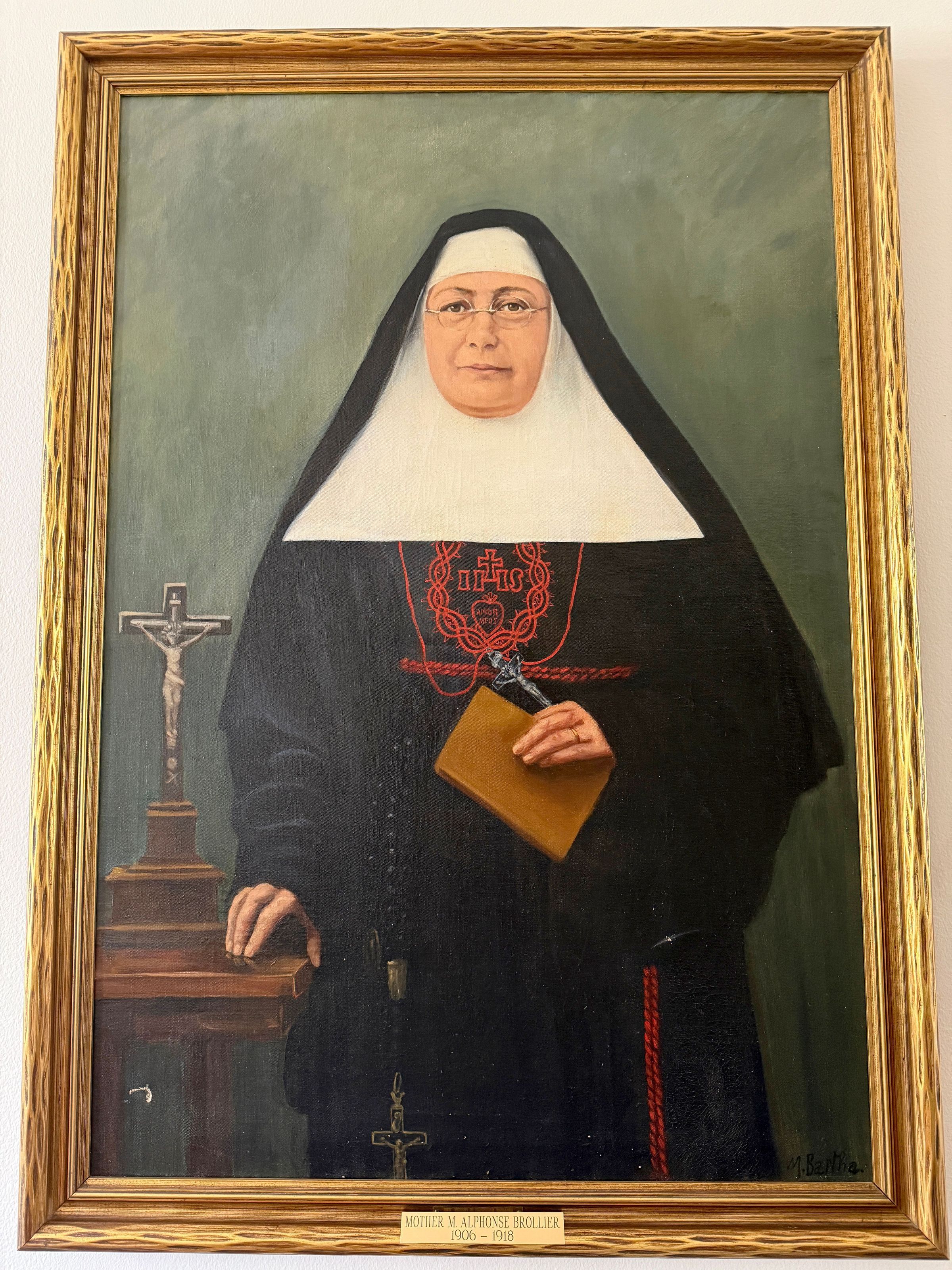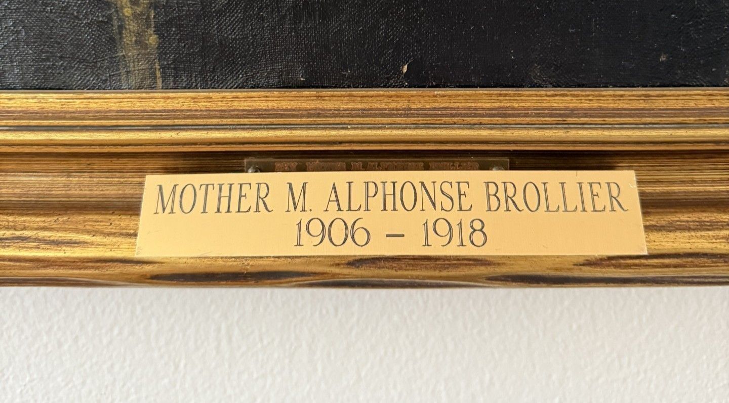 Title [assigned by artist]: Mother M. Alphonse Brollier 1906-1918 Mother M. Alphonse Brollier, CCVI (1858 - 1939) was born in Lyons, France on January 28, 1858. She entered the Sisters of Charity of the Incarnate Word (CCVI) Convent in 1878, took her first vows in 1880, and made her perpetual vows in 1885. In the 1880s, she served as the Superior at Santa Rosa Hospital and the Texas-Pacific Railroad Hospital in Marshall, Texas. She assumed the position of Generalate Treasurer at the CCVI Motherhouse in 1886 and, in 1906, she was appointed General Superior of the Congregation. She served in this role until 1918 and then became the Assistant General until 1930. Mother Alphonse passed away on March 6, 1939 in San Antonio. Madame Maria Bartha, a French-born portraitist, depicted Mother Alphonse Brollier in a ¾ length portrait. She wears the habit of the Sisters of Charity of the Incarnate Word, grasping her crucifix and a book in her left hand. Her right hand rests on a wooden table below a small crucifix. This painting is part of a portrait series that Madame Bartha painted of the CCVI General Superiors. Título [asignado por el artista]: Madre M. Alphonse Brollier 1906-1918 La Madre M. Alphonse Brollier, CCVI (1906 - 1918) nació en Lyon, Francia, el 28 de enero de 1858. Ingresó en el Convento de las Hermanas de la Caridad del Verbo Encarnado (CCVI) en 1878, hizo sus primeros votos en 1880 y los perpetuos en 1885. En la década de 1880, sirvió como Superiora en el Hospital Santa Rosa y en el Hospital del Ferrocarril Texas-Pacific en Marshall, Texas. Asumió el cargo de Tesorera General en la Casa Madre CCVI en 1886 y, en 1906, fue nombrada Superiora General de la Congregación. Desempeñó este cargo hasta 1918 y luego fue Asistente General hasta 1930. La Madre Alphonse falleció el 6 de marzo de 1939 en San Antonio. Madame Maria Bartha, retratista de origen francés, retrató a la Madre Alphonse Brollier en un retrato de ¾ de cuerpo. Viste el hábito de las Hermanas de la Caridad del Verbo Encarnado y sostiene un crucifijo y un libro en la mano izquierda. Su mano derecha descansa sobre una mesa de madera debajo de un pequeño crucifijo. Este cuadro forma parte de una serie de retratos que Madame Bartha pintó de las Superioras Generales CCVI.