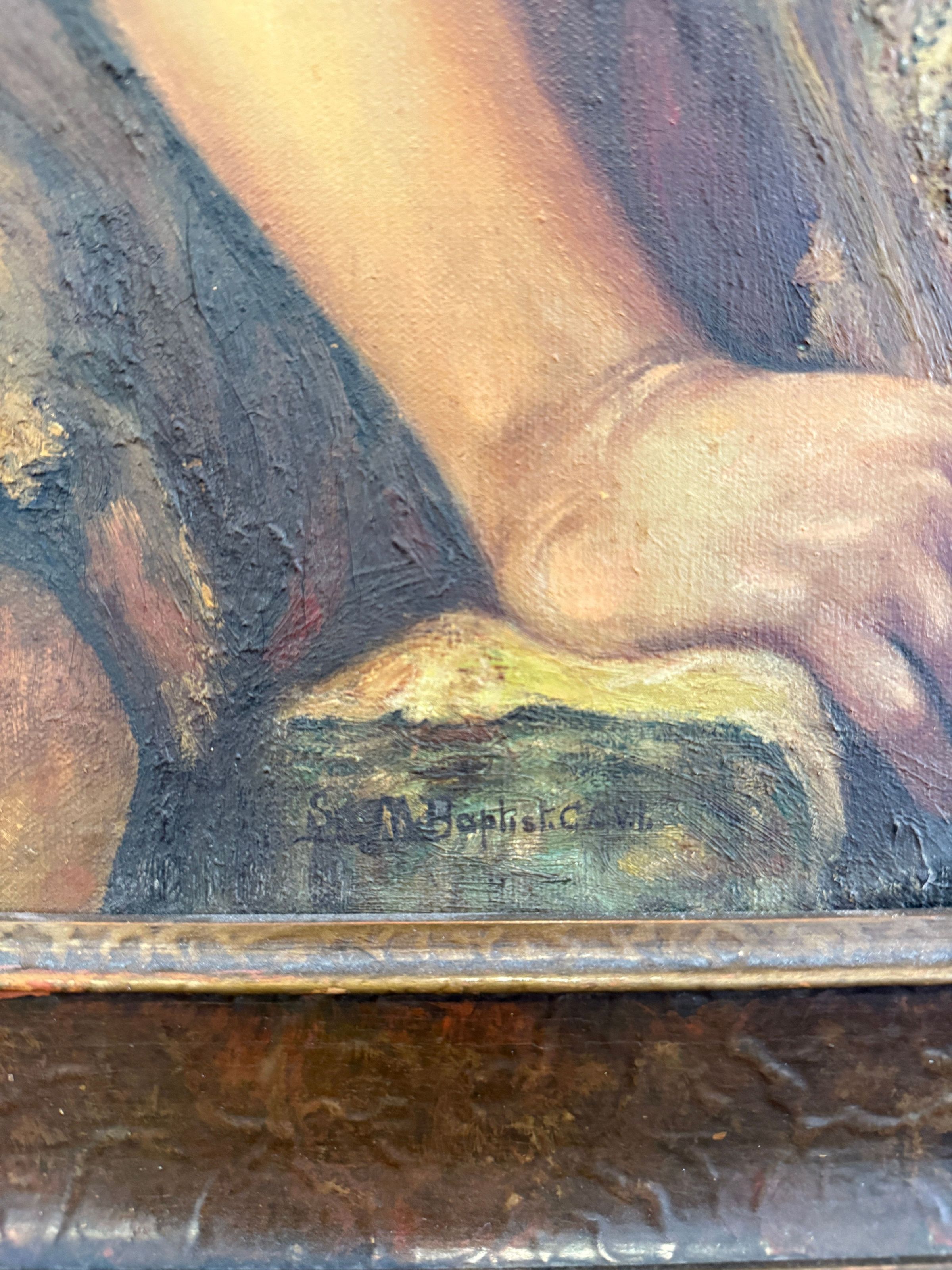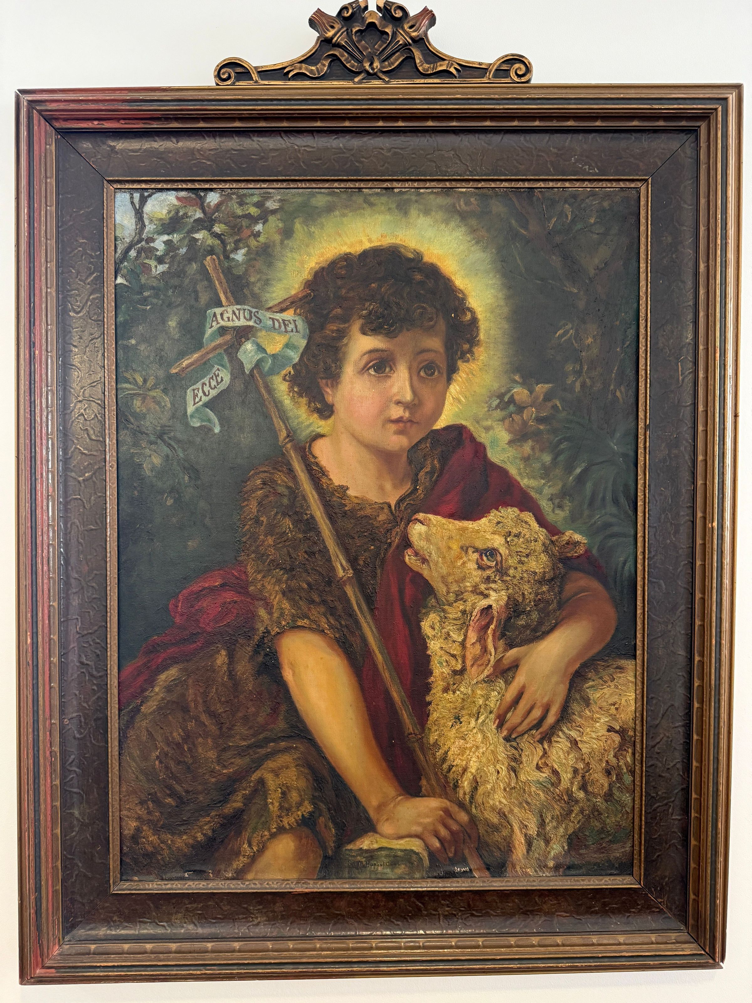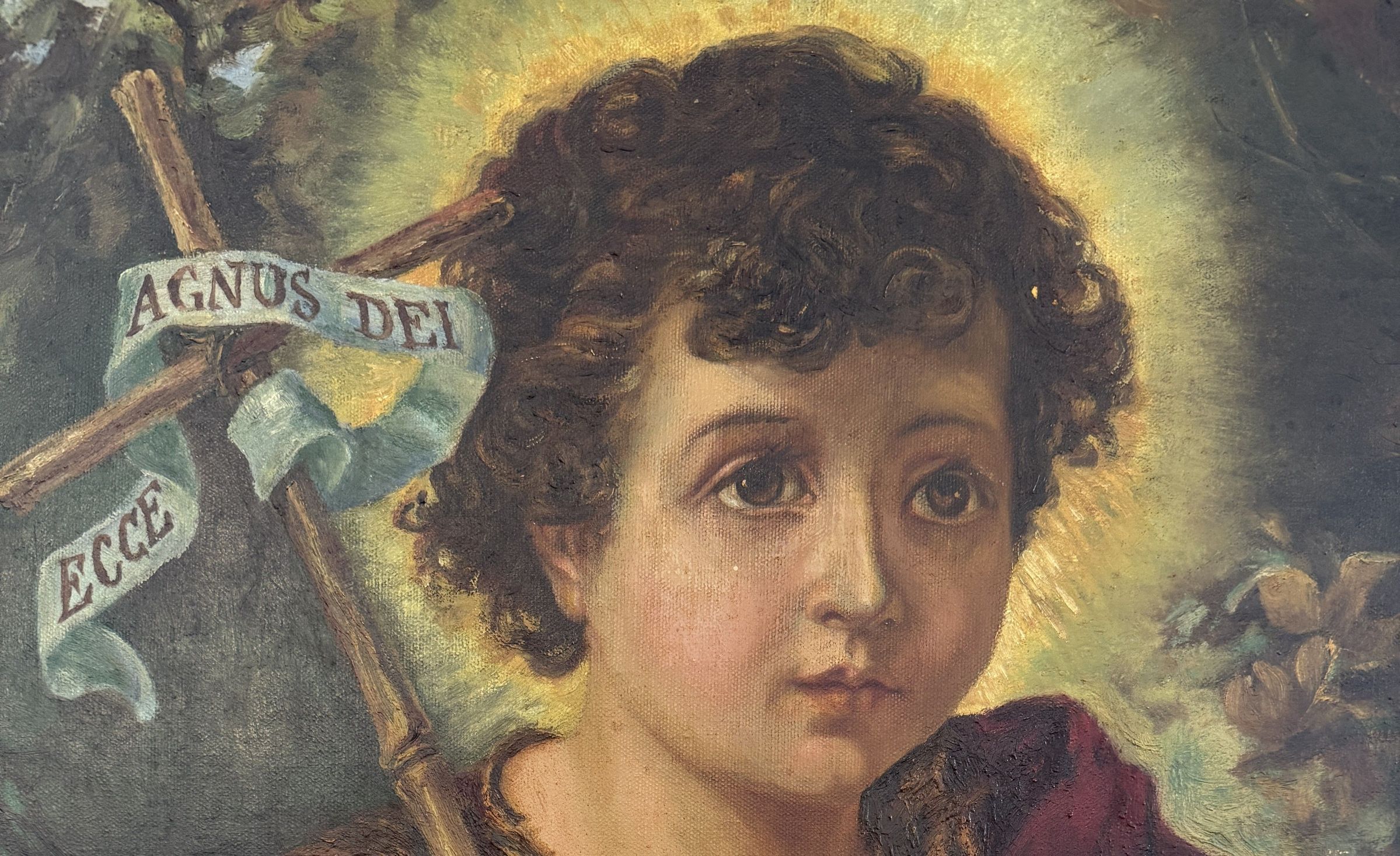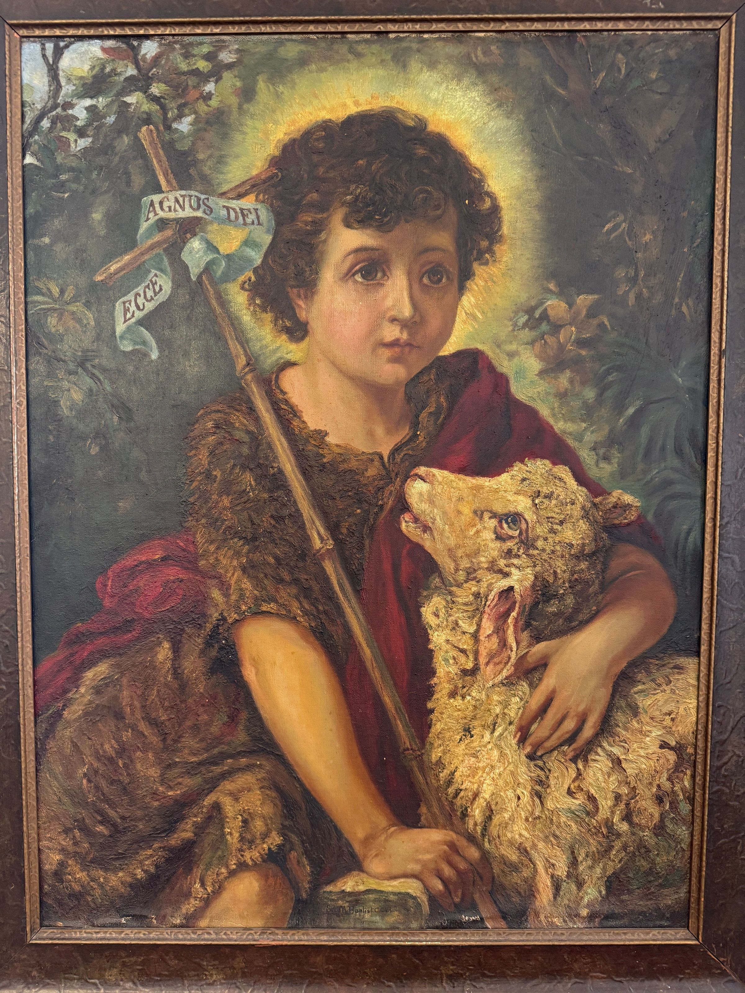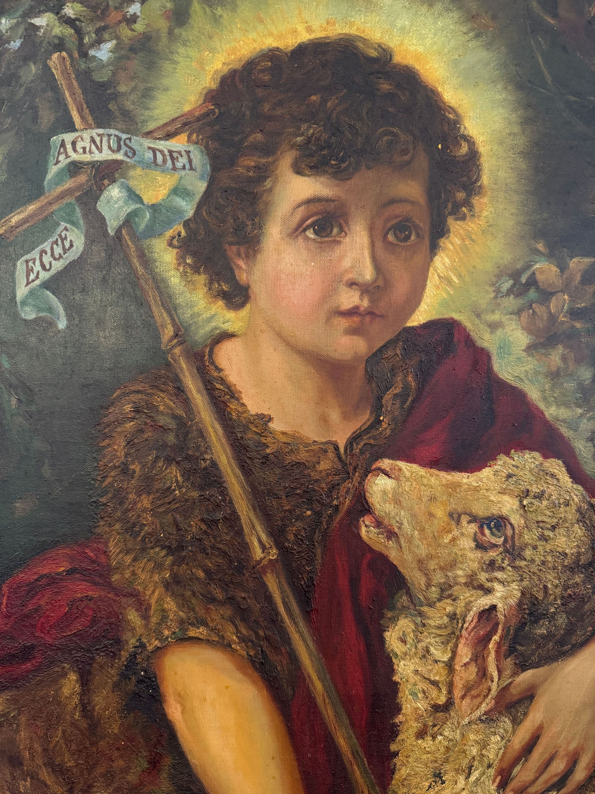 Sor Mary Baptist Courtney (1875-1939) representó a su homónimo, San Juan Bautista, en esta pintura, que es su única obra de arte documentada. San Juan Bautista aparece como un niño, con su cabello rizado rodeado de rayos de luz dorados. Sor Mary Baptist incluye los rasgos distintivos de la iconografía del santo: una túnica de pelo de camello, una cruz larga y un pergamino con la inscripción «Ecce Agnus Dei», «he aquí el Cordero de Dios». San Juan mira a lo lejos con el brazo alrededor de un cordero, que lo mira.Type of Painting