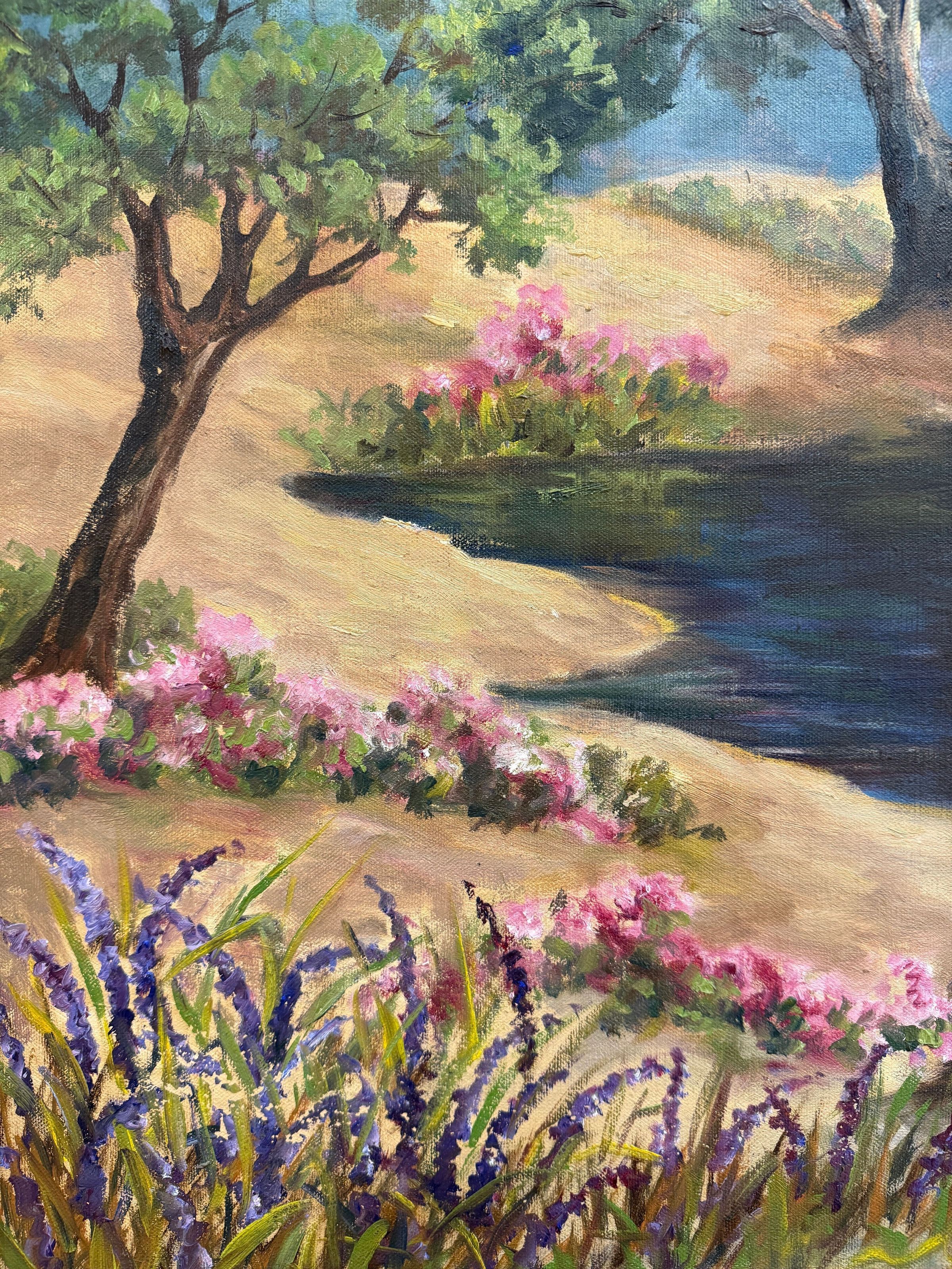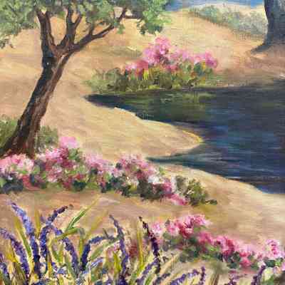 Title [assigned by archives]: Landscape with River and Cattails Sister María del Socorro Lazo Houston, CCVI (1893 – 1956) took much of her artistic inspiration from the natural world, as evidenced by her large oeuvre of landscape paintings. This painting depicts trees, wild lavender, and cattails growing along the banks of a river. This painting has no signature, but it is attributed to Sister Sister María del Socorro due to its stylistic similarity to her other landscape paintings. Título [asignado por los archivos]: Paisaje con río y espadañas Sor María del Socorro Lazo Houston, CCVI (1893 - 1956) se inspiró en gran medida en la naturaleza, como demuestra su amplia obra de paisajes. Este cuadro representa árboles, lavanda silvestre y espadañas que crecen a orillas de un río. Este cuadro no lleva firma, pero se atribuye a Sor María del Socorro por su similitud estilística con sus otros cuadros de paisajes.