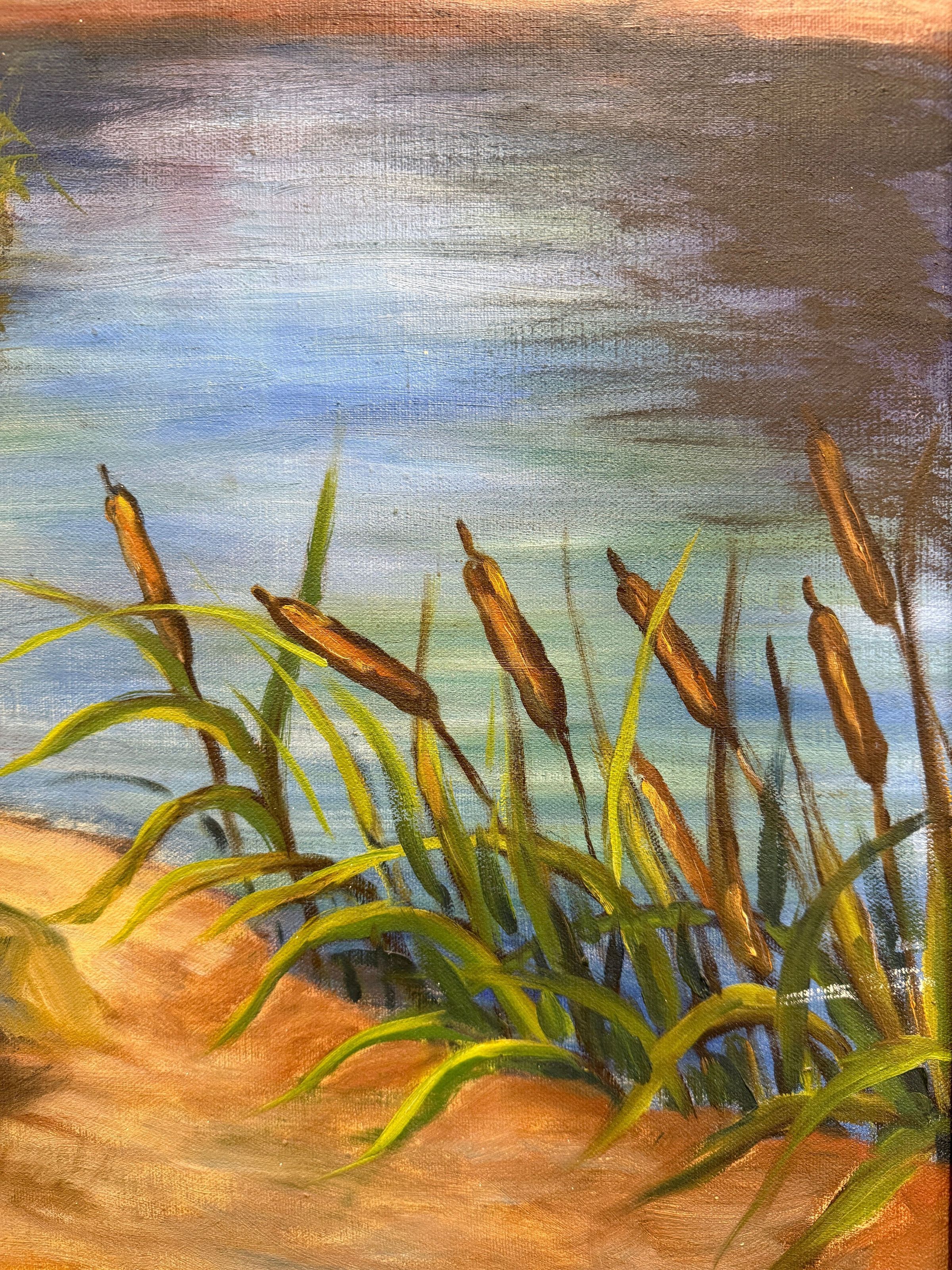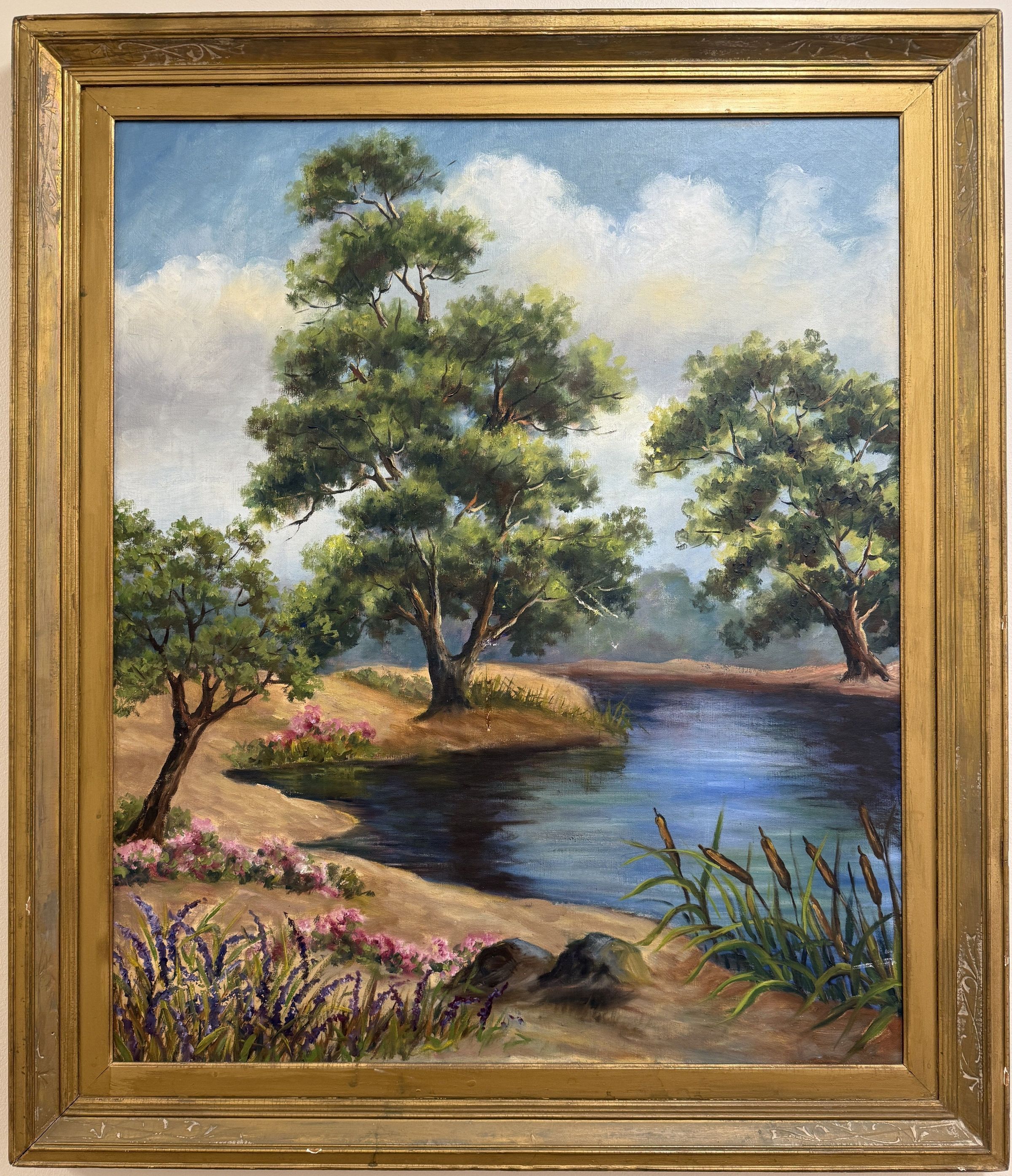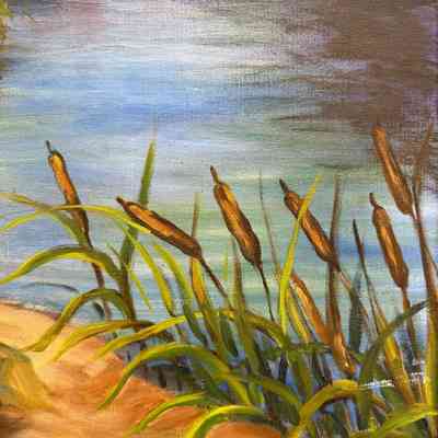Oil paintings, Landscape paintings, Rivers, Trees, Cat tails (Plant)
