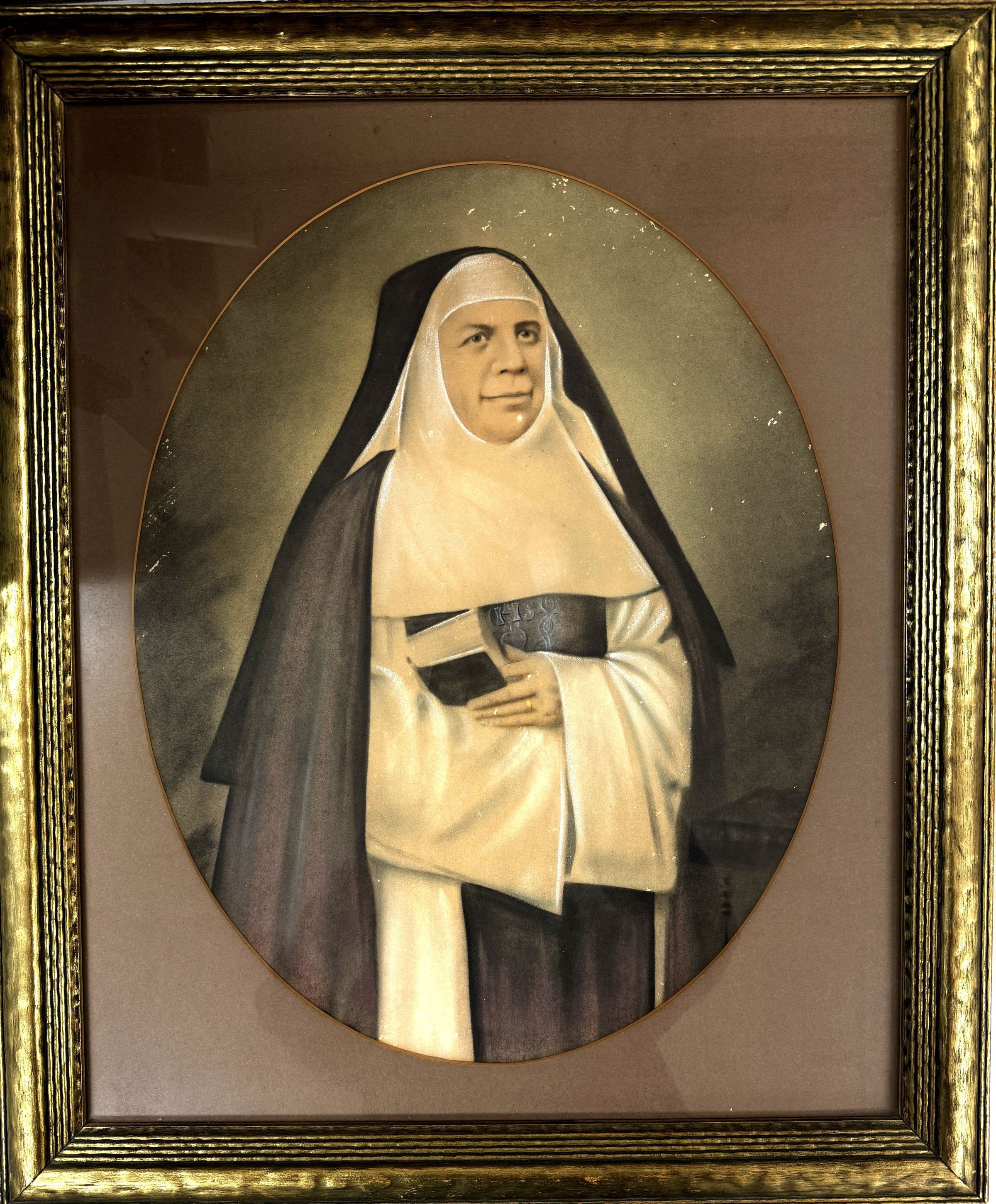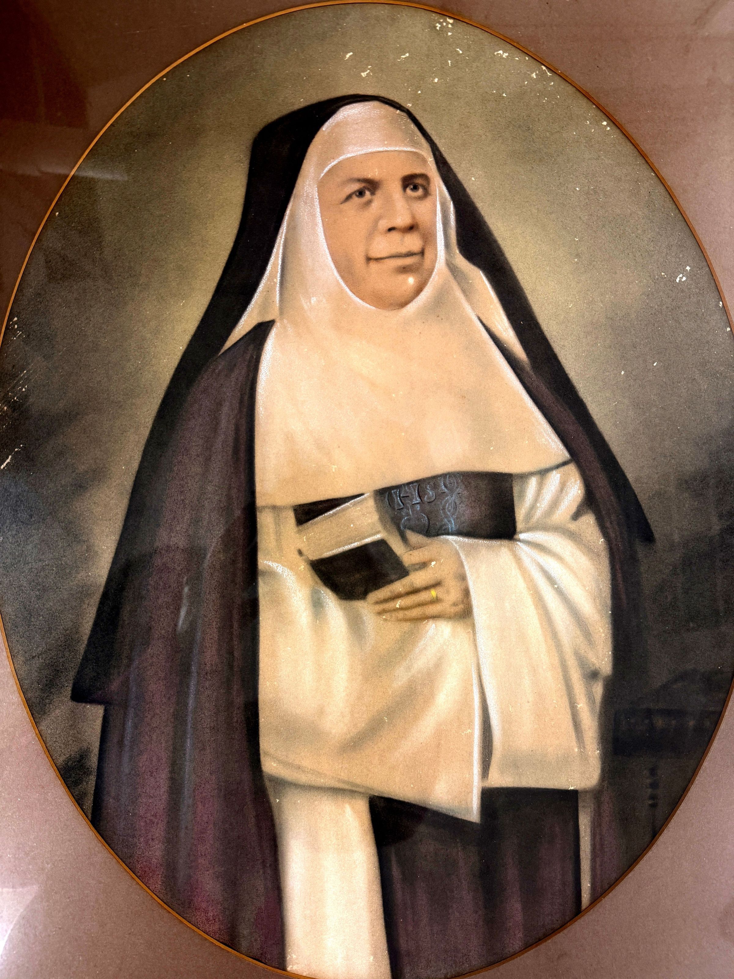 In this waist-level painted photograph, Mother Angelique Hiver (1802 - 1881) wears the habit of the Sisters of the Incarnate Word and Blessed Sacrament while holding a Bible in front of her chest.