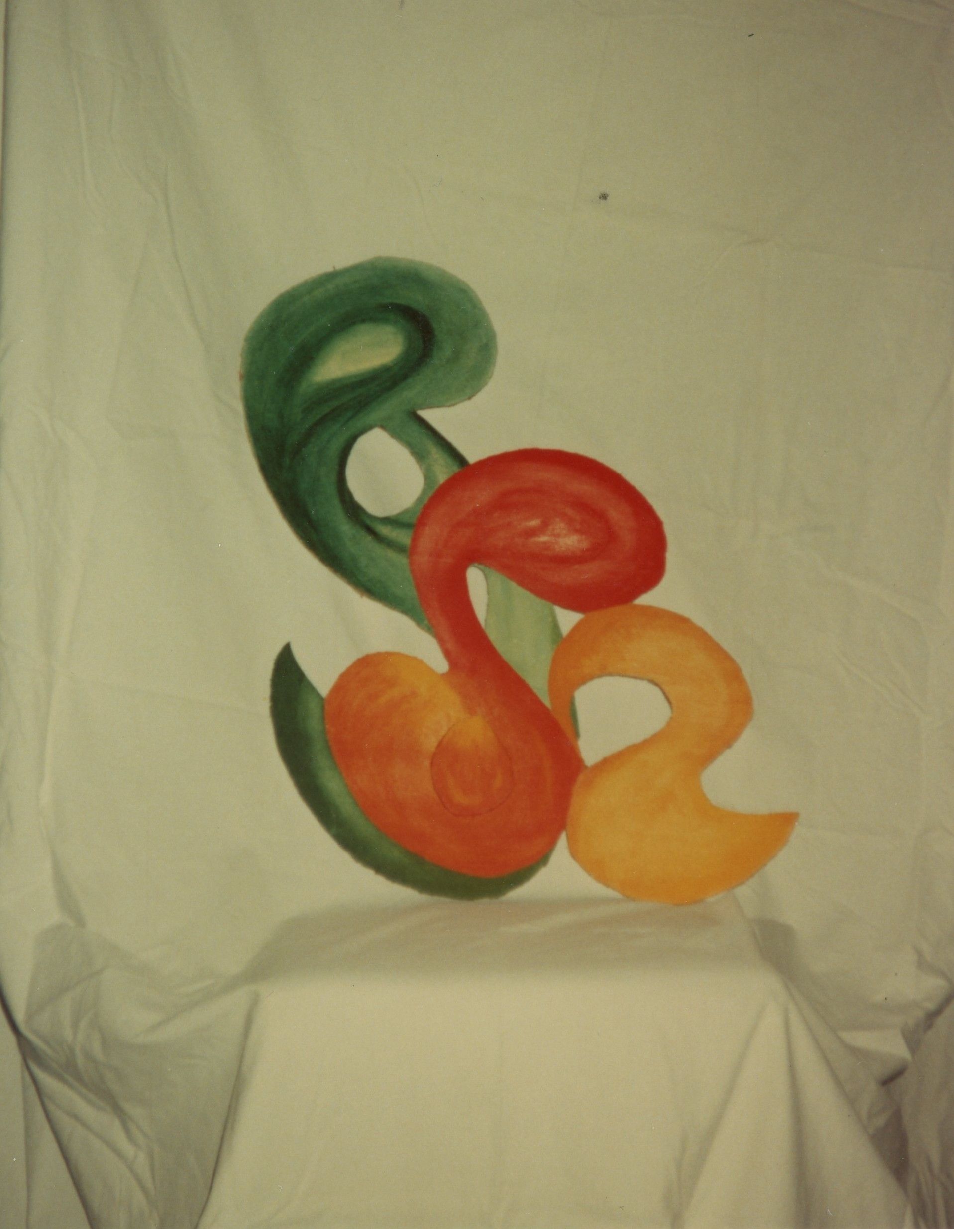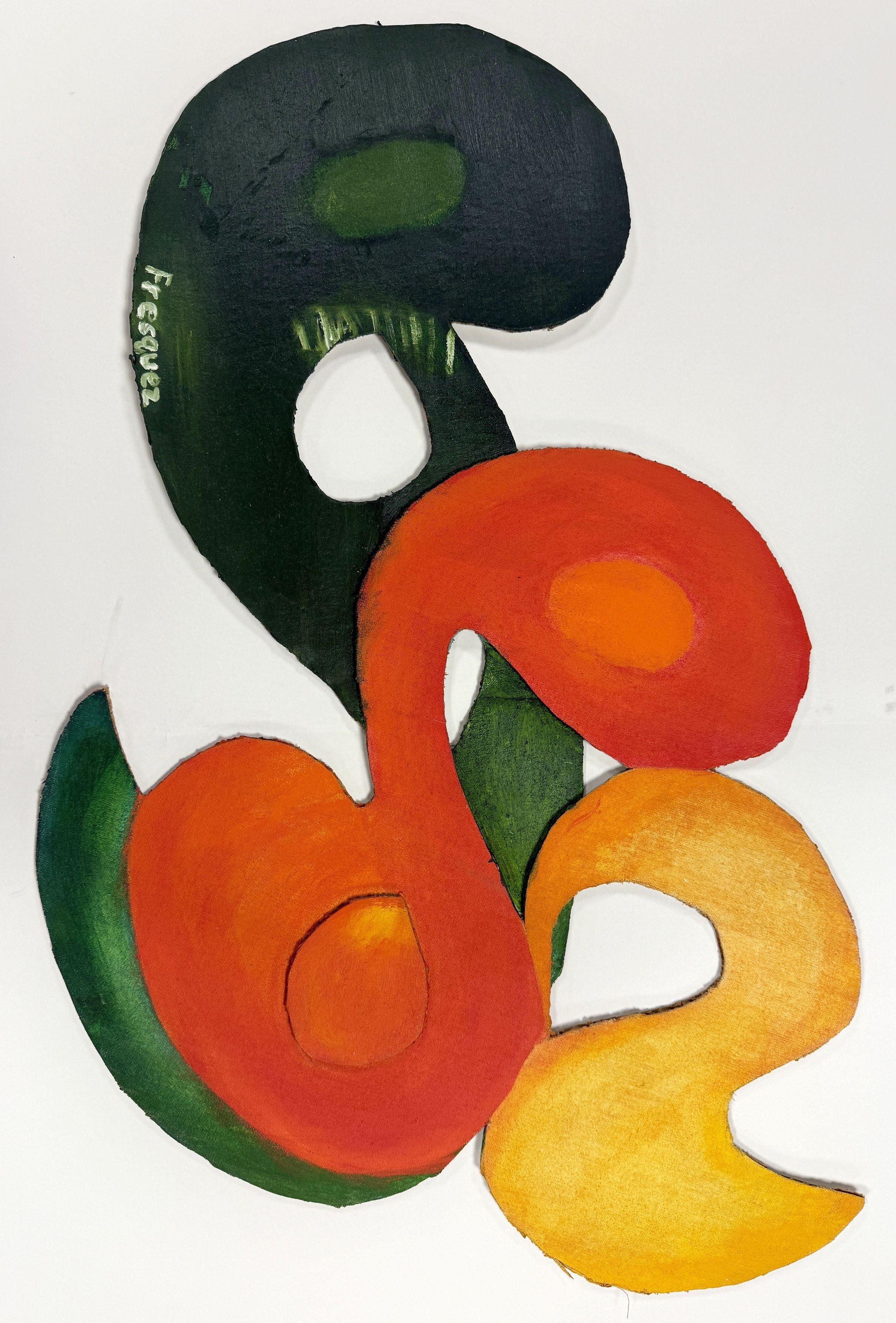Title [assigned by archives]: Abstract Swirls This March 1992 artwork by Sister Catalina Fresquez, CCVI (1937 – 2019) differs from her other works in its shape and medium. The piece consists of two layers: Sister made the top layer of orange and yellow shapes with cardboard covered by a layer of canvas. This piece is glue atop the green shape, which is made solely of painted cardboard. The use of layers and different materials lends textural variance to the work. An undated photograph of the piece indicates its correct orientation, with the green piece pointing upward. Título [asignado por archivo]: Remolinos Abstractos Esta obra de marzo de 1992 de Sor Catalina Fresquez, CCVI (1937-2019) se diferencia de sus otras obras por su forma y técnica. La pieza consta de dos capas: la Hermana realizó la capa superior de formas naranjas y amarillas con cartón cubierto por una capa de lienzo. Esta pieza está pegada sobre la forma verde, hecha únicamente de cartón pintado. El uso de capas y diferentes materiales aporta variación en la textura de la obra. Una fotografía sin fecha de la pieza indica su correcta orientación, con la pieza verde apuntando hacia arriba.