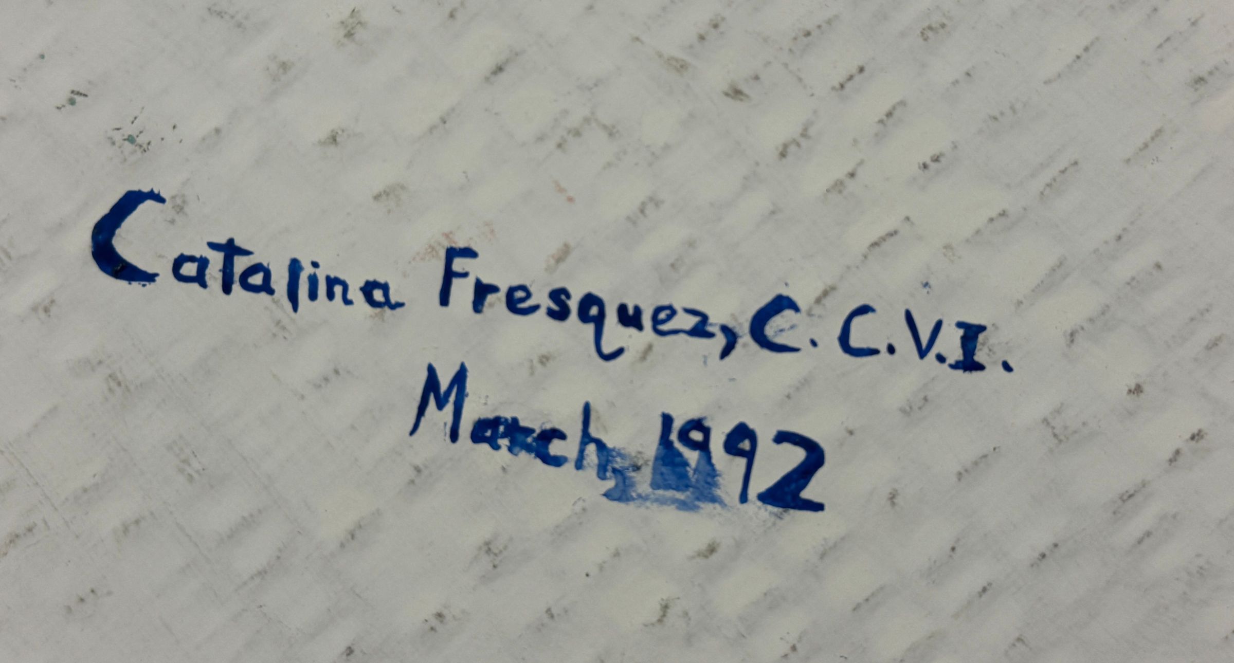 Sor Catalina Fresquez, CCVI, nació el 11 de febrero de 1937 en Socorro, Texas. Ingresó en la Congregación de las Hermanas de la Caridad del Verbo Encarnado (CCVI) en 1957, emitió sus primeros votos en 1960 y realizó su profesión perpetua en 1965. Recibió su licenciatura en Matemáticas en el Incarnate Word College en 1961 y comenzó su carrera como profesora de matemáticas y ciencias en la escuela secundaria. Obtuvo su maestría y doctorado en Zoología en la Universidad de Texas (maestría en 1969; doctorado en 1976). Se especializó en investigación genética y fue profesora de Biología en la Universidad de Brown, el Incarnate Word College, la Universidad Northwestern, la Universidad Barry y la Universidad Loyola Marymount. Sor Catalina dedicó la última parte de su carrera al ministerio parroquial antes de regresar a San Antonio para servir como Tesorera de las Hermanas CCVI de 2008 a 2012. Existe poca documentación sobre la obra artística de Sor Catalina. Sus pinturas datan principalmente de después de 1998, año en que Sor Catalina se tomó un año sabático en Washington, D.C. Aunque inicialmente se dedicó a la ciencia, Sor Catalina fue una artista prolífica en su etapa posterior. En 2025, los Archivos CCVI conservaban aproximadamente veinte de sus pinturas y varios bocetos; sin embargo, hay 19 pinturas documentadas que no se encuentran en posesión del archivo. Sor Catalina falleció el 1 de agosto de 2019 en San Antonio, Texas, dejando un legado de contribuciones tanto científicas como creativas.