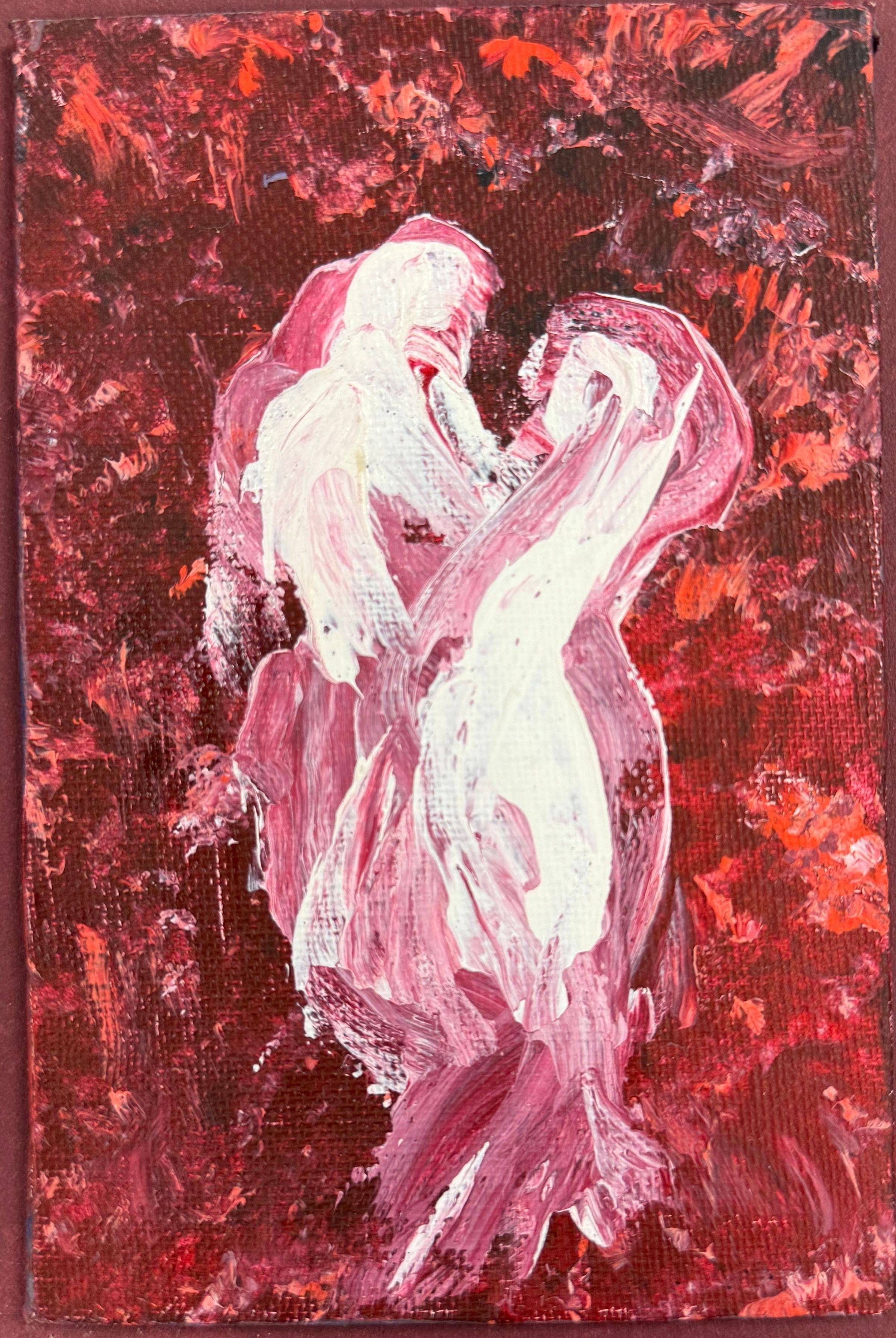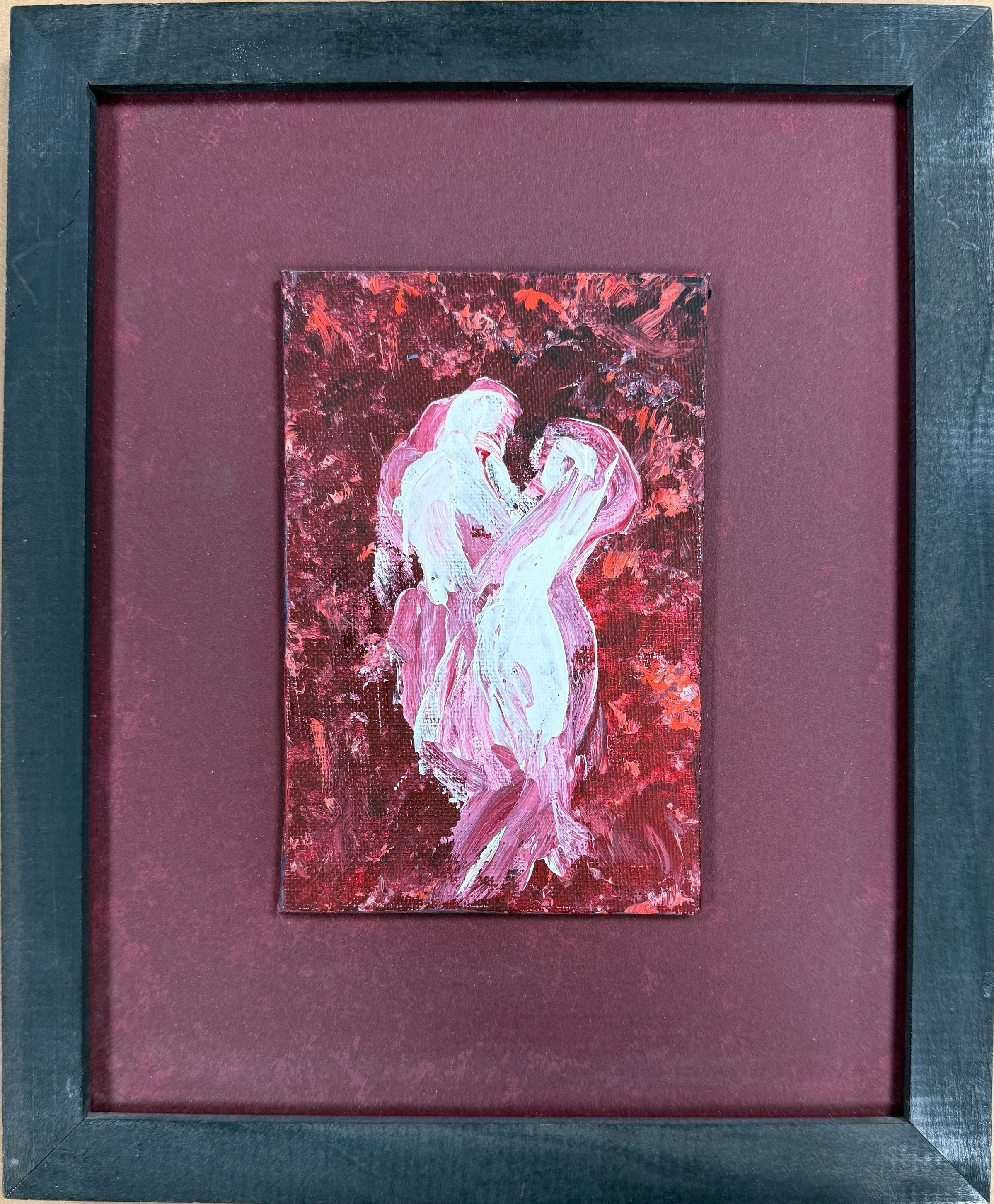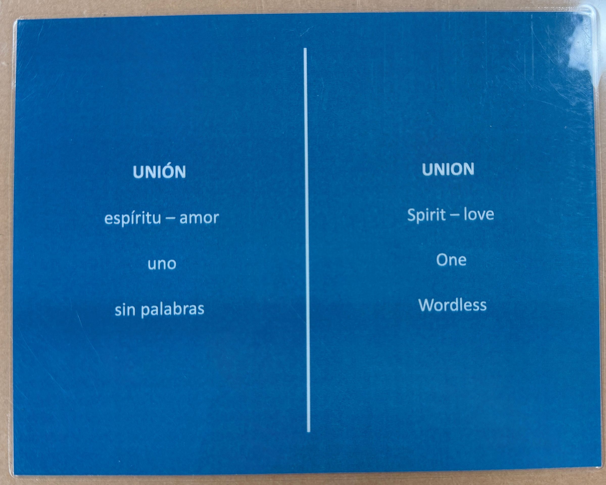 Title [assigned by artist]: VII - Union This painting is the seventh in a series of paintings and accompanying poems entitled, "Growth in the Spiritual Life: Life to Eternity." Sister Juanita Albracht, CCVI (1933 - ) created these works in May 1997 while on a month-long retreat at Lebh Shomea House of Prayer in Sarita, Texas. Of the retreat, Sister recounted, “The creative in me seemed to gush forth; hence, several poems were written and reflected upon during retreat. Usually the poetic words flowed from my quiet time in loving attention to the Lord, from my spiritual reading or reading of scripture.” In this series, she took inspiration from the 1986 book, “The Spiritual Journey: Critical Thresholds and Stages of Adult Spiritual Genesis” by Father Francis Kelly Nemeck, O.M.I. and Marie Theresa Coombs. “Union” by Sister Juanita Albracht, CCVI: Spirit – love One Wordless /////////////////////////////// Título [asignado por el artista]: VII - Unión Esta pintura es la séptima de una serie de pinturas y poemas que la acompañan titulada "Crecimiento en la vida espiritual: Vida para la eternidad". La Hermana Juanita Albracht, CCVI (1933-), creó estas obras en mayo de 1997 durante un retiro de un mes en la Casa de Oración Lebh Shomea en Sarita, Texas. Sobre el retiro, la Hermana relató: "La creatividad en mí parecía brotar; por lo tanto, escribí varios poemas y reflexioné sobre ellos durante el retiro. Por lo general, las palabras poéticas fluían de mis momentos de quietud, en amorosa atención al Señor, de mi lectura espiritual o de las Escrituras". Para esta serie, se inspiró en el libro de 1986, "El viaje espiritual: Umbrales críticos y etapas de la génesis espiritual adulta", del Padre Francis Kelly Nemeck, O.M.I. y Marie Theresa Coombs. “Unión” de la Hermana Juanita Albracht, CCVI: Espíritu – amor Uno Sin palabras