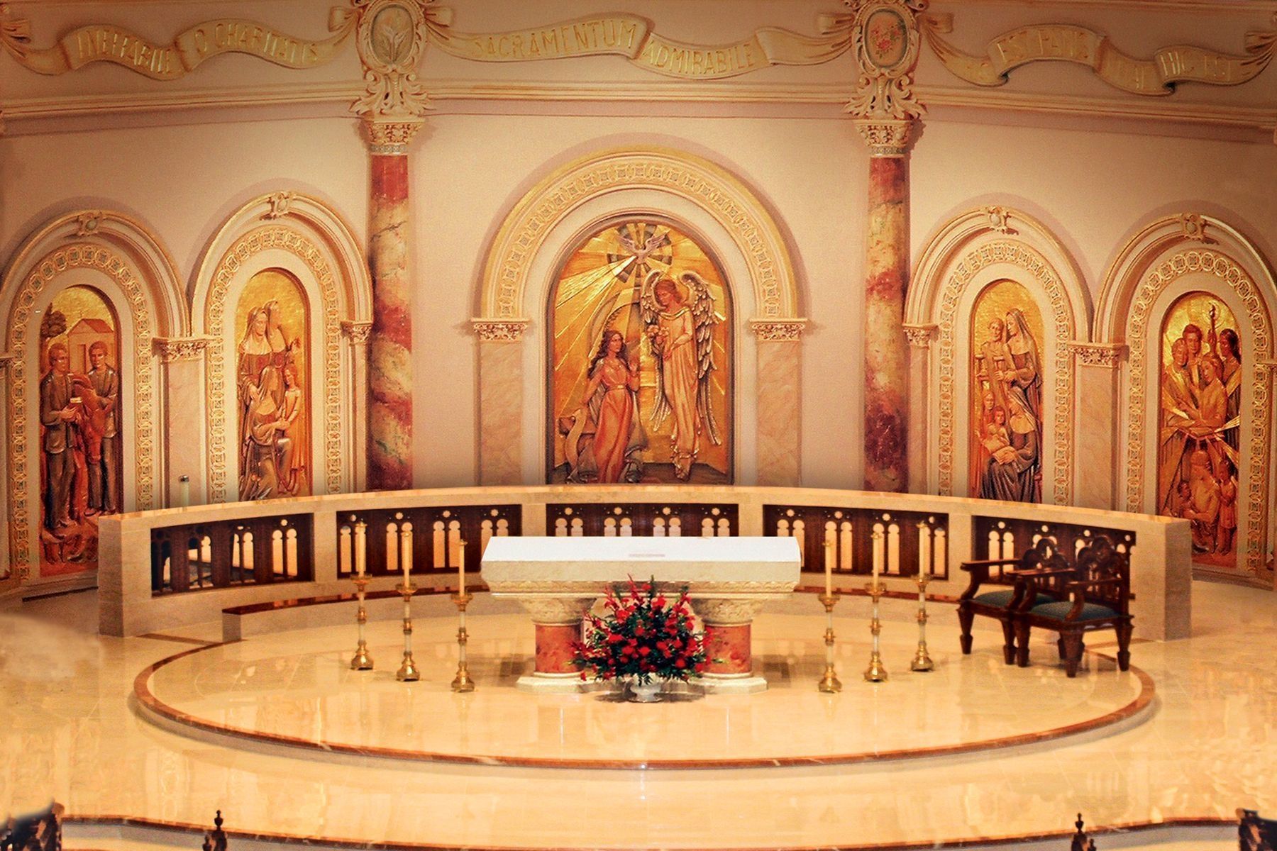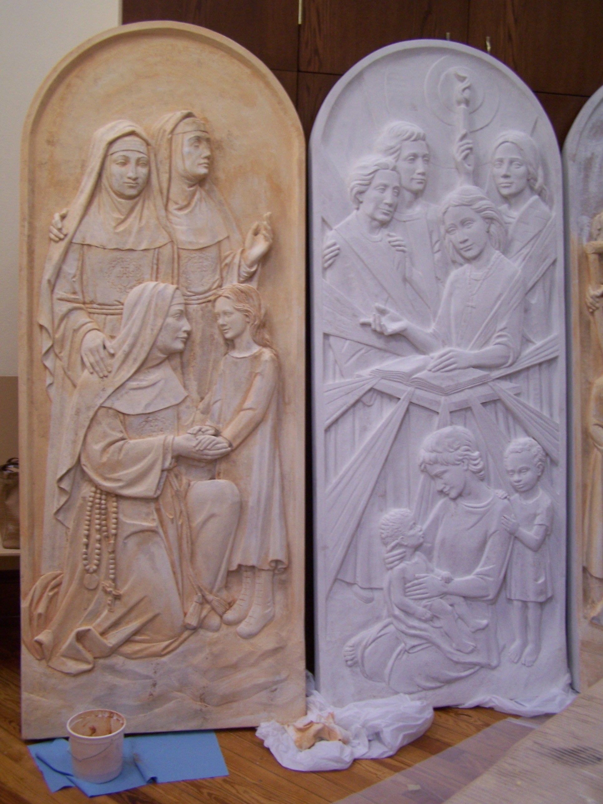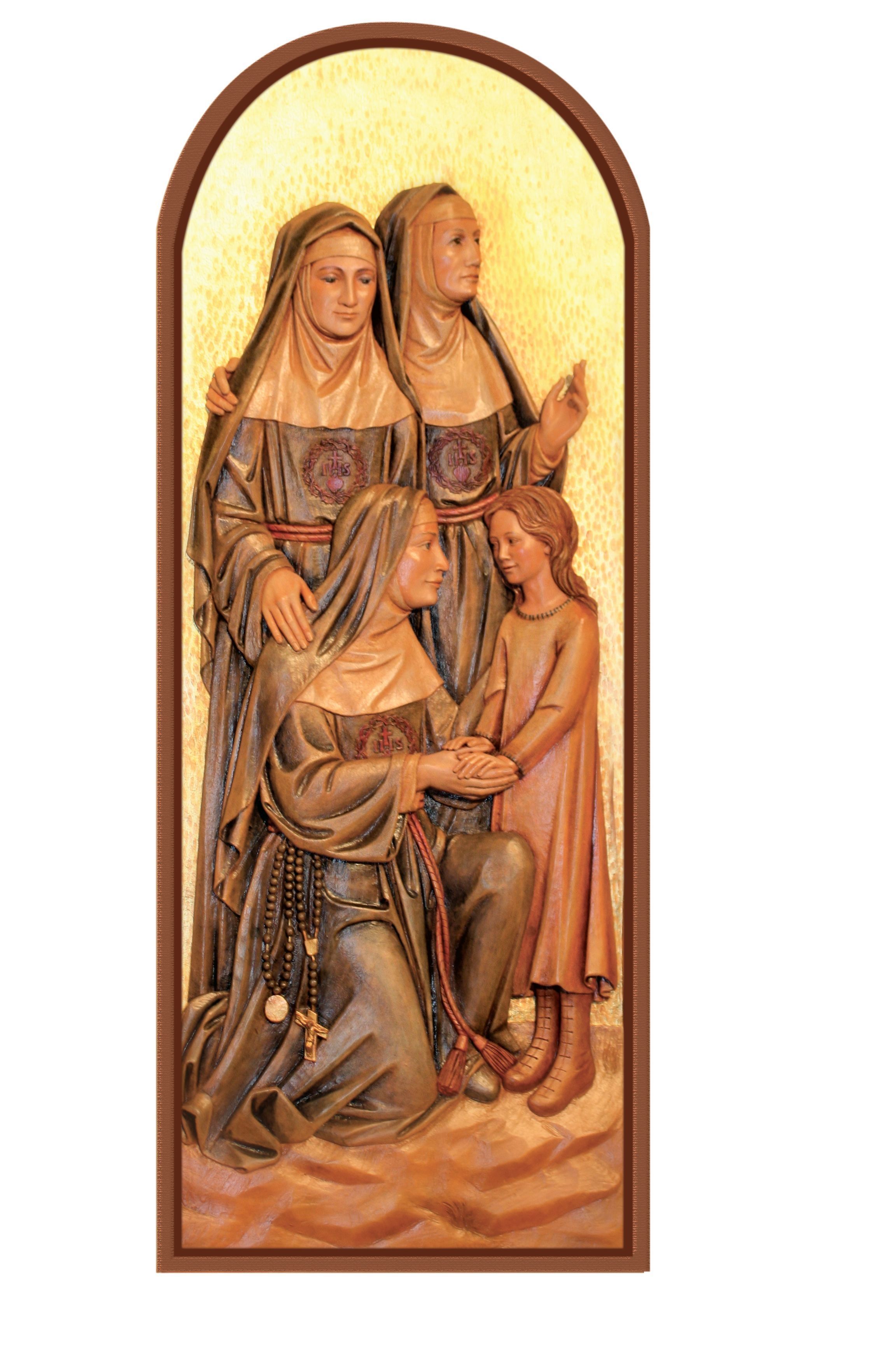 Estas tallas de nichos en bajorrelieve representan el pasado, el presente y el futuro de la Congregación de las Hermanas de la Caridad del Verbo Encarnado (CCVI). Fueron encargadas como parte de la renovación de la capilla en 2006-2007, que coincidió con el centenario de la inauguración de la capilla en 1907. Las tallas están colocadas en nichos detrás del altar y sirven de fondo para las celebraciones litúrgicas.