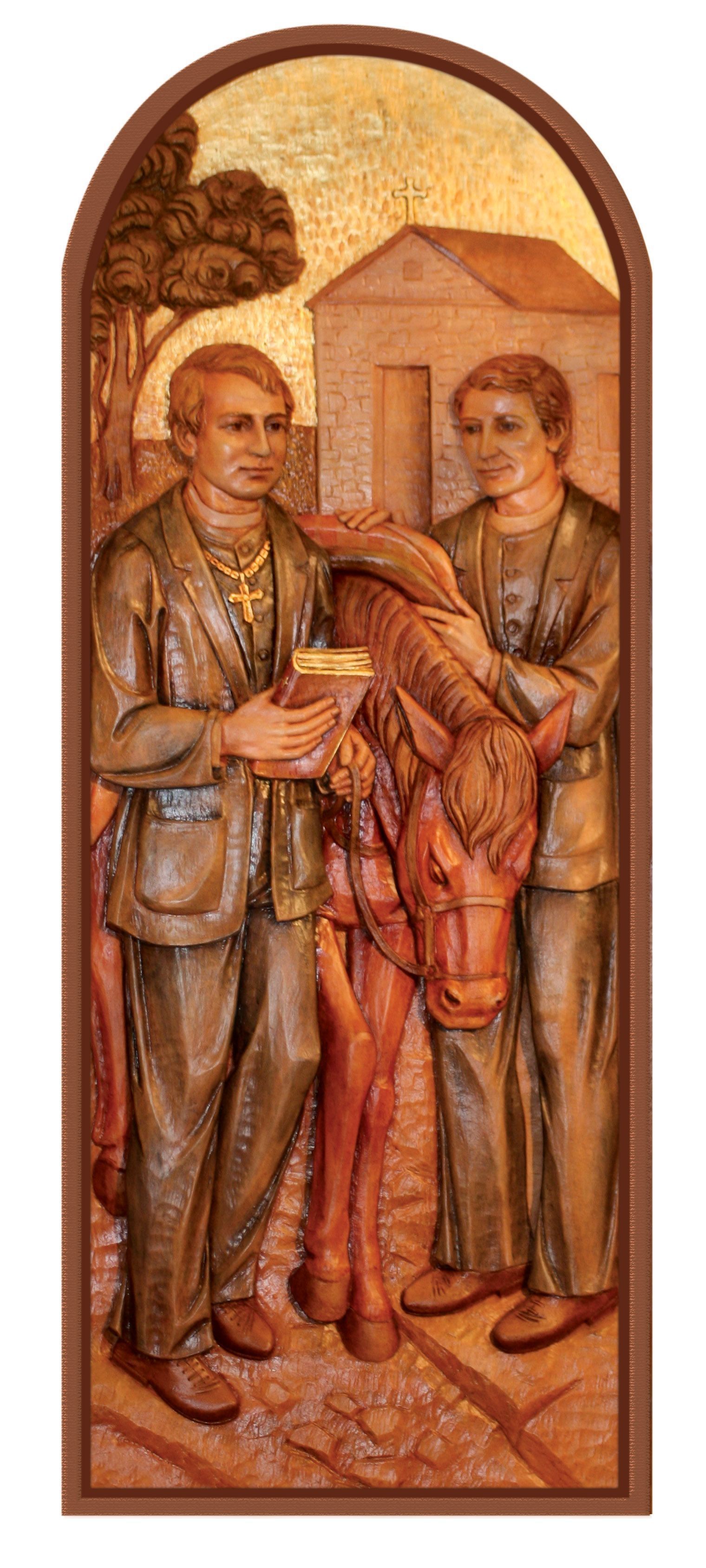 Artist Renate Rohn designed and painted the carvings. Using Rohn’s designs, Woodcrafter Edmund Rabanser carved the reliefs from German linden wood in his studio in Ortisei, Italy. From left to right, the niches depict the following: