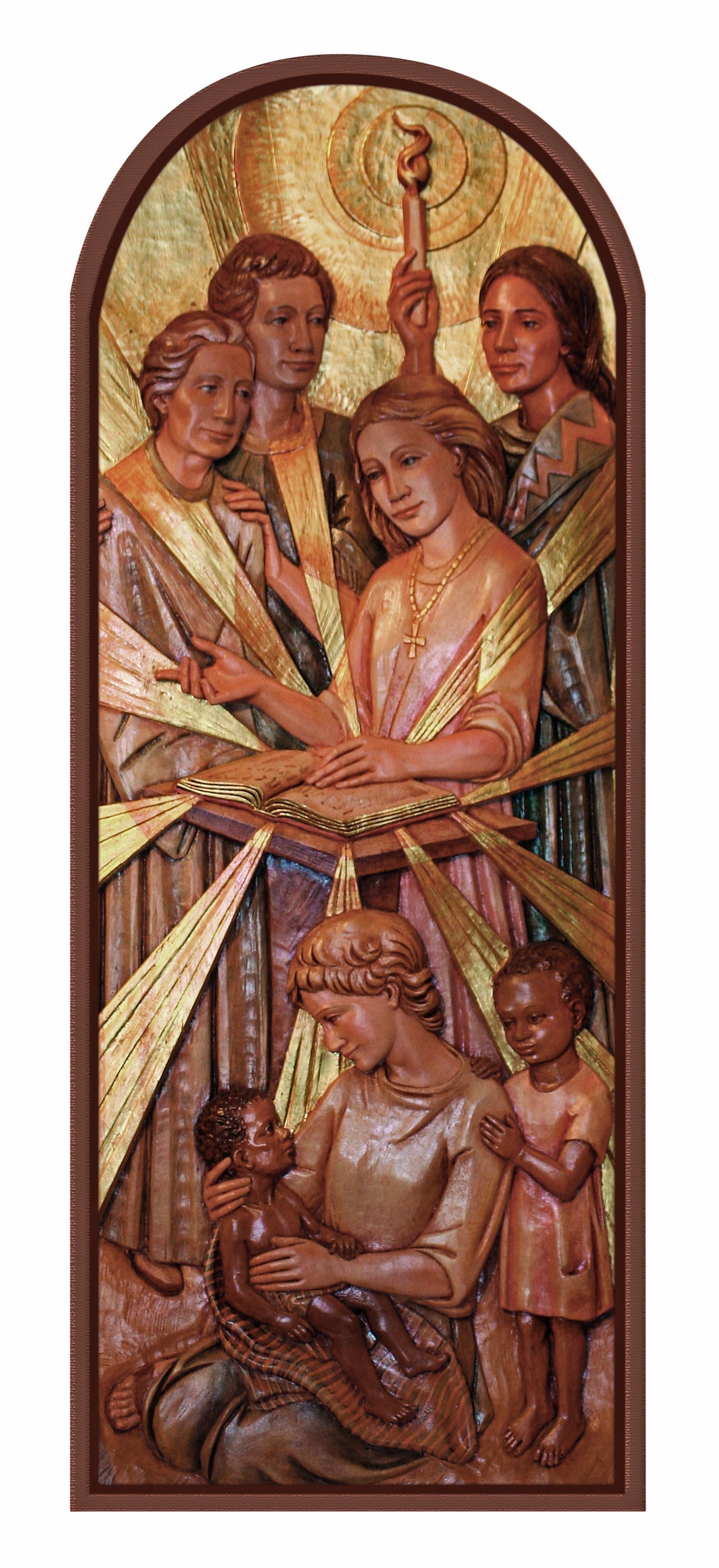 5) La Palabra de Dios, representada por el Libro de los Evangelios, envía a las Hermanas de la Caridad del Verbo Encarnado, a los asociados, a los misioneros y a los comisionados a la misión.Type of Sculpture