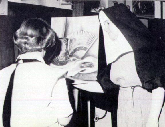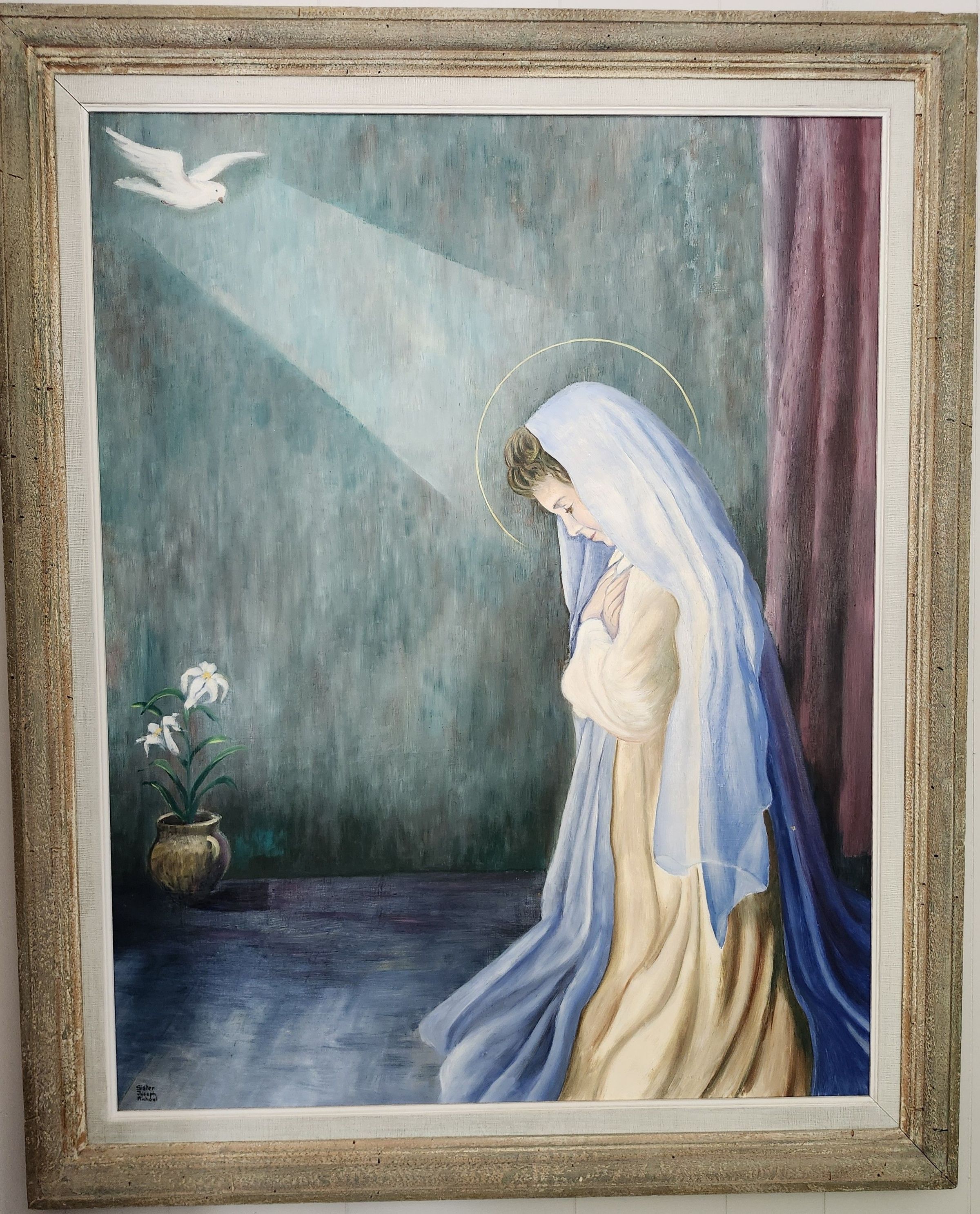 La hermana Joseph Michael Schwind, CCVI (1911-1995) representó a María como una niña, arrodillada y recibiendo el mensaje del Espíritu Santo de que será la madre de Cristo. La hermana Joseph Michael nació el 9 de mayo de 1911 en Perry, Nueva York. Ingresó en la Congregación en 1927, tomó sus primeros votos en 1929 y hizo su profesión perpetua en 1935. Ejerció su misión en numerosas escuelas, principalmente como profesora de música, en Texas, Misuri y Luisiana hasta su salida de la CCVI en 1969. Falleció en Amarillo el 28 de septiembre de 1995 y está enterrada en el cementerio Fairview de Pampa, Texas.Type of Painting