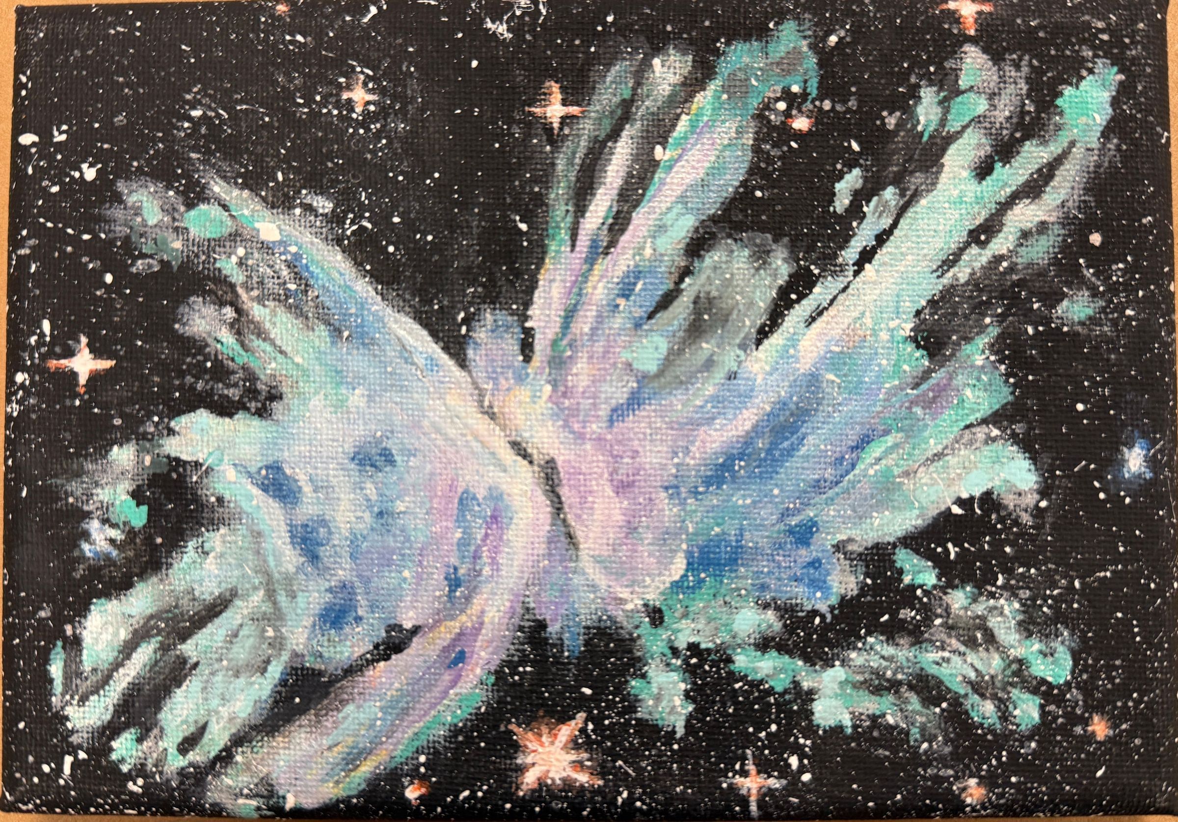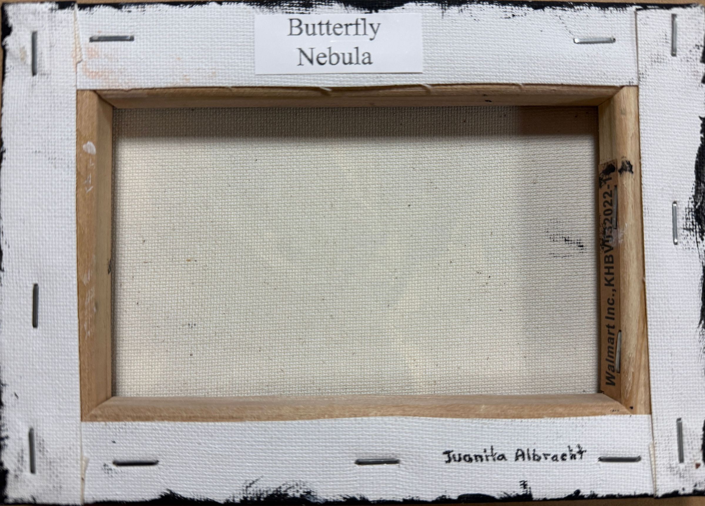 Title [assigned by artist]: Butterly Nebula This painting of the Butterfly Nebula is part of a series of paintings of the cosmos by Sister Juanita Albracht, CCVI (1933 - ). Sister Juanita wrote, “The Butterfly Nebula is known as MGC 6302 or IC 1318. It consists of the remnants of a dying star that is estimated as having 55 X the mass of the sun. The Butterfly Nebula gets its name from the gases spouting out of the center, forming what looks like wings. The Butterfly Nebula is 3,800 Light years away for the Earth. According to NASA the Nebula con be found in the Constellations of Scorpius or Monoceros. This gas is traveling through space at a speed of 600,000 miles per hour.” Título [asignado por el artista]: Nebulosa de la Mariposa Esta pintura de la Nebulosa de la Mariposa forma parte de una serie de pinturas del cosmos de la Hermana Juanita Albracht, CCVI (1933-). La Hermana Juanita escribió: «La Nebulosa de la Mariposa se conoce como MGC 6302 o IC 1318. Está formada por los remanentes de una estrella moribunda cuya masa se estima en 55 veces la del Sol. Recibe su nombre de los gases que emanan de su centro, formando lo que parecen alas. La Nebulosa de la Mariposa se encuentra a 3.800 años luz de la Tierra. Según la NASA, la nebulosa se puede encontrar en las constelaciones de Escorpio o Monoceros. Este gas viaja por el espacio a una velocidad de 967.000 kilómetros por hora».