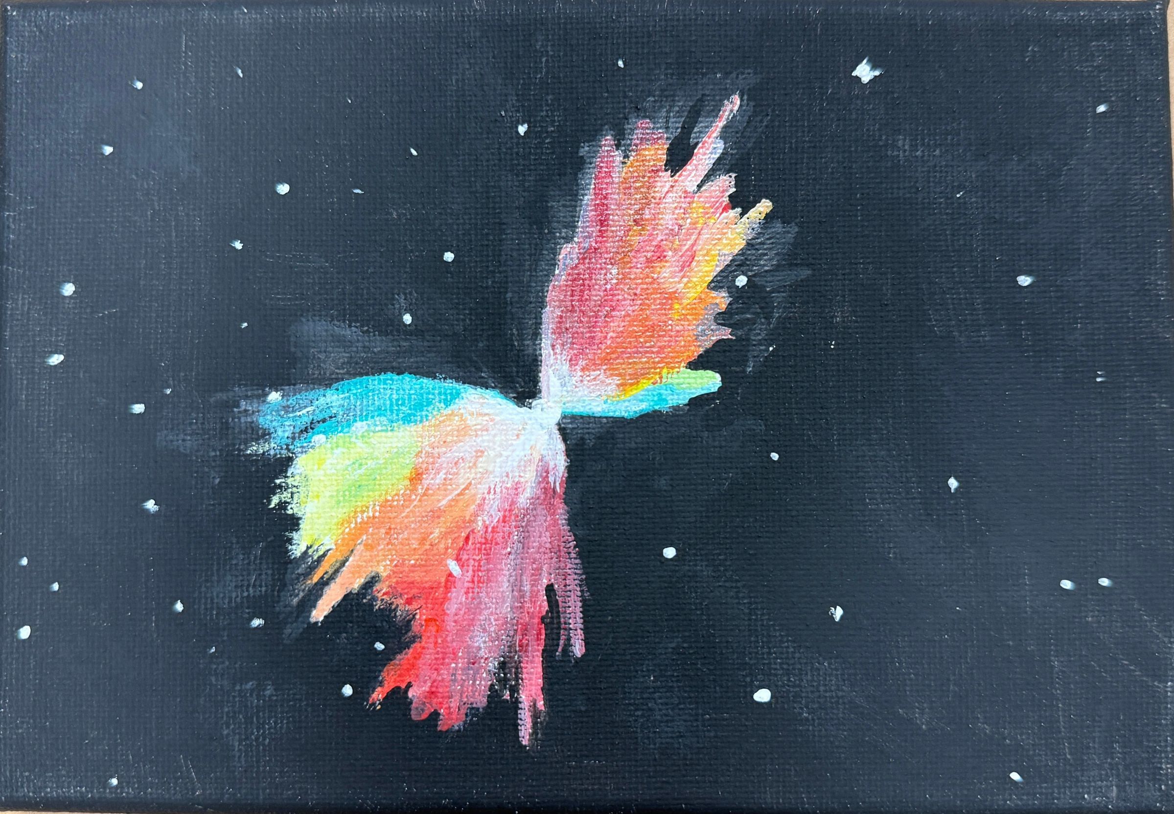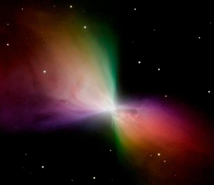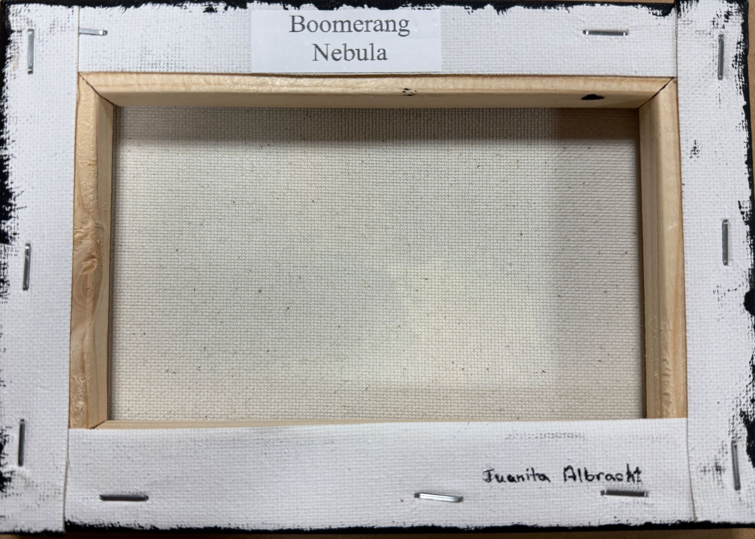 Title [assigned by artist]: Boomerang Nebula This painting of the Boomerang Nebula is part of a series of paintings of the cosmos by Sister Juanita Albracht, CCVI (1933 - ). Sister Juanita wrote, “The Boomerang Nebula is also known as Bipolar Centaur or Bow Tie. It is located in the Constellation Centaurs, probably the coldest place in the Universe. In 1995, the temperature was taken by the submillimeter telescope of La Silla Observatory, South America, and found to be -272 Degrees Celsius, that is, 1 degree above absolute zero. According to NASA the nebula was caused by an explosion of gases and other materials from its central star. NASA, in its system of numbering and accounting for stars, galaxies and nebula has assigned the following number to Boomerang: IRAS 12419-S414-ES0172.7.” Título [asignado por el artista]: Nebulosa Bumerán Esta pintura de la Nebulosa Bumerán forma parte de una serie de pinturas del cosmos de Sor Juanita Albracht, CCVI (1933-). Sor Juanita escribió: «La Nebulosa Bumerán también se conoce como Centauro Bipolar o Corbata de Moño. Se encuentra en la Constelación de los Centauros, probablemente el lugar más frío del Universo. En 1995, el telescopio submilimétrico del Observatorio La Silla, en Sudamérica, midió su temperatura en -272 grados Celsius, es decir, 1 grado sobre el cero absoluto. Según la NASA, la nebulosa se originó por una explosión de gases y otros materiales provenientes de su estrella central. La NASA, en su sistema de numeración y contabilización de estrellas, galaxias y nebulosas, le ha asignado el siguiente número a Bumerán: IRAS 12419-S414-ES0172.7».