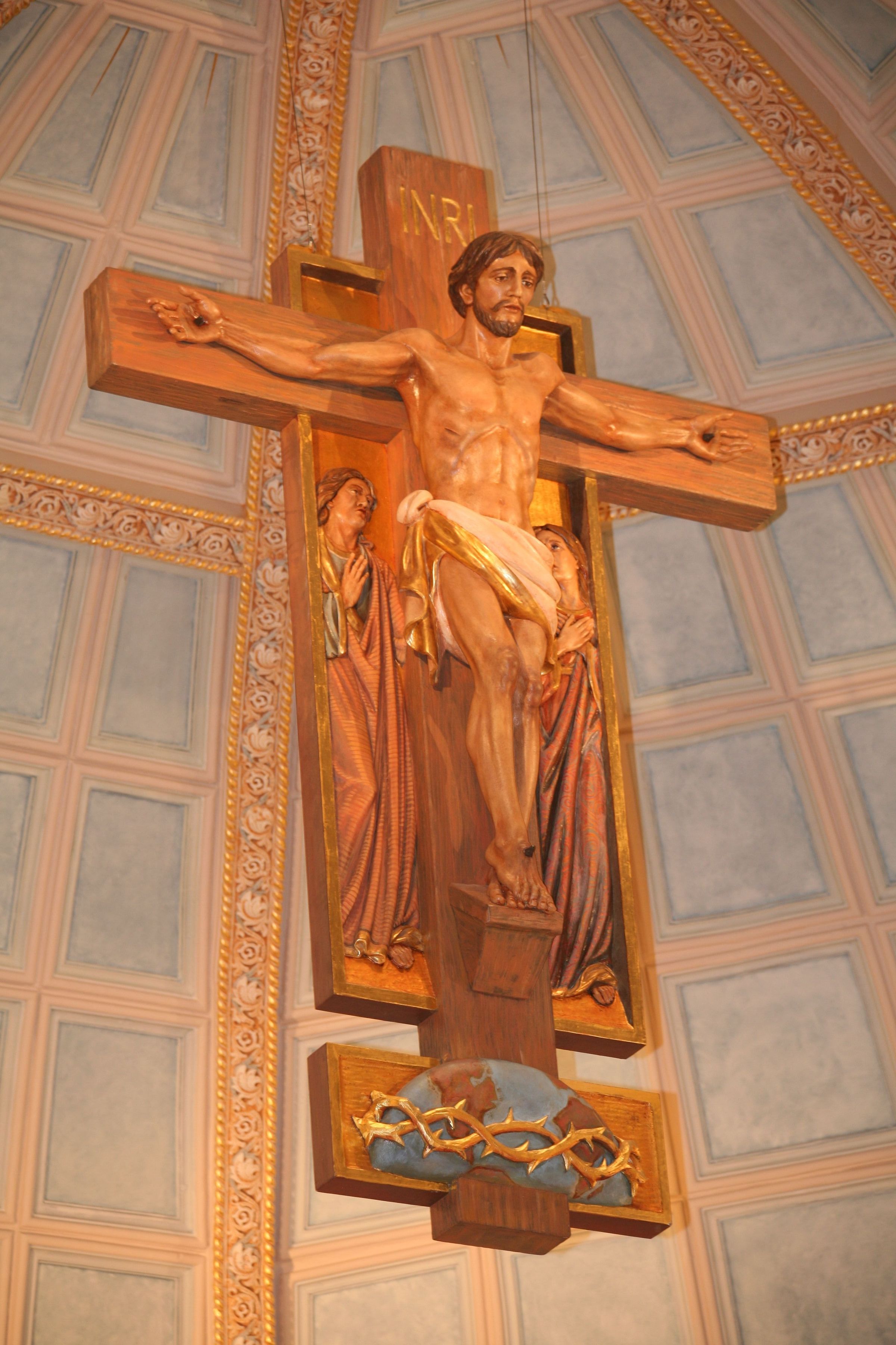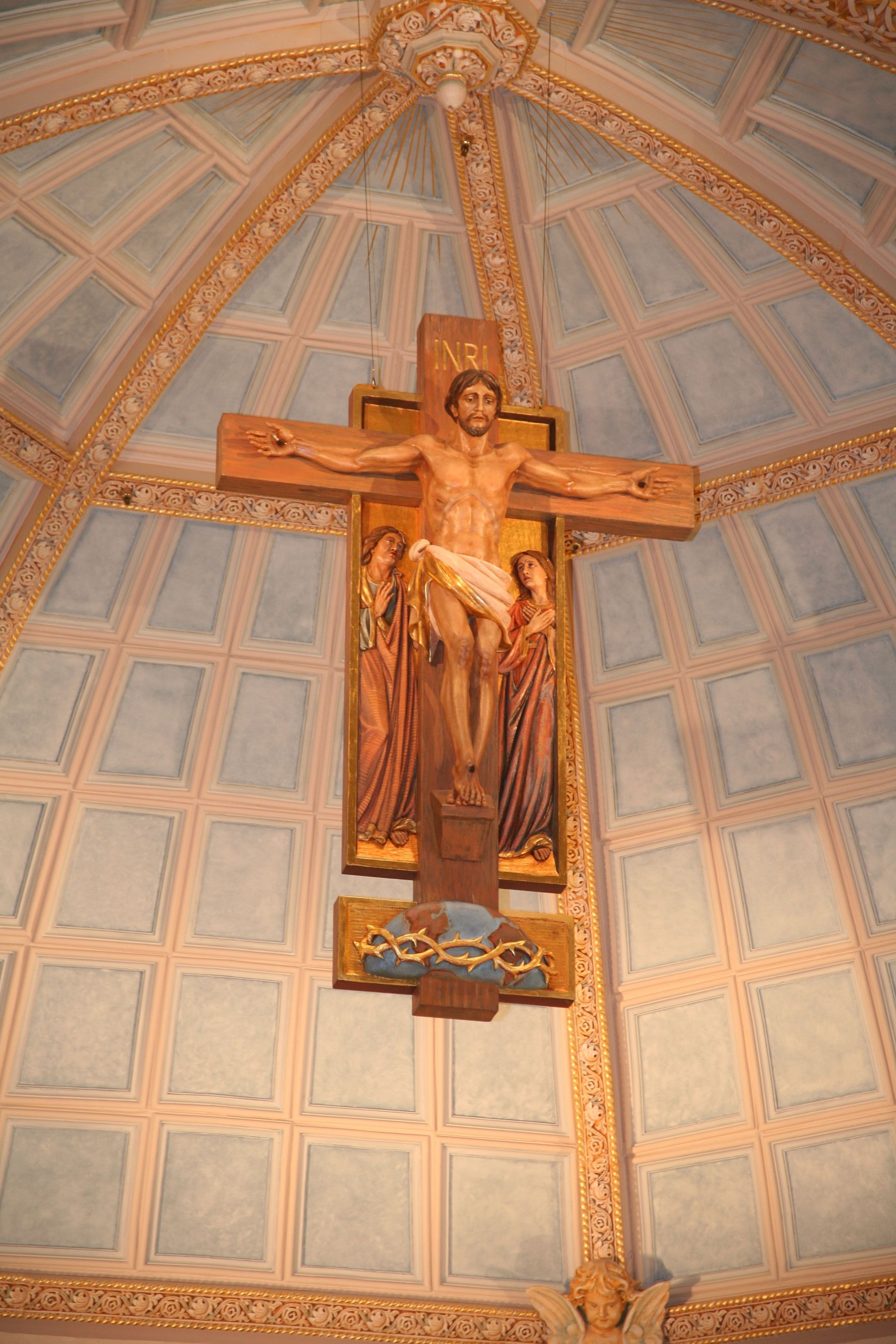 Jesus hangs on the cross, his gaze cast downward. The Virgin Mary and Mary Magdalene stand at either side of him. An inscription above his head reads “INRI,” a Latin acronym that stands for "Iesus Nazarenus, Rex Iudaeorum," which translates to "Jesus of Nazareth, King of the Jews." A globe circled by a Crown of Thorns sits at the base of the Crucifix. Sister Eilish Ryan, CCVI wrote the following description of the Crucifix’s imagery: