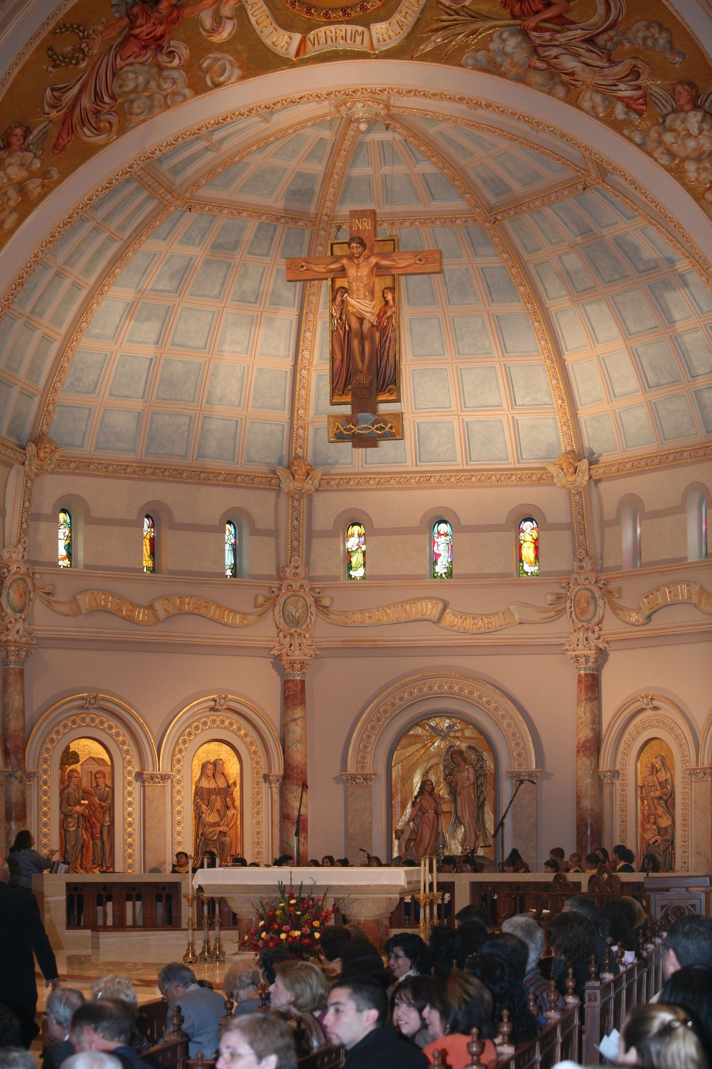 Este crucifijo de madera de tilo de 3 metros de altura cuelga sobre el altar en el ábside de la Capilla del Verbo Encarnado. Fue encargado por las Hermanas de la Caridad del Verbo Encarnado durante la renovación de la capilla en 2006-2007, que coincidió con el centenario de la finalización de la capilla. El artesano Edmund Rabanser creó la estatua en su estudio de Ortisei, Italia.