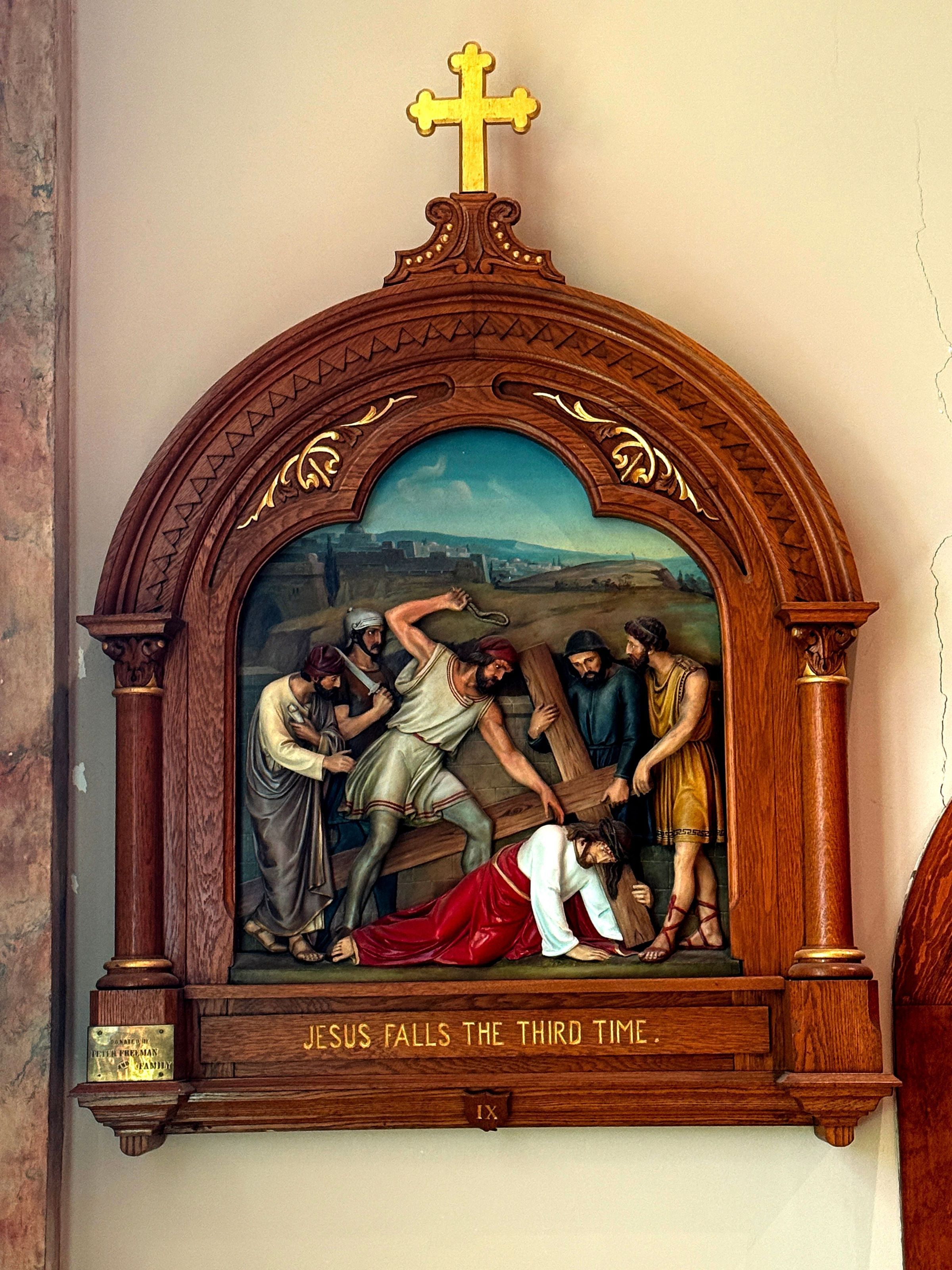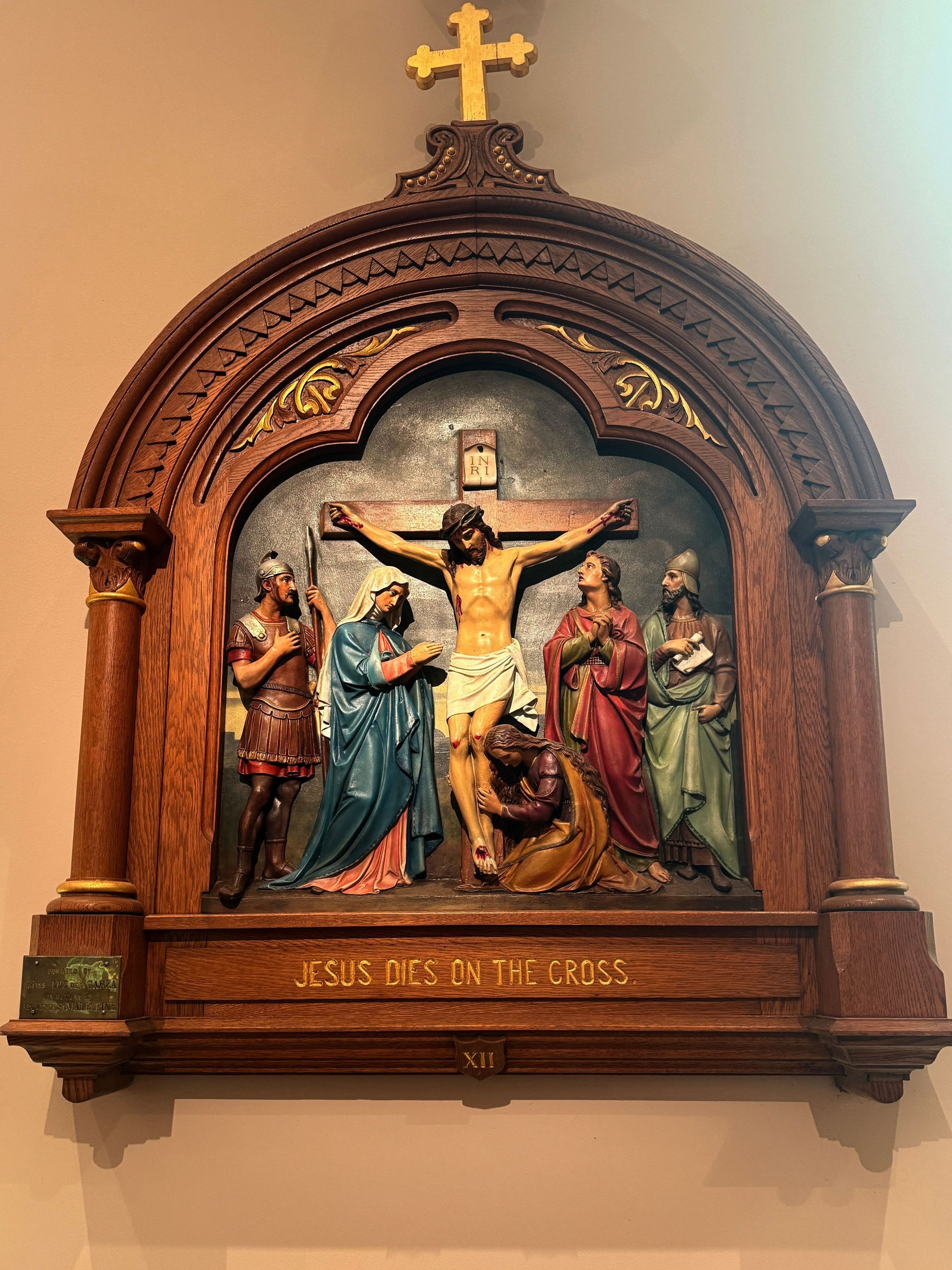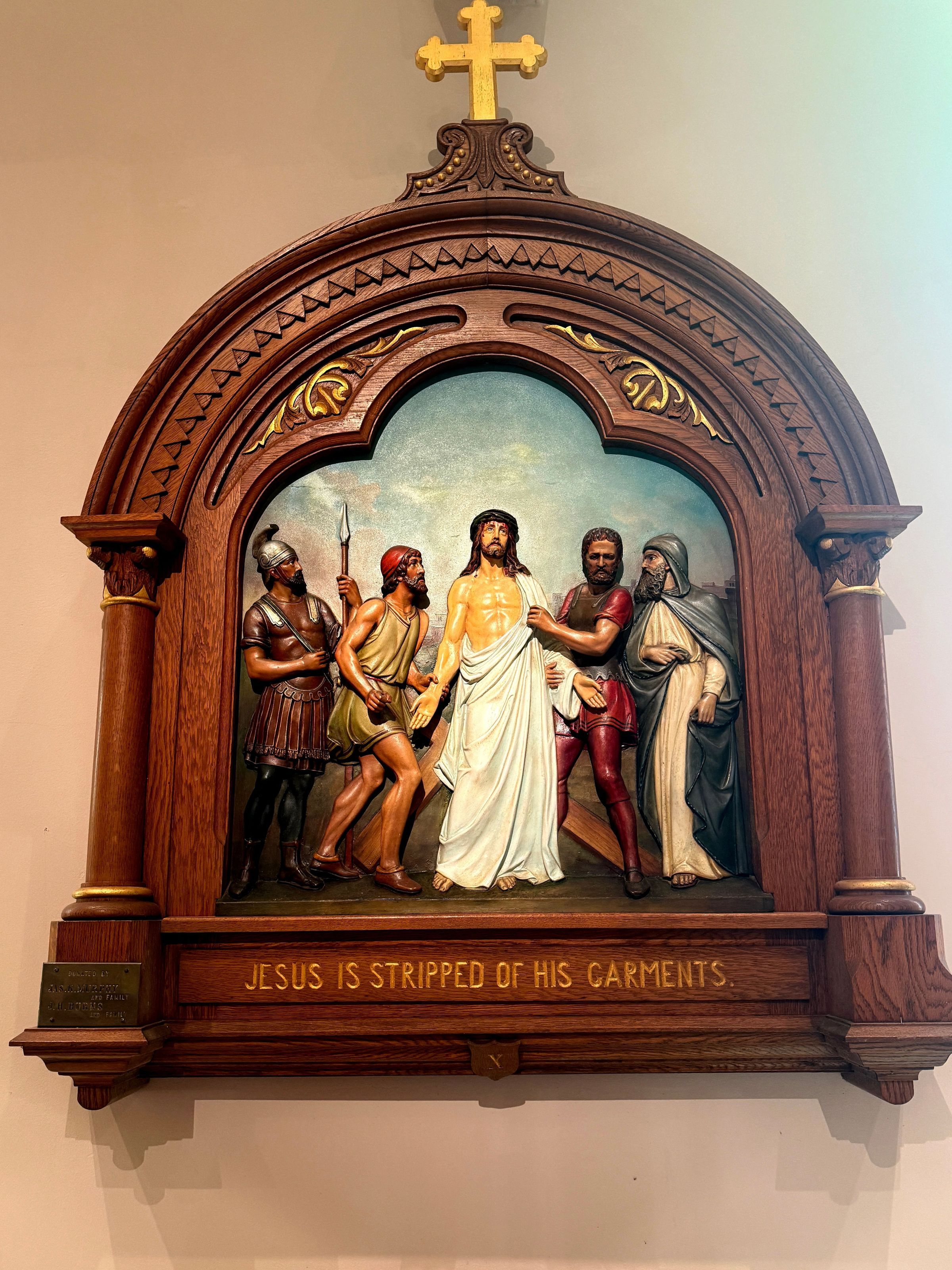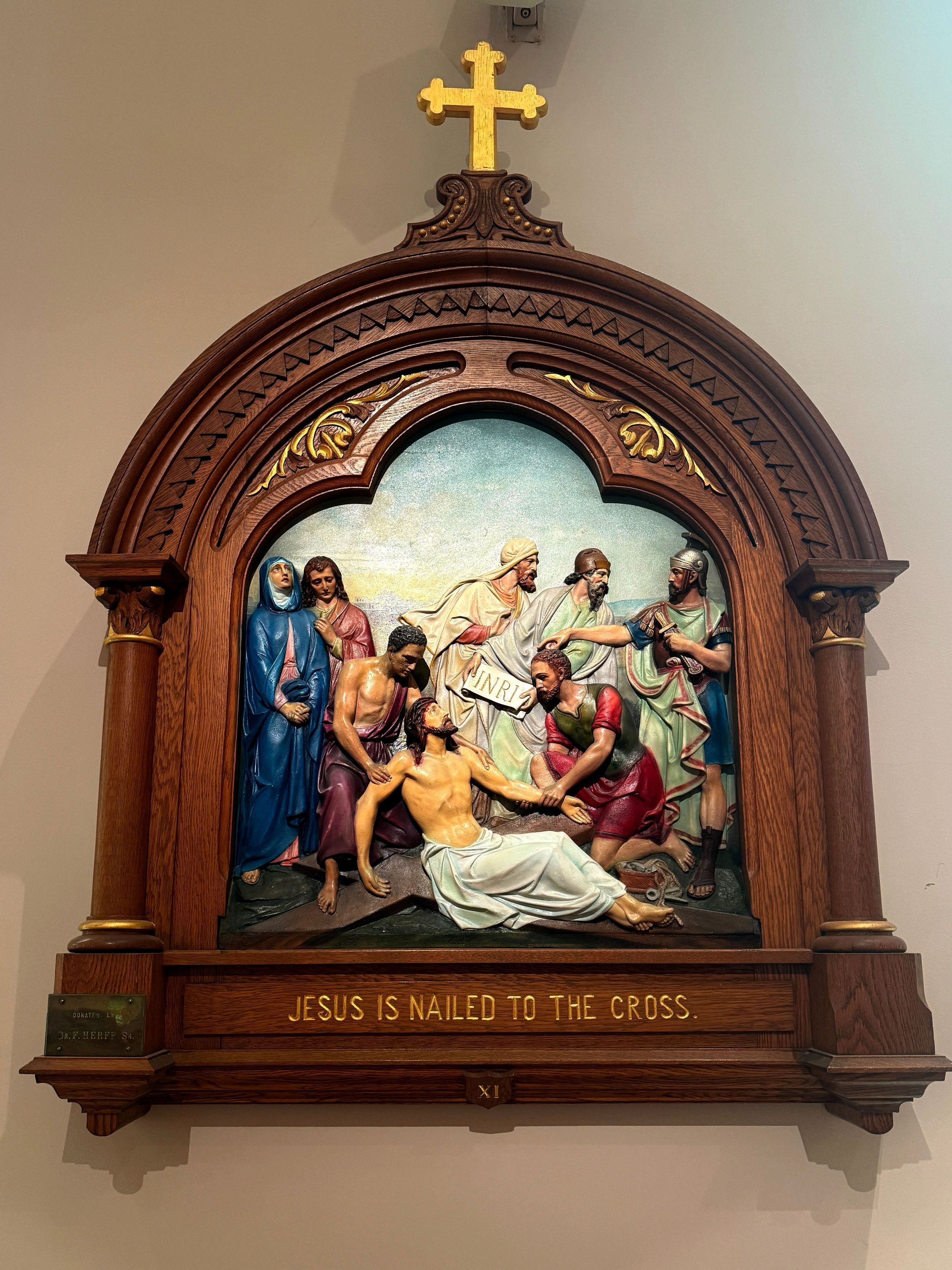 Fourteen bas-relief painted carvings of the Stations of the Cross surround nave of the Chapel. Each five-foot-tall Station has a wooden frame with an engraved nickel plate etched with the name of a donor. Letters from Mother Alphonse Brollier, CCVI (1858 – 1939) indicate that the Stations were purchased from Frederick Pustet and Company in 1906. Pustet & Co. was a manufacturer of religious articles—including vestments, statues, Stations of the Cross, and sacred vessels—based in New York and Cincinnati, Ohio.
