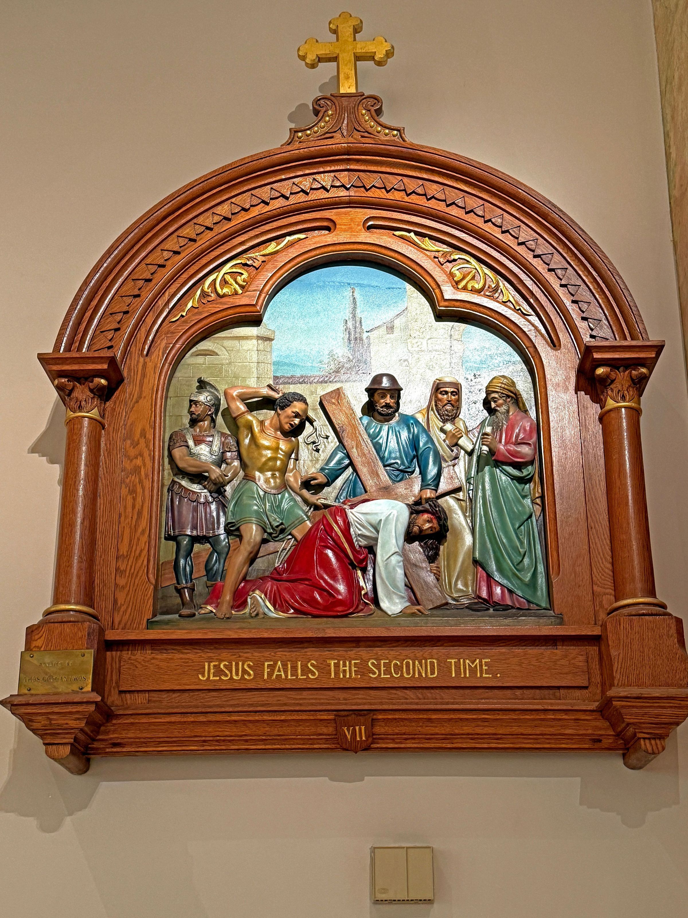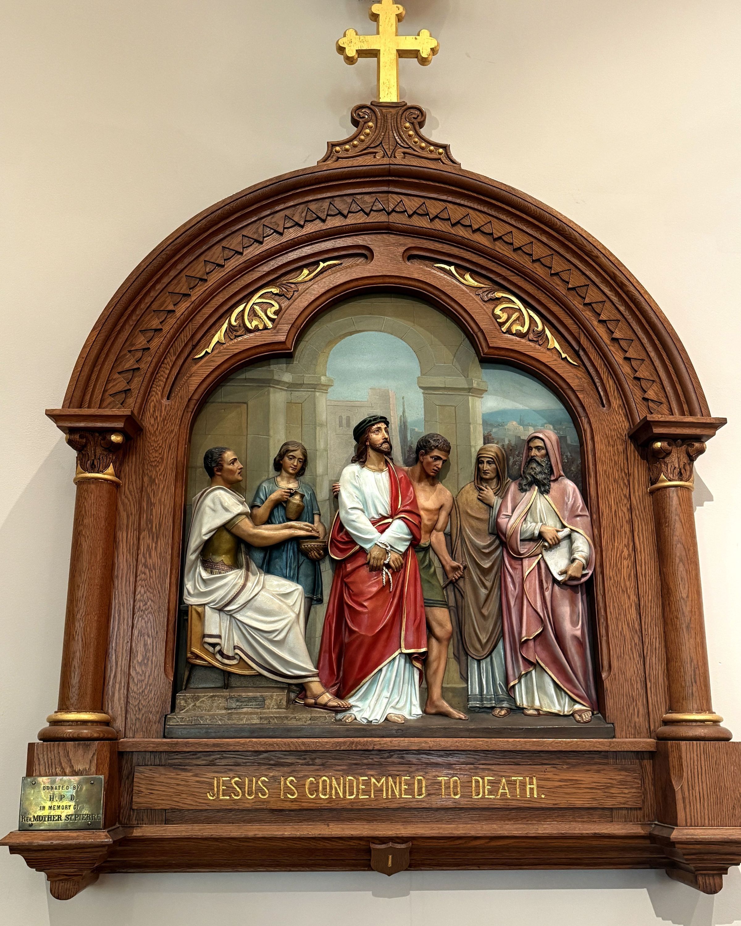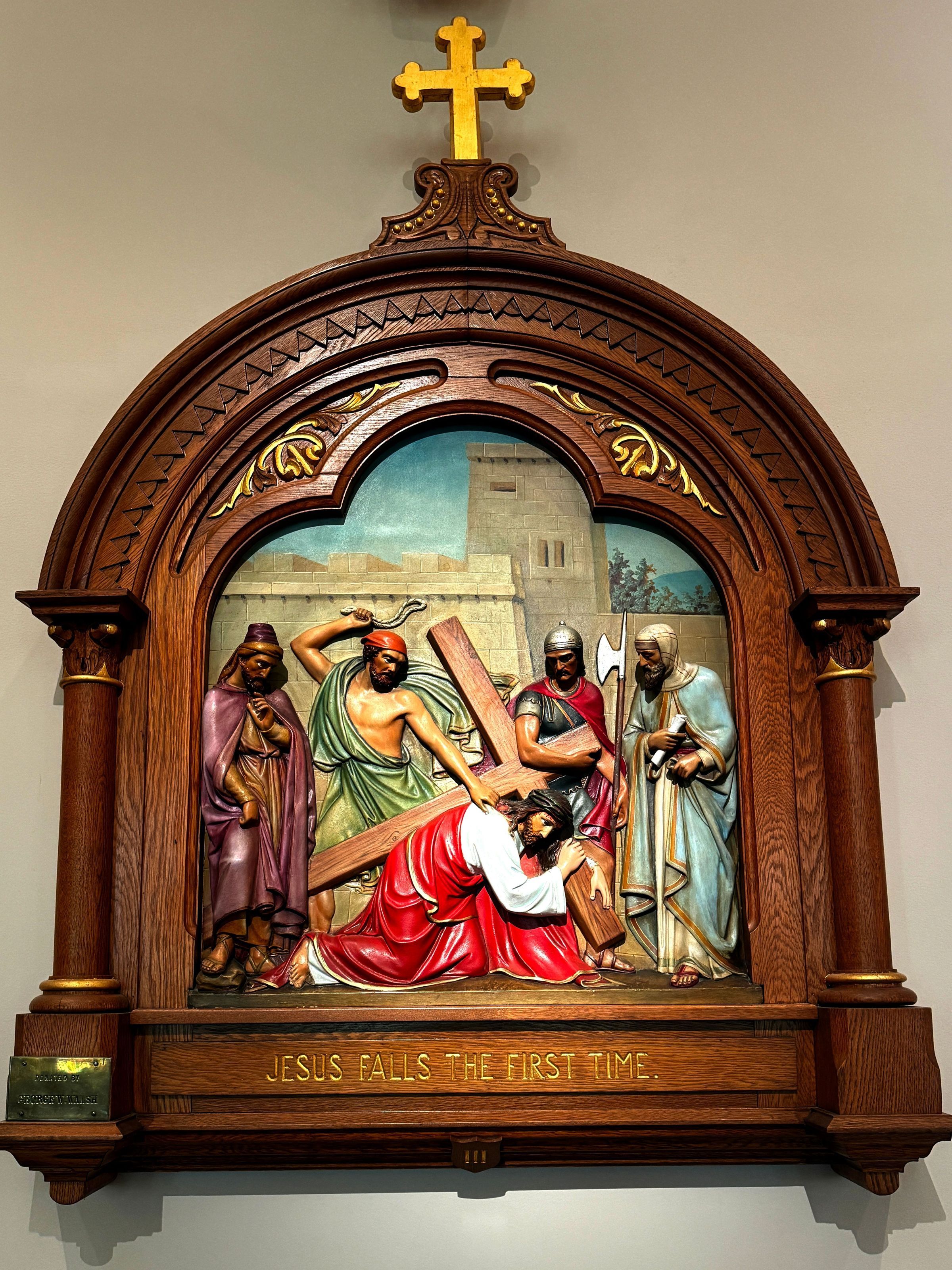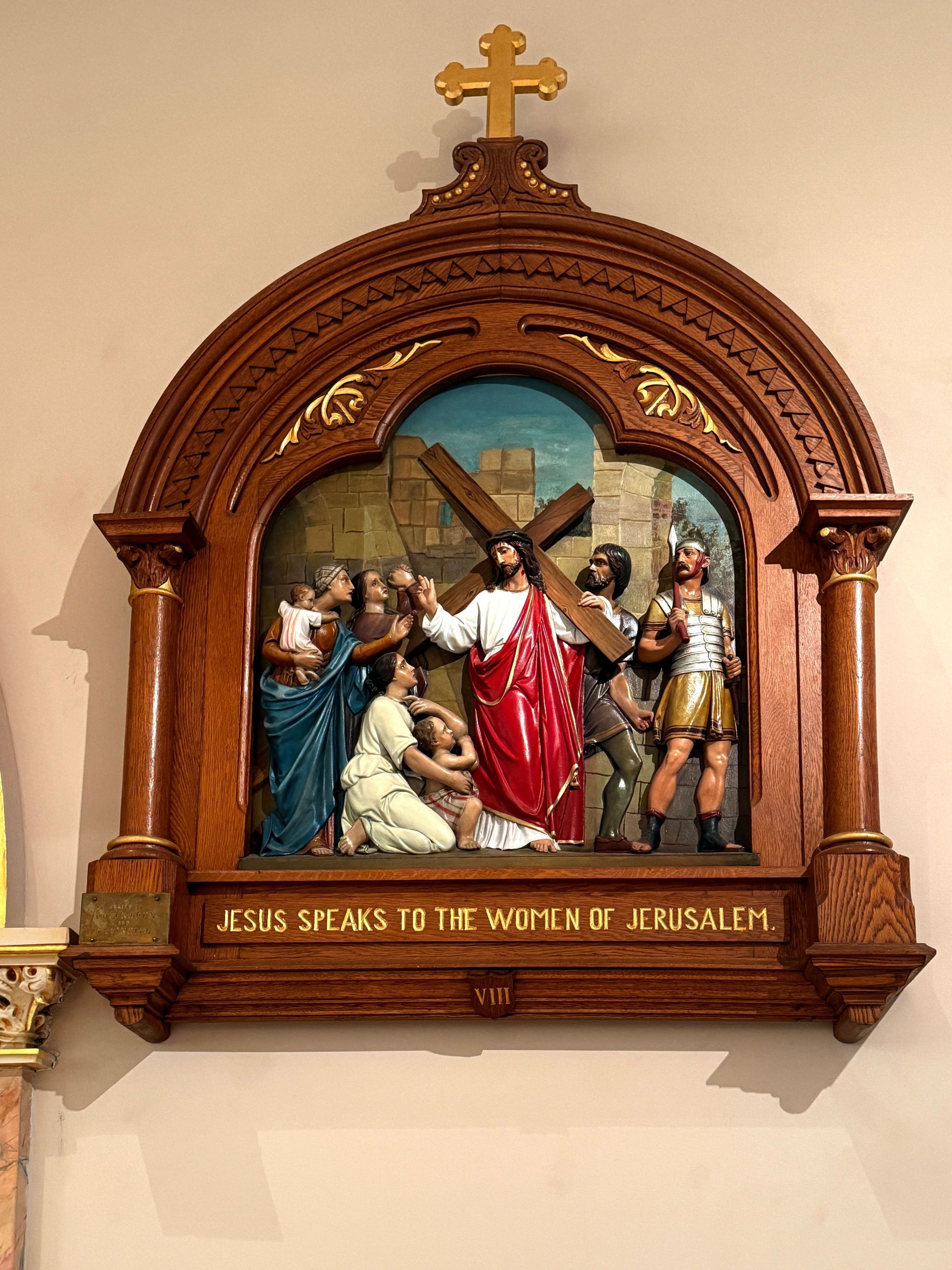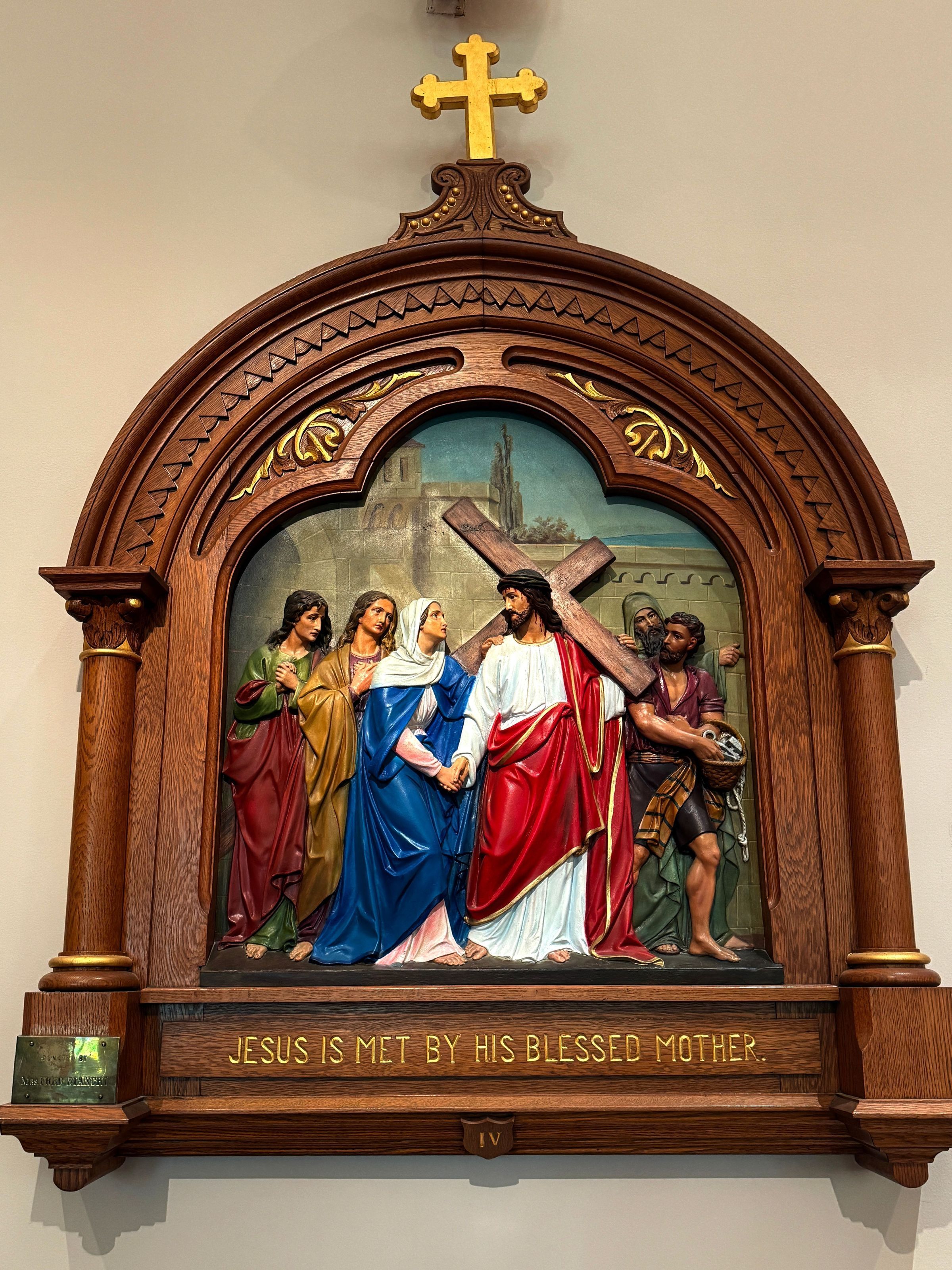 Fourteen bas-relief painted carvings of the Stations of the Cross surround nave of the Chapel. Each five-foot-tall Station has a wooden frame with an engraved nickel plate etched with the name of a donor. Letters from Mother Alphonse Brollier, CCVI (1858 – 1939) indicate that the Stations were purchased from Frederick Pustet and Company in 1906. Pustet & Co. was a manufacturer of religious articles—including vestments, statues, Stations of the Cross, and sacred vessels—based in New York and Cincinnati, Ohio.