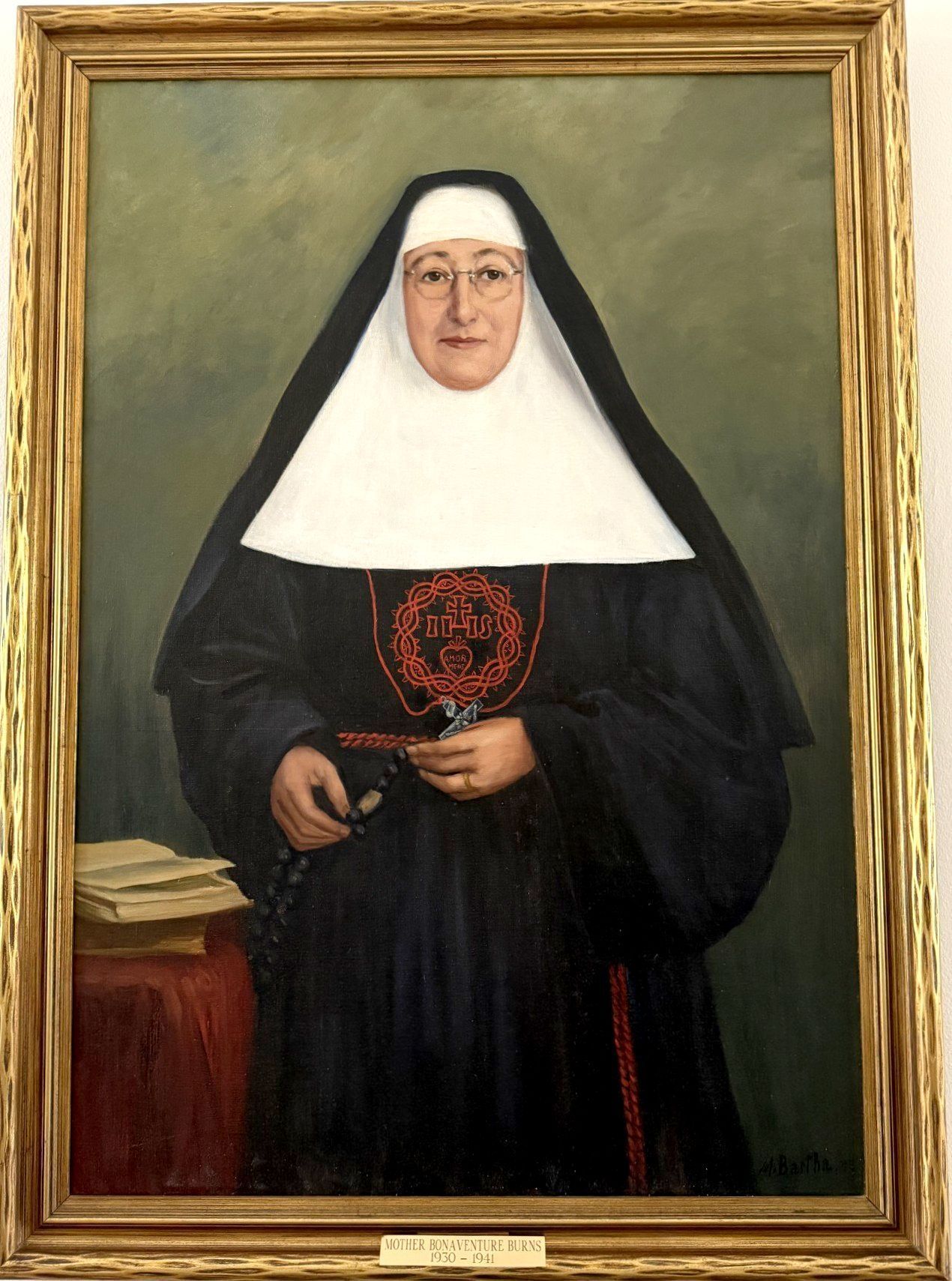 Title [assigned by artist]: Mother Bonaventure Burns (1930 - 1941) Mother Bonaventure Burns, CCVI (1867 – 1941) was born in Sneem, Ireland on November 16, 1867. She entered the CCVI Congregation in 1884, took her first vows in 1886, and made her perpetual vows in 1892. During her early days as a Sister, she missioned as the Superior at schools across Texas and Mexico. She served as a Consultor on the Incarnate Word Generalate from 1906 to 1930 before being elected General Superior in 1930. She served in this role until her death on November 13, 1941. Madame Maria Bartha, a French-born portraitist, depicted Mother Bonaventure in a ¾ length face-forward portrait. Mother wears wire-rimmed glasses and the habit of the Sisters of Charity of the Incarnate Word. She holds her crucifix in her hands. A small table with a red tablecloth sits to her right with an open book atop it. This painting is part of a 1943 portrait series that Madame Bartha painted of the CCVI General Superiors. Título [asignado por el artista]: Madre Buenaventura Burns (1930 - 1941) Madre Buenaventura Burns, CCVI (1867 - 1941) nació en Sneem, Irlanda, el 16 de noviembre de 1867. Ingresó en la Congregación CCVI en 1884, emitió sus primeros votos en 1886 e hizo los votos perpetuos en 1892. Durante sus primeros días como Hermana, misionó como Superiora en colegios de Texas y México. Fue Consultora del Generalato del Verbo Encarnado de 1906 a 1930, antes de ser elegida Superiora General en 1930. Desempeñó este cargo hasta su muerte el 13 de noviembre de 1941. Madame Maria Bartha, una retratista de origen francés, retrató a la Madre Buenaventura en un retrato de ¾ de cuerpo de frente. La Madre lleva gafas de montura de alambre y el hábito de las Hermanas de la Caridad del Verbo Encarnado. Sostiene un crucifijo en las manos. A su derecha hay una mesita con un mantel rojo y un libro abierto encima. Este cuadro forma parte de una serie de retratos de 1943 que Madame Bartha pintó de las Superioras Generales CCVI.