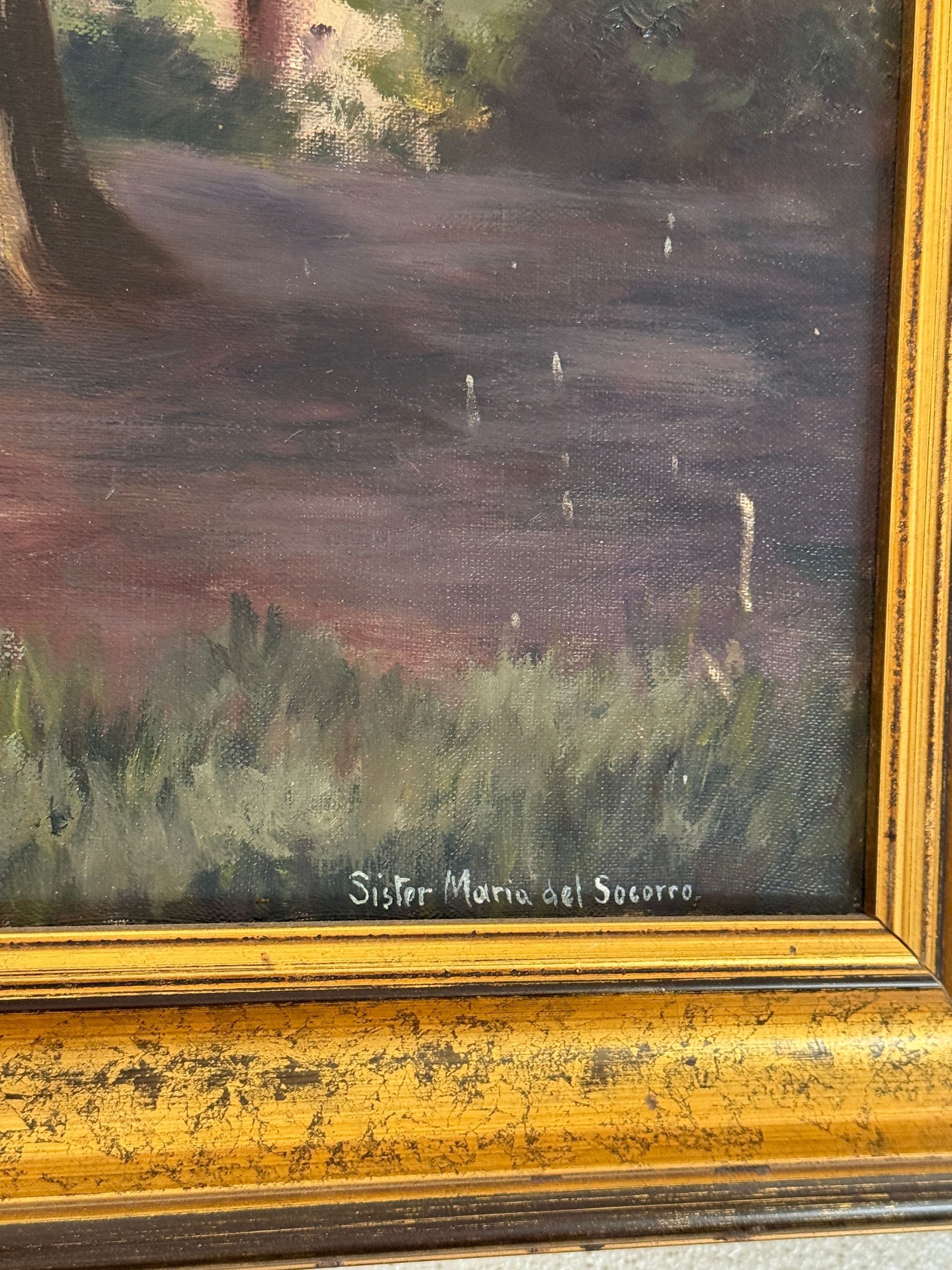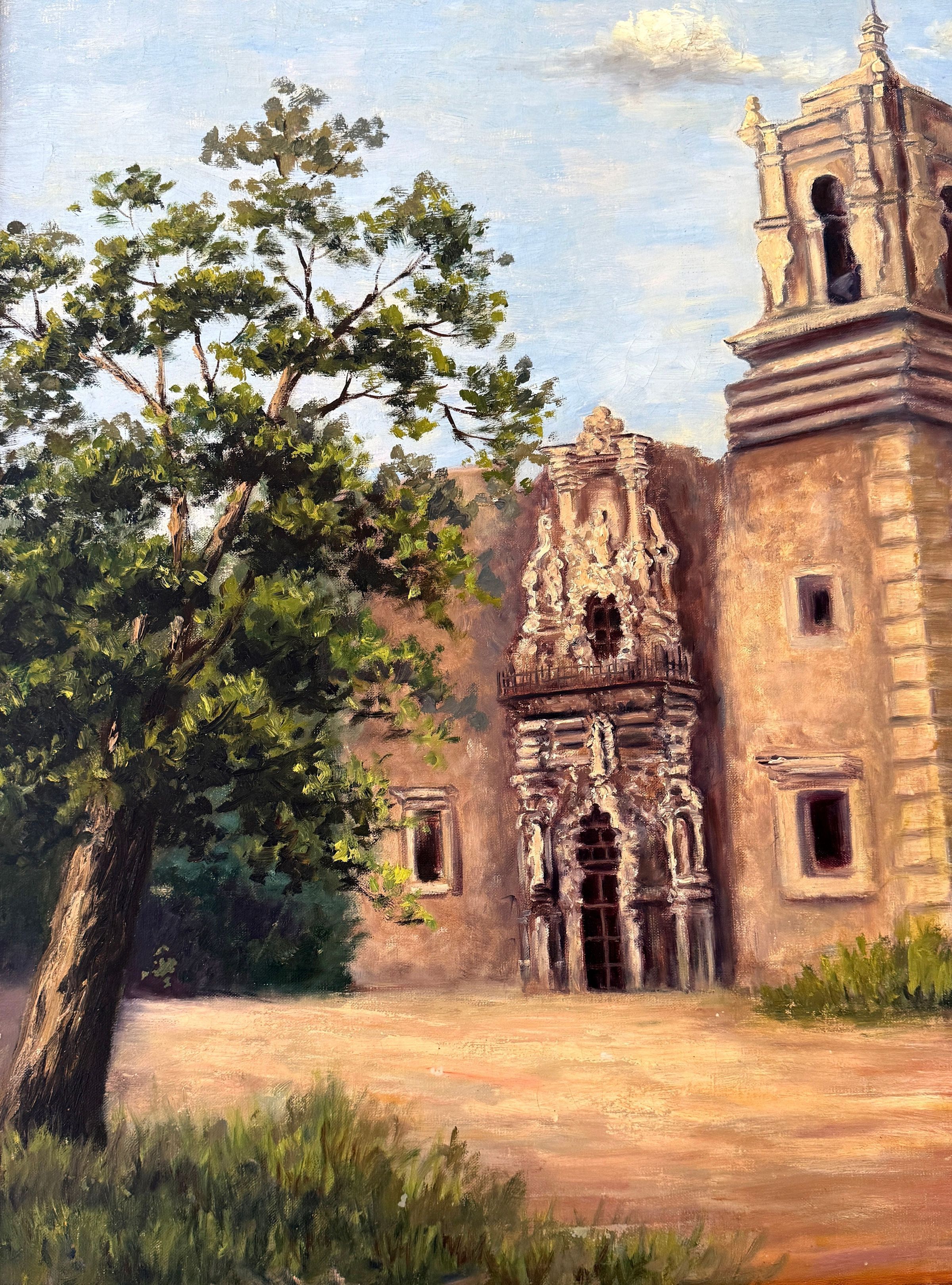 Title [assigned by archives]: San Jose Side View Sister María del Socorro Lazo Houston, CCVI (1893 – 1956) created a series of large-scale oil paintings of the San Antonio Missions that can be found (as of 9/2025) on the University of the Incarnate Word campus. This painting, the second by Sister depicting the Mission San Jose, hangs in the lobby of the Bennack Concert Hall. Sister María del Socorro painted a side view of the Mission, which is flanked by two oak trees. Mission San Jose is known as the “Queen of the Missions” because it is the largest of the San Antonio Missions. It was founded in 1720 by Franciscan missionary Father Margil de Jesús. Sister Anne Quinn, CCVI wrote in 1969 about Sister María del Socorro’s love of Texan imagery, like the Missions: “She herself maintained that Texas itself was the source of her inspiration for most of her paintings. She loved Texas passionately and found an affinity with the state which somehow reflects itself in much of her paintings.” Título [asignado por los archivos]: Vista lateral de San José La hermana María del Socorro Lazo Houston, CCVI (1893-1956) creó una serie de pinturas al óleo a gran escala de las misiones de San Antonio que se pueden encontrar (a fecha de septiembre de 2025) en el campus de la Universidad del Verbo Encarnado. Esta pintura, la segunda de la hermana que representa la Misión de San José, cuelga en el vestíbulo del Bennack Concert Hall. La hermana María del Socorro pintó una vista lateral de la misión, flanqueada por dos robles. La Misión de San José es conocida como la «Reina de las Misiones» porque es la más grande de las misiones de San Antonio. Fue fundada en 1720 por el misionero franciscano padre Margil de Jesús. Sor Anne Quinn, CCVI, escribió en 1969 sobre el amor de la hermana María del Socorro por las imágenes texanas, como las misiones: «Ella misma sostenía que Texas era la fuente de inspiración de la mayoría de sus pinturas. Amaba Texas apasionadamente y sentía una afinidad con el estado que de alguna manera se refleja en muchas de sus pinturas».