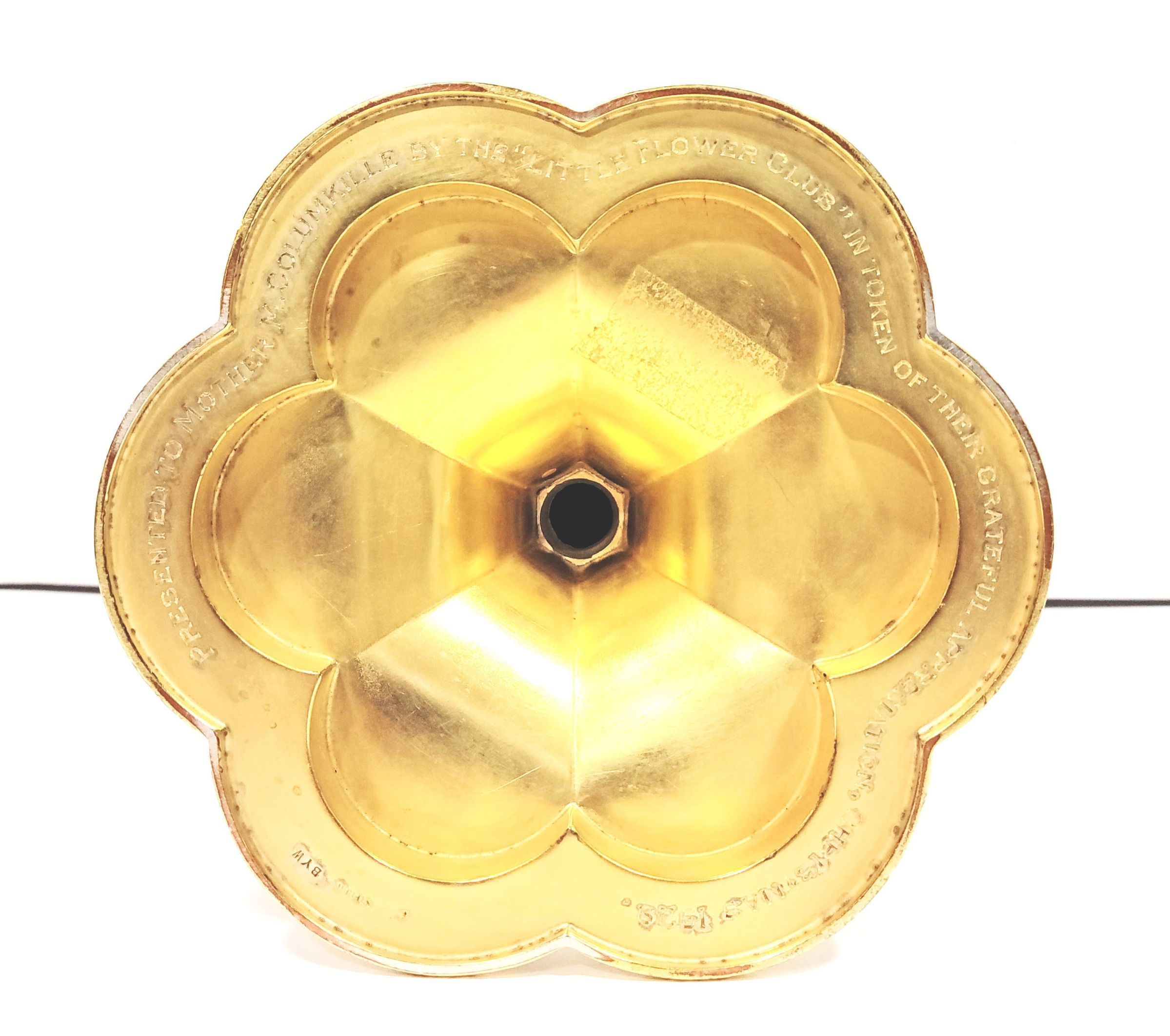 Entregado a la Madre Columkille por el "Little Flower Club" como muestra de su agradecimiento, Navidad de 1929. Esterlina BYWType