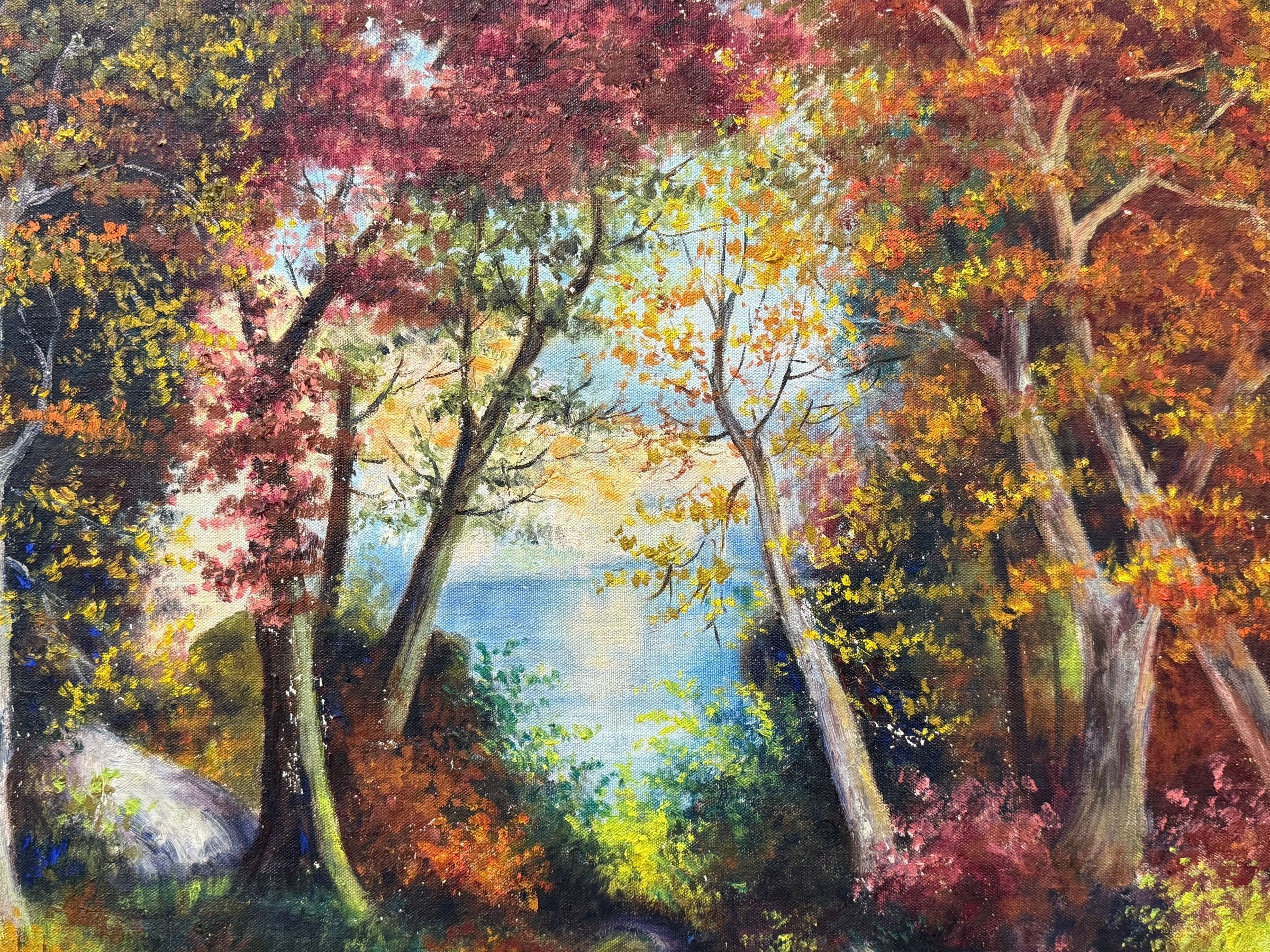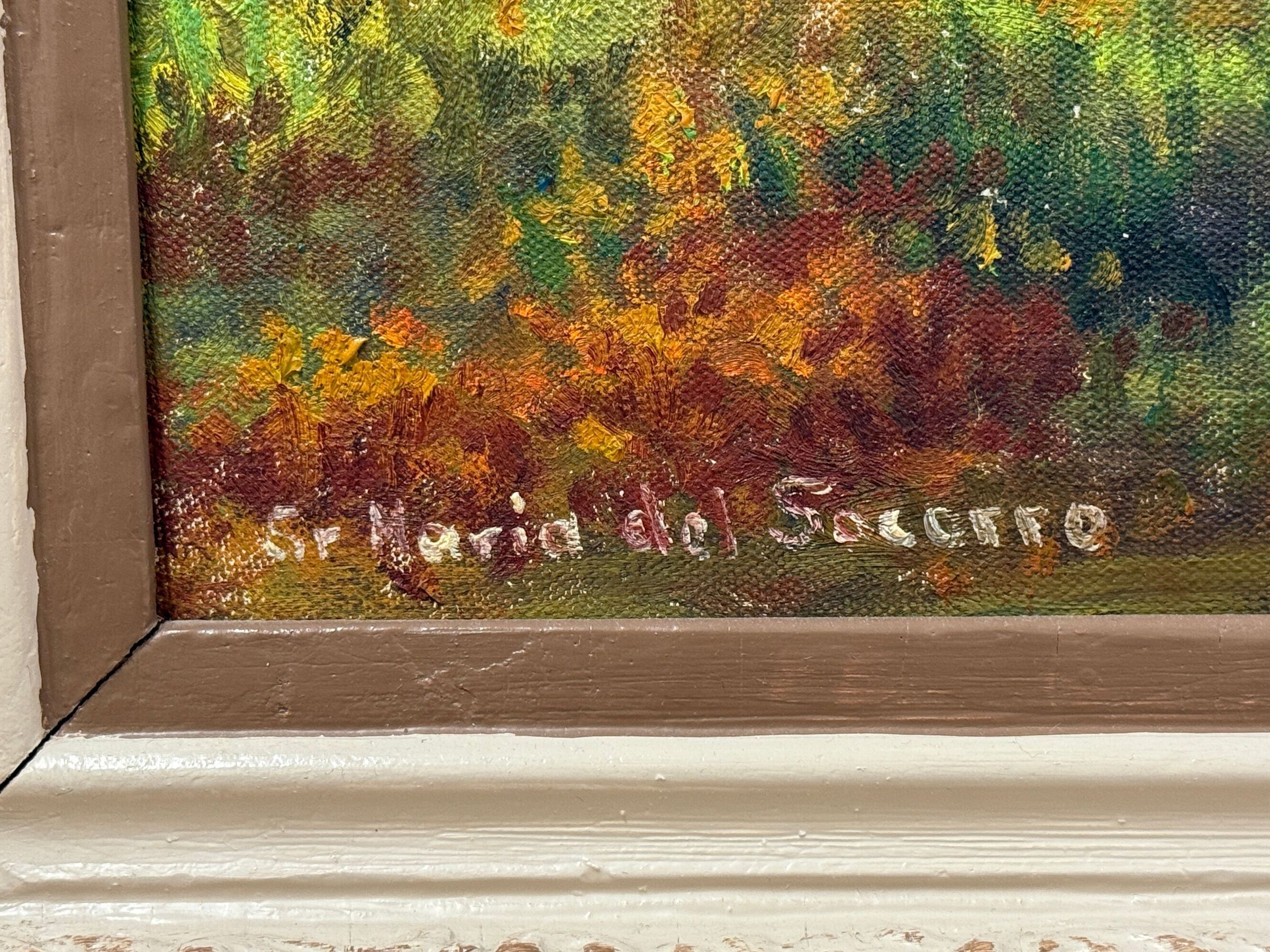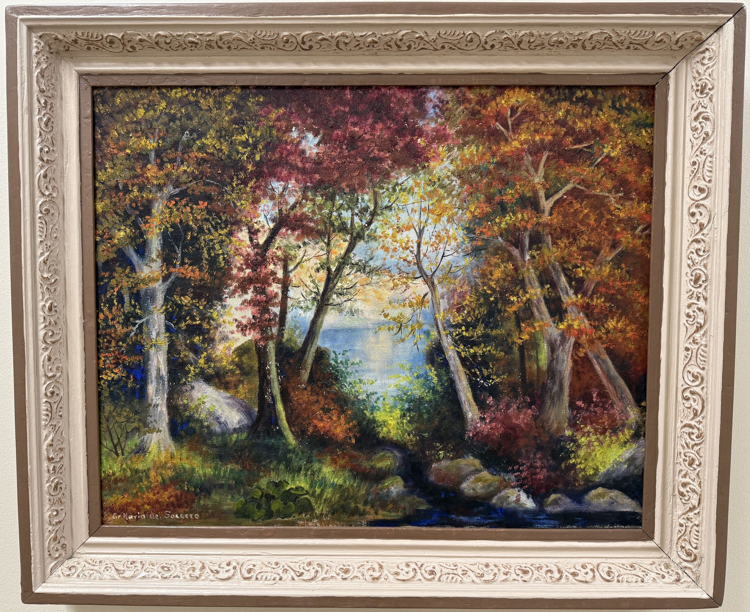 Title [assigned by archives]: Autumn Trees Sister María del Socorro Lazo Houston, CCVI (1893 – 1956) painted an autumnal scene of trees, their leaves each a different shade of orange, red, or yellow. The trees bow towards the middle of the canvas, framing a lake that trickles into a stream in the foreground. Sister María del Socorro frequently painted landscape scenes and took a great deal of artistic inspiration from the natural world. Título [asignado por los archivos]: Árboles otoñales Sor María del Socorro Lazo Houston, CCVI (1893 - 1956) pintó una escena otoñal de árboles, cada una de cuyas hojas tiene un tono diferente de naranja, rojo o amarillo. Los árboles se inclinan hacia el centro del lienzo, enmarcando un lago que desemboca en un arroyo en primer plano. Sor María del Socorro pintaba con frecuencia paisajes y se inspiraba mucho en la naturaleza.