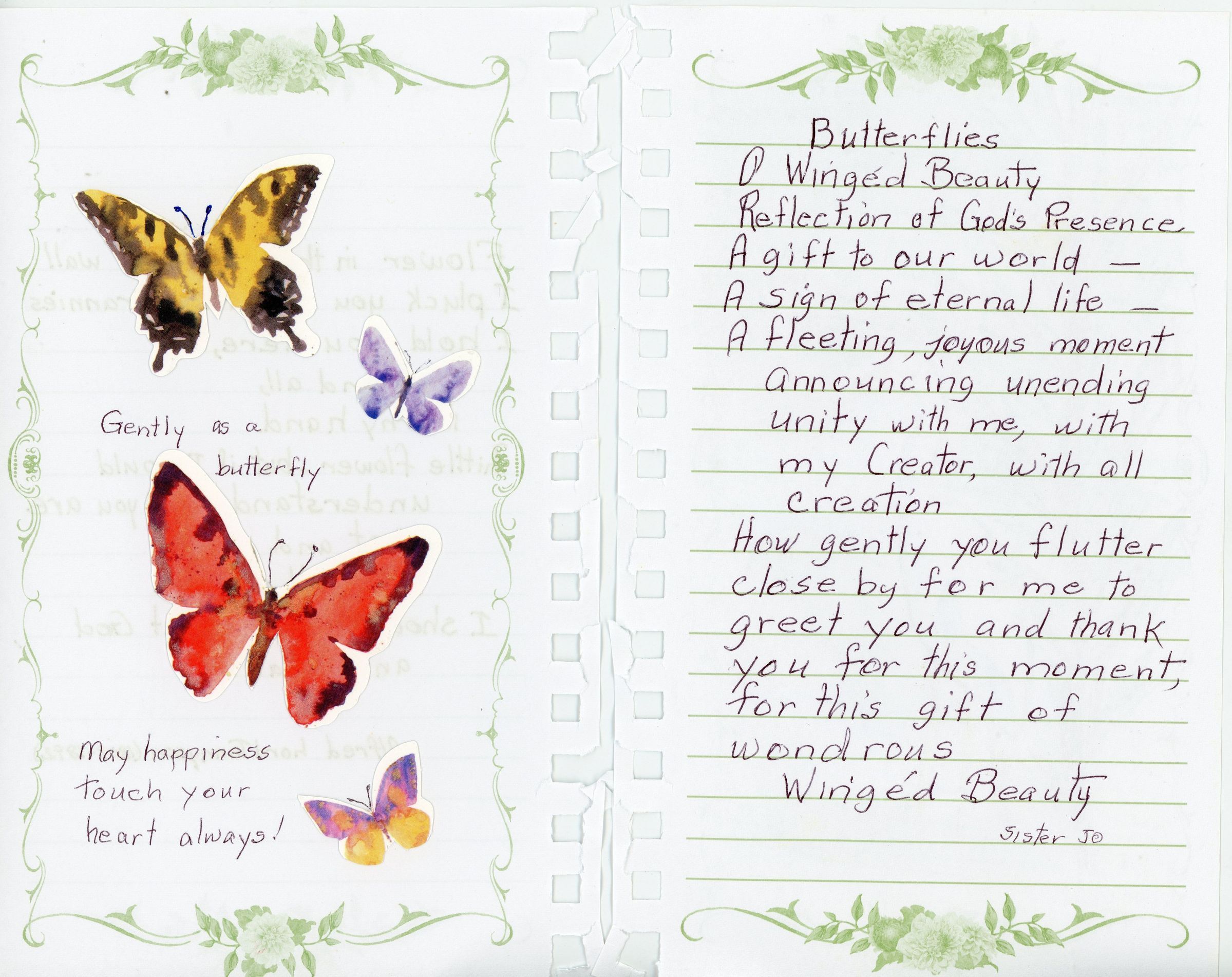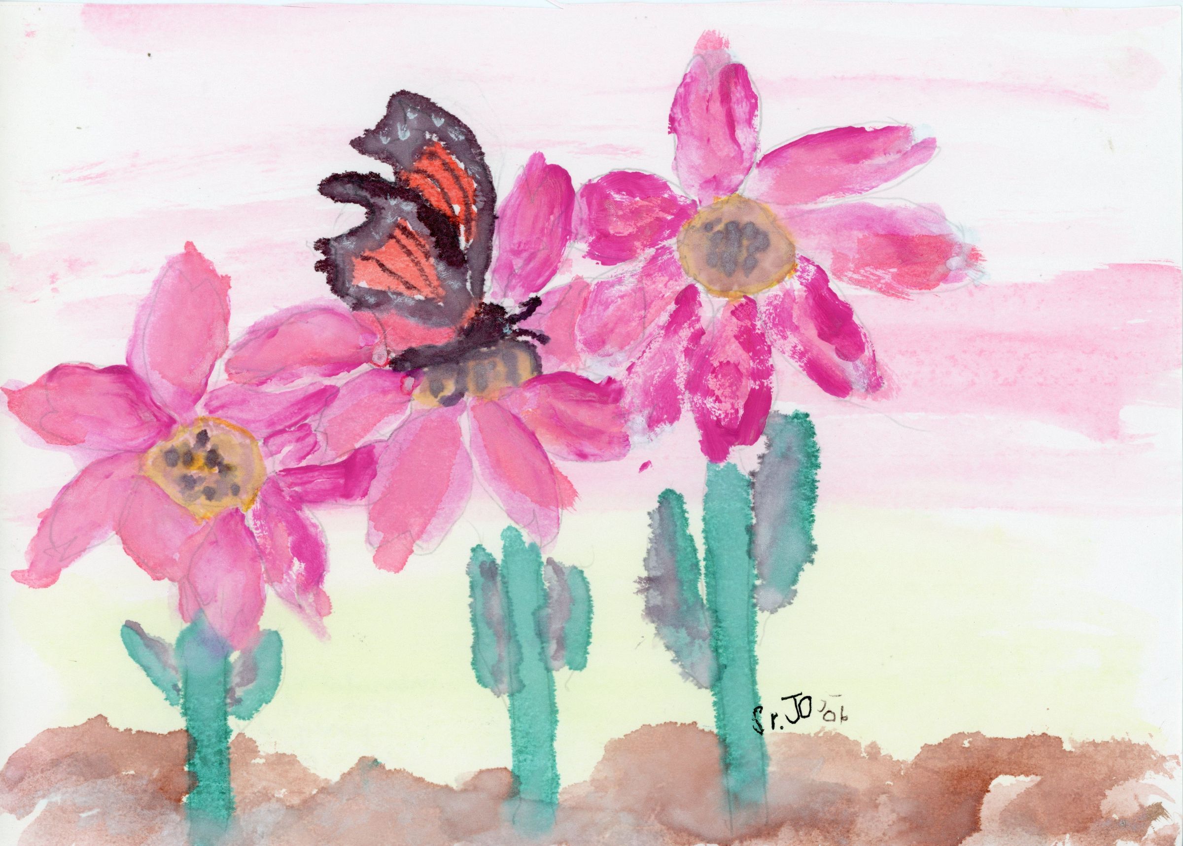 Title [assigned by archives]: Flowers and Butterfly Sister Joseph Alphonsus (Jo) Dederichs, CCVI (1923 – 2017) showed an admiration for the natural world in most of her paintings. In this 2006 watercolor painting, three pink flowers are plated in brown dirt in front of a pink and yellow horizon. An orange and black Monarch Butterfly sits on the middle flower. A note on the backside of the painting reads, “watercolor by S. Jo Dederichs with left hand, after stroke paralyzed right hand. Gift to Judy Smith after it was on display for Connections 2007 (6/2/07).” CCVI Connections was a program that served to connect Sisters with separated Sisters, or women who left the convent. Sister Jo loved butterflies and sang their praises in a poem entitled “Butterflies” in one of her journals: “O Winged Beauty/ Reflection of God’s Presence./ A gift to our world-/ A sign of eternal life-/ A fleeting, joyous moment/ announcing unending unity with me, with my Creator, with all creation/ How gently you flutter/ close by for me to greet you and thank you for this moment of wondrous/ Winged Beauty” Título [asignado por los archivos]: Flores y mariposas Sor Joseph Alphonsus (Jo) Dederichs, CCVI (1923-2017), mostró admiración por la naturaleza en la mayoría de sus pinturas. En esta acuarela de 2006, tres flores rosas se encuentran enterradas en tierra marrón frente a un horizonte rosa y amarillo. Una mariposa monarca anaranjada y negra se posa en la flor central. Una nota en el reverso de la pintura dice: "Acuarela de S. Jo Dederichs con la mano izquierda, tras un derrame cerebral que paralizó la mano derecha. Donación a Judy Smith tras su exhibición en Connections 2007 (2/6/07)". Conexiones CCVI fue un programa que sirvió para conectar a las Hermanas con Hermanas separadas, o mujeres que dejaron el convento. Sor Jo amaba las mariposas y las alababa en un poema titulado "Mariposas" en uno de sus diarios: "Oh, Belleza Alada, Reflejo de la Presencia de Dios. Un regalo para nuestro mundo, una señal de vida eterna, un momento fugaz y gozoso que anuncia la unidad eterna conmigo, con mi Creador, con toda la creación. Con qué suavidad revoloteas cerca para saludarte y agradecerte este momento de maravillosa Belleza Alada".