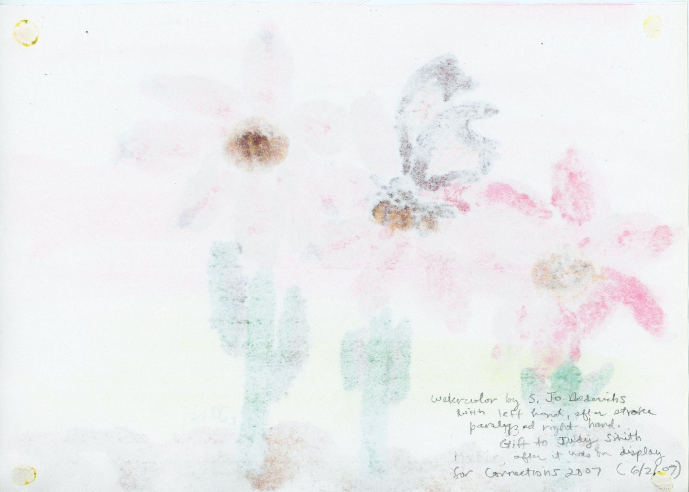 “watercolor by S. Jo Dederichs with left hand, after stroke paralyzed right hand. Gift to Judy Smith after it was on display for Connections 2007 (6/2/07)”