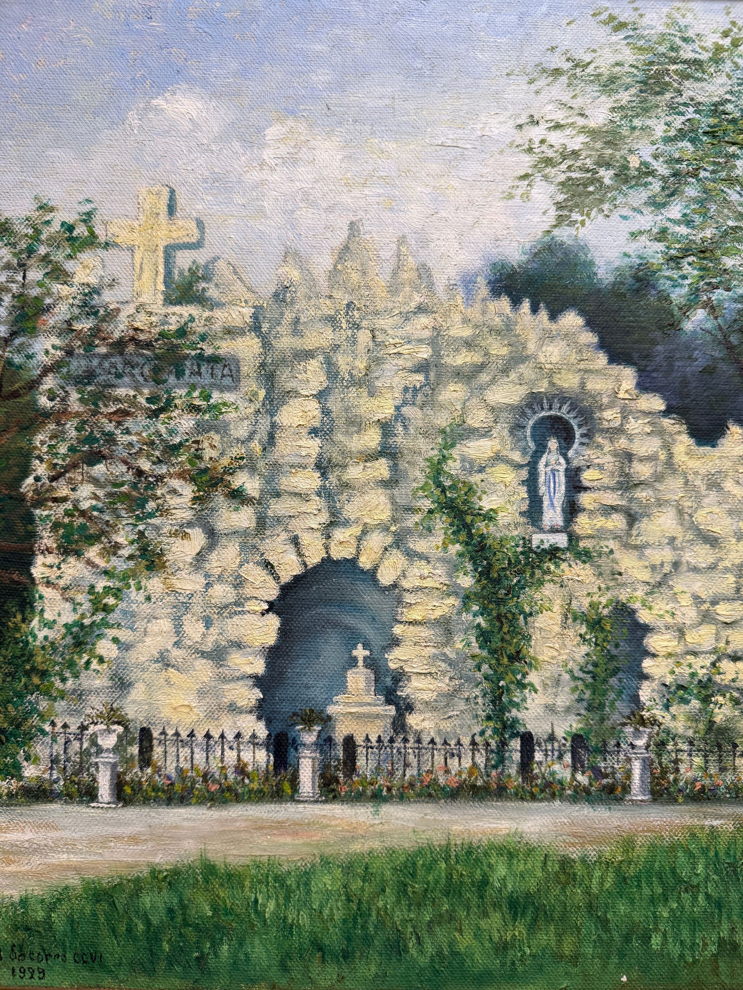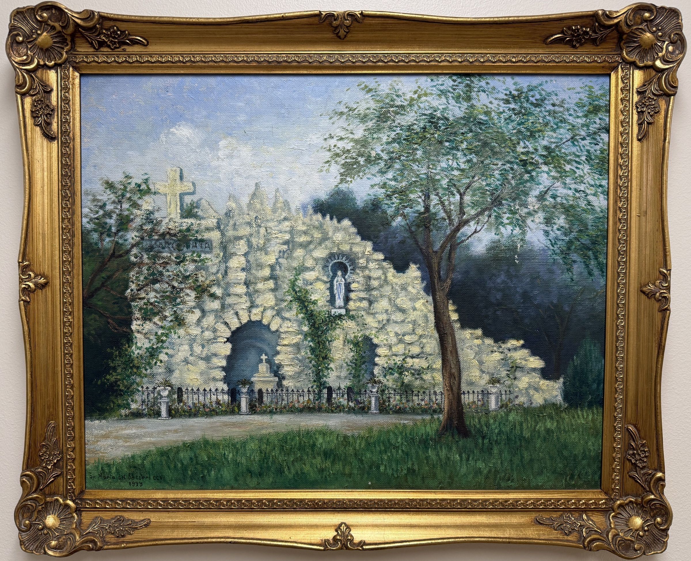Title [assigned by archives]: Lourdes Grotto Sister María del Socorro Lazo Houston (1893 – 1956) depicted a key devotional site for her Congregation in this 1929 painting. The Sisters of Charity of the Incarnate Word (CCVI) erected a replica of the Our Lady of Lourdes Grotto of Lourdes, France on the grounds of their Motherhouse in 1904, marking the 50th anniversary of the promulgation of the dogma of the Immaculate Conception of the Blessed Virgin Mary. The Grotto was designed and partially executed by Reverend J.G. Bednarek. As of 2025, the Grotto still stands in its original location and is used by the University of the Incarnate Word and CCVI Sisters at different times of the year. Sister María del Socorro painted a front-facing view of the Grotto. Two trees stand in front; one on the left obscures the word “IMMACULATA,” which used to be carved into the stone under the large cross atop the Grotto. The green hues of the densely wooded area behind the Grotto contrasts the light stone of the shrine and pale blue hue of the sky above. Título [asignado por los archivos]: Gruta de Lourdes La Sor María del Socorro Lazo Houston (1893 - 1956) representó un lugar de devoción clave para su Congregación en este cuadro de 1929. Las Hermanas de la Caridad del Verbo Encarnado (CCVI) erigieron una réplica de la Gruta de Nuestra Señora de Lourdes, Francia, en los terrenos de su Casa Madre en 1904, para conmemorar el 50 aniversario de la promulgación del dogma de la Inmaculada Concepción de la Santísima Virgen María. La Gruta fue diseñada y parcialmente ejecutada por el Reverendo J.G. Bednarek. A partir de 2025, la Gruta sigue en pie en su ubicación original y es utilizada por la Universidad del Verbo Encarnado y las Hermanas CCVI en diferentes épocas del año. Sor María del Socorro pintó una vista frontal de la Gruta. Hay dos árboles al frente; uno a la izquierda oscurece la palabra «IMMACULATA», que solía estar tallada en la piedra debajo de la gran cruz en la cima de la Gruta. Los tonos verdes de la zona boscosa detrás de la gruta contrastan con la piedra clara del santuario y el azul pálido del cielo.