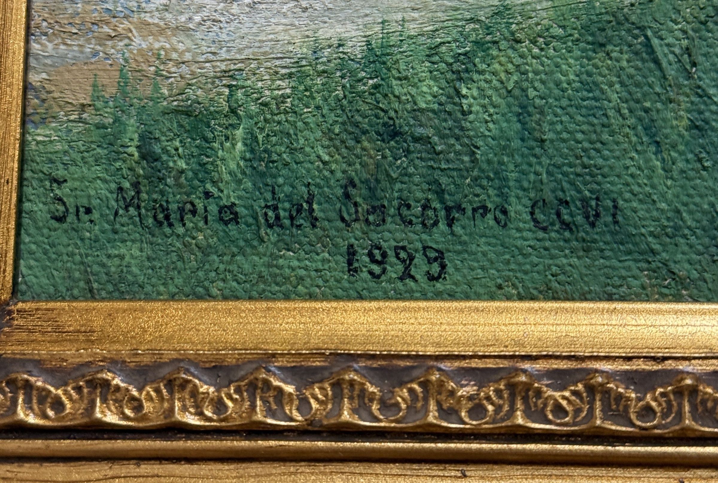 Sister María del Socorro was teaching art at St. Mary’s Academy in Amarillo, Texas in 1929, the year this painting was made. It is possible that she returned to the Motherhouse during the summer, where she could have completed this painting. La Hermana María del Socorro impartía clases de arte en la Academia Santa María de Amarillo, Texas, en 1929, año en que se pintó esta pintura. Es posible que regresara a la Casa Madre durante el verano, donde pudo haberla terminado.