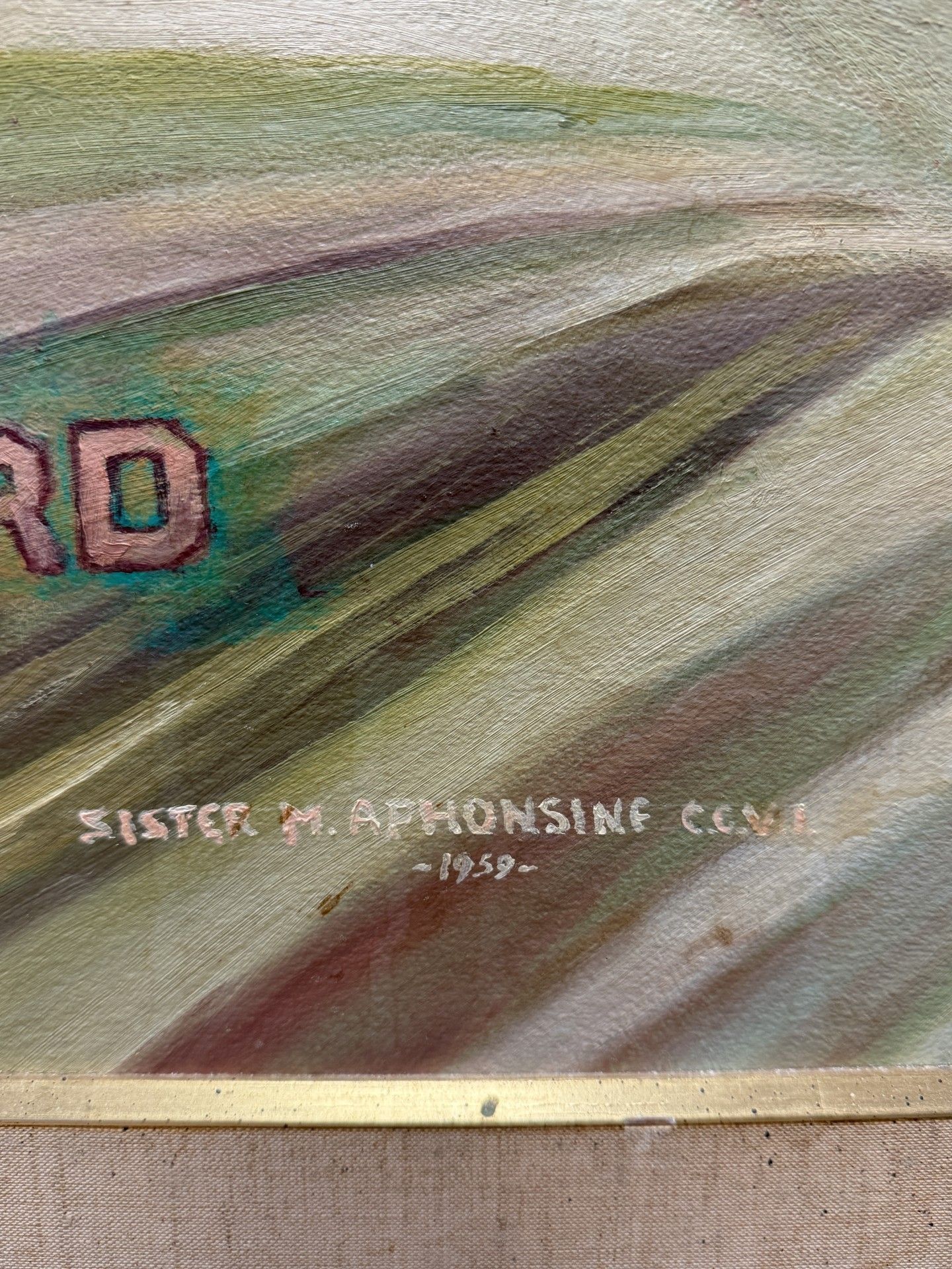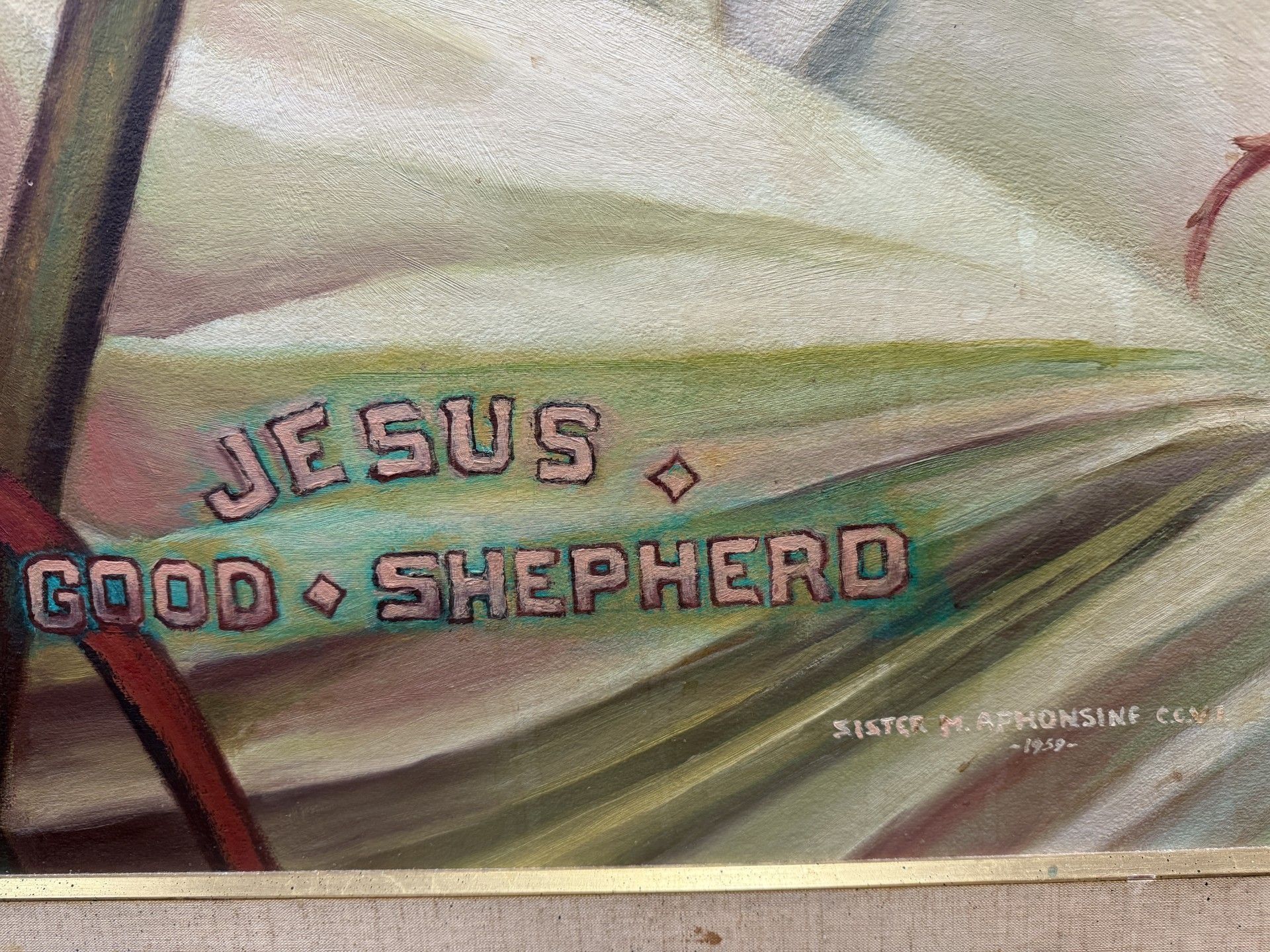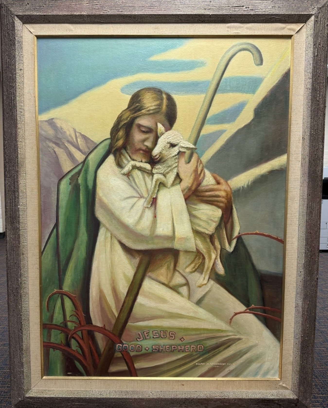 Title [assigned by artist]: Jesus Good Shepherd Sister M. Alphonsine Seiwert, CCVI (1884 – 1959) painted Jesus Good Shepherd in 1959, the final year of her life. This large-scale oil painting depicts Christ kneeling before a mountain range, cradling a lamb and clutching his shepherd’s staff. Two aspects of the painting allude to the Crucifixion: thorny branches protrude in the foreground while the lamb’s front hooves drip blood. Pink block letters announce the subject, “Jesus Good Shepherd” across the bottom middle of the canvas. The signature on this piece deviates from those of Sister Alphonsine’s other works, as she spells her name as “Aphonsine.” Título [asignado por el artista]: Jesús, el buen pastor Sor M. Alphonsine Seiwert, CCVI (1884-1959) pintó Jesús Buen Pastor en 1959, el último año de su vida. Esta pintura al óleo de gran formato representa a Cristo arrodillado ante una cordillera, acunando un cordero y agarrando su bastón de pastor. Dos aspectos del cuadro aluden a la crucifixión: unas ramas espinosas sobresalen en primer plano, mientras que las patas delanteras del cordero gotean sangre. Las letras mayúsculas de color rosa anuncian el tema, «Jesús Buen Pastor», en la parte inferior central del lienzo. La firma de esta obra difiere de las de otras obras de Sor Alphonsine, ya que escribe su nombre como «Aphonsine».