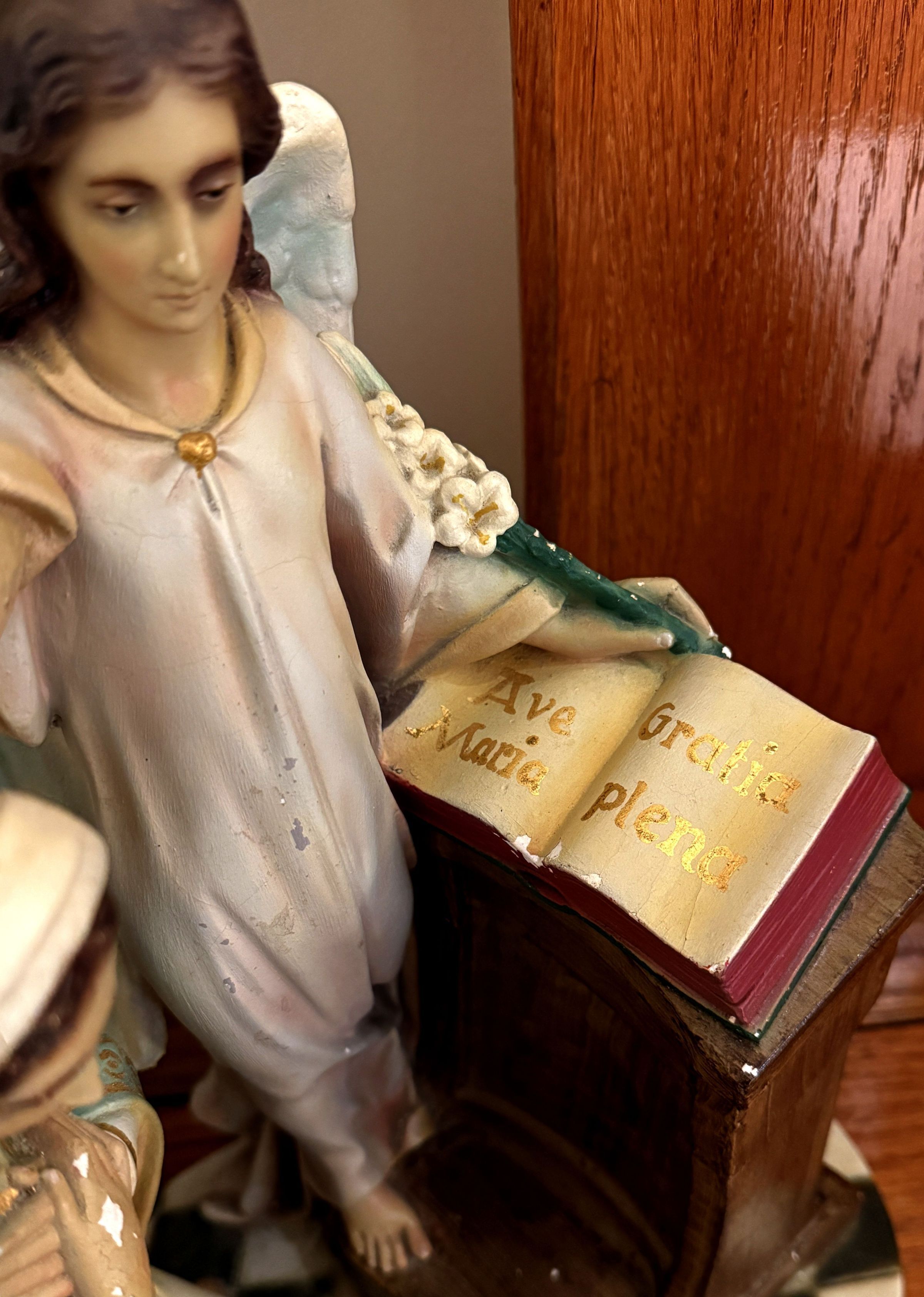 The Annunciation Statue received in the Archives on 8/2/2011 was used during the 'Angelus Devotion' at midnight on the Eve of March 25, the Feast of the Annunciation for many years, as early as the 1930s as late as the 1960s. It was placed on the sanctuary steps in front of the Communion Rail in the Chapel of the Incarnate Word. There were candles and flower around it forming a little shrine. At 11:40p.m. a small bell was rung on second, third and fourth floors to awaken the Sisters. They arose from their beds and went to the chapel where they knelt in silence until the clock struck twelve. Then they recited the Angelus once and 'The Word was made flesh and dwelt among us' nine times. This was repeated three times leaving a slight pause before beginning each Angelus. Then they returned to their beds. The 'shrine' was removed immediately afterward and stored until the next year."