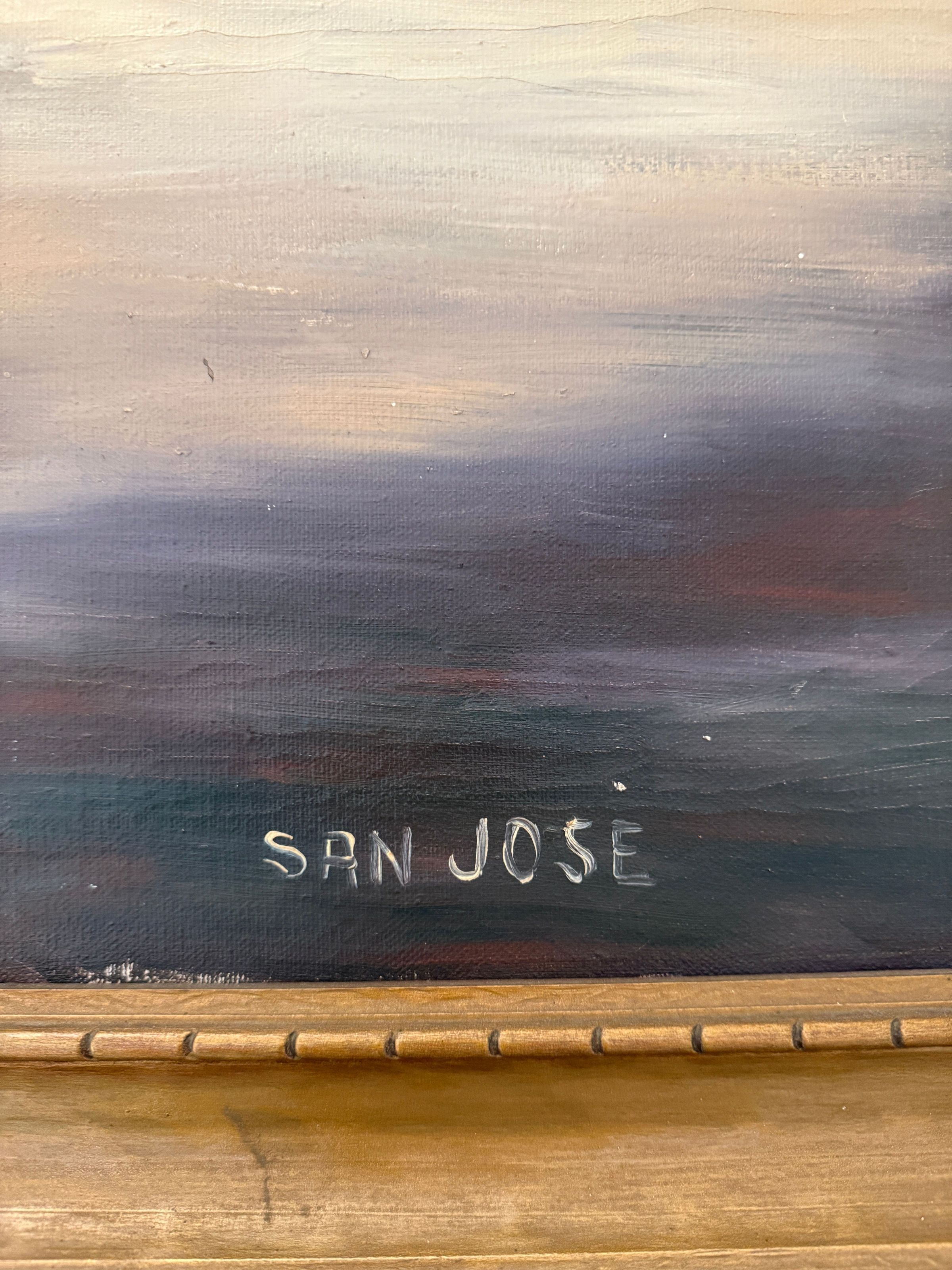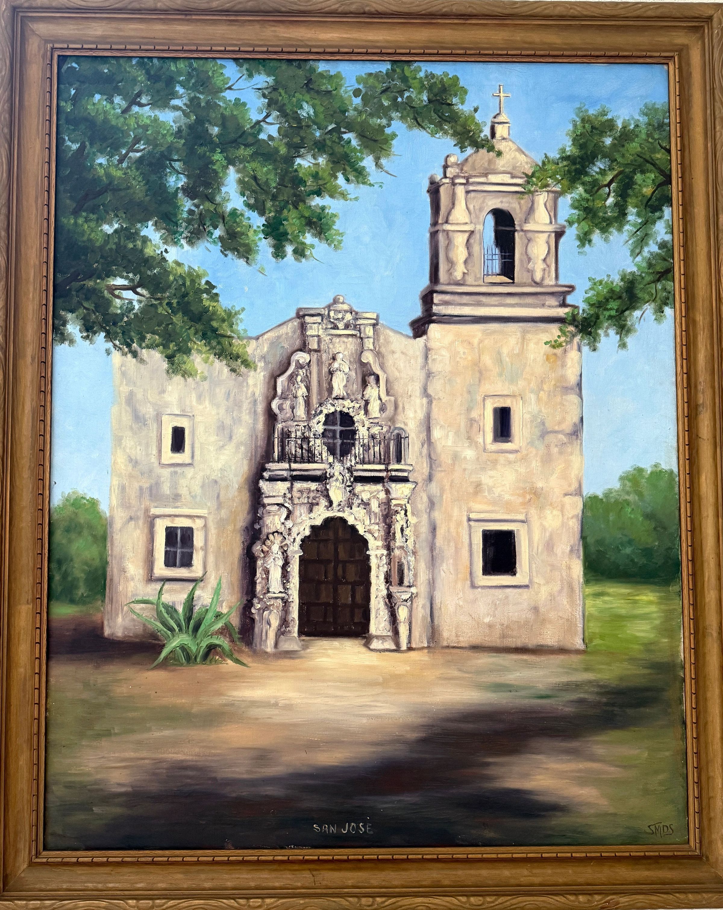 Title [assigned by artist]: San Jose Sister María del Socorro Lazo Houston, CCVI (1893 – 1956) created a series of large-scale oil paintings of the San Antonio Missions that can be found (as of 9/2025) on the University of the Incarnate Word campus. This painting, depicting the Mission San Jose, hangs in the lobby of the Bennack Concert Hall. Sister María del Socorro painted a façade view of the Mission, with the branches of oak trees arching over the top of the canvas. A single agave plant sits to the side of the entry doorway. Mission San Jose is known as the “Queen of the Missions” because it is the largest of the San Antonio Missions. It was founded in 1720 by Franciscan missionary Father Margil de Jesús. Sister Anne Quinn, CCVI wrote in 1969 about Sister María del Socorro’s love of Texan imagery, like the Missions: “She herself maintained that Texas itself was the source of her inspiration for most of her paintings. She loved Texas passionately and found an affinity with the state which somehow reflects itself in much of her paintings.” Título [asignado por el artista]: San José La hermana María del Socorro Lazo Houston, CCVI (1893-1956) creó una serie de pinturas al óleo a gran escala de las misiones de San Antonio que se pueden encontrar (a fecha de septiembre de 2025) en el campus de la Universidad del Verbo Encarnado. Esta pintura, que representa la Misión de San José, cuelga en el vestíbulo del Bennack Concert Hall. La hermana María del Socorro pintó una vista de la fachada de la misión, con las ramas de los robles arqueándose sobre la parte superior del lienzo. Una planta de agave se encuentra al lado de la puerta de entrada. La Misión de San José es conocida como la «Reina de las Misiones» porque es la más grande de las Misiones de San Antonio. Fue fundada en 1720 por el misionero franciscano padre Margil de Jesús. Sor Anne Quinn, CCVI, escribió en 1969 sobre el amor de la hermana María del Socorro por las imágenes texanas, como las misiones: «Ella misma sostenía que Texas era la fuente de inspiración de la mayoría de sus pinturas. Amaba Texas apasionadamente y sentía una afinidad con el estado que de alguna manera se refleja en muchas de sus pinturas».