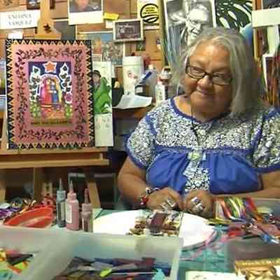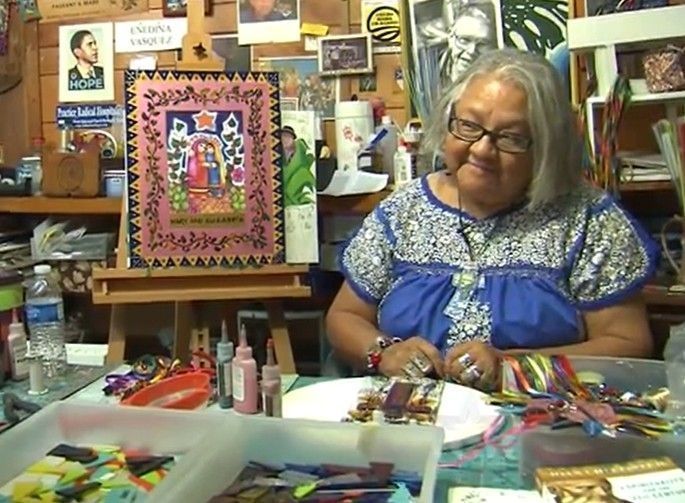 Nacida en San Antonio, Texas, Enedina Cásarez Vásquez (1945-2021) fue poeta, dramaturga, artista visual y pastor luterano. Se licenció en Bellas Artes por la Universidad Our Lady of the Lake y enseñó arte en el colegio St. Peter Prince of the Apostles y en el instituto Holy Cross High School. De 1986 a 1991, Vásquez formó parte de la primera Comisión de Bellas Artes de la ciudad de San Antonio. Entre 1987 y 2004, Enedina y su marido, Arturo Vásquez, produjeron una popular serie de piezas de arte popular bajo el nombre de Ene-Art. Sus productos, inspirados en la síntesis de la fe católica y la cultura nativa americana/chicana, incluían nichos de madera, joyas y muebles. Su obra se expuso y vendió en más de 30 galerías de arte y tiendas de regalos de museos de todo Estados Unidos. Durante varios años, la pareja también diseñó y construyó la exposición anual del Día de los Muertos en el Museo Witte. El altar del Día de los Muertos de Enedina se presentó posteriormente en Chicano Now: American Expressions, una exposición itinerante (2001-2008) patrocinada por Cheech Marin y la Institución Smithsonian. Vásquez era amiga de la fundadora y directora de Visitation House, la hermana Yolanda Tarango, CCVI. Juntas, eran miembros de Las Hermanas, una organización nacional fundada en 1971 para amplificar las voces de las hermanas y mujeres laicas latinas dentro de la Iglesia católica de los Estados Unidos. A lo largo de su carrera, Enedina donó generosamente obras de arte a Visitation House y otras organizaciones sin fines de lucro. En 1987, escribió un poema que Visitation House adoptó como su filosofía rectora: «Si te cansas de la lucha constante de los ecos de «no es tu lugar»... toma la mano de la mujer que amas. Y emprendamos nuestro vuelo». Enedina Vásquez falleció en San Antonio en 2021.