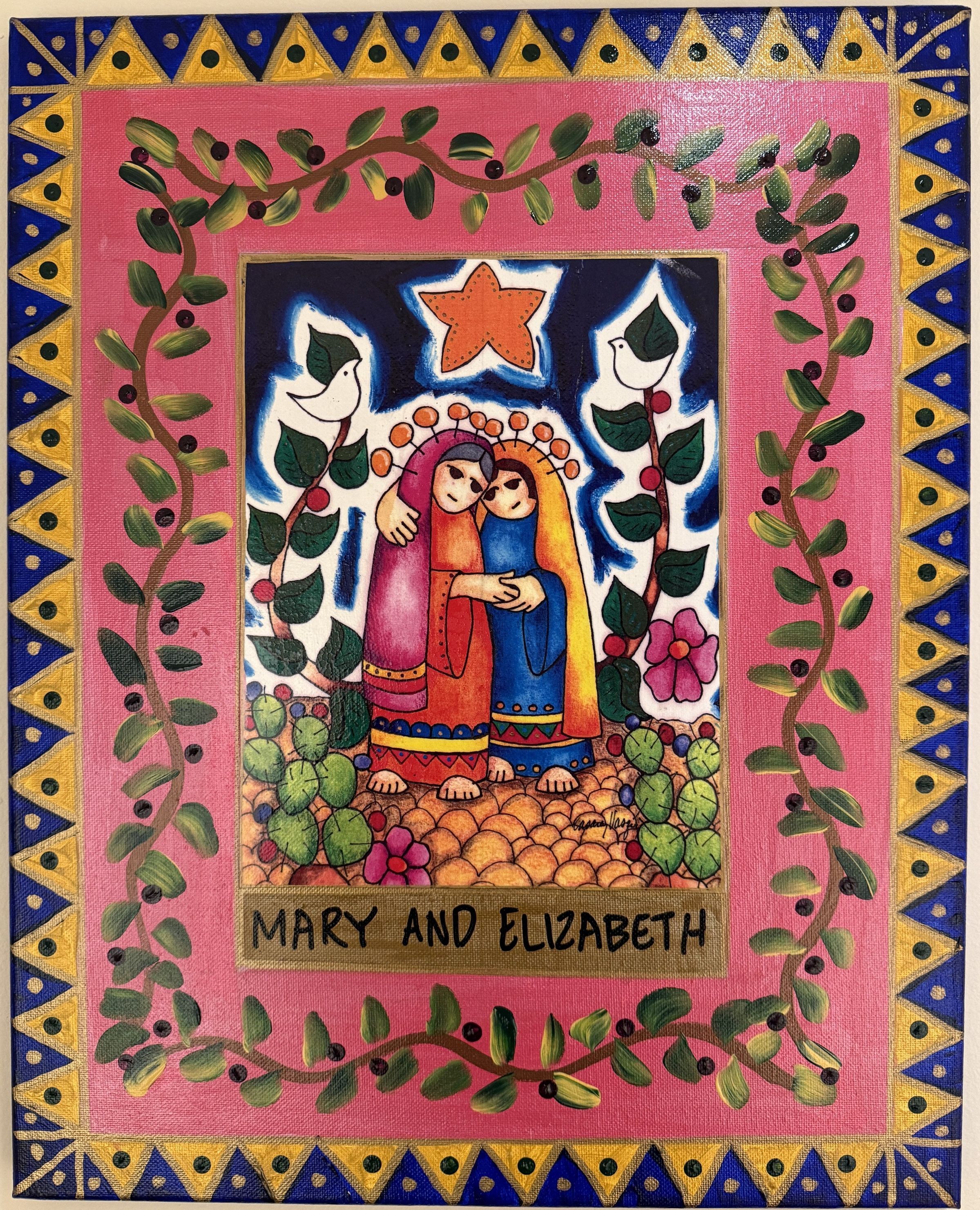 Title [assigned by artist]: Mary and Elizabeth This 2013 painting by San Antonio artist Enedina Cásarez Vásquez (1945 – 2021) belonged to Visitation House, a ministry founded by the Sisters of Charity of the Incarnate Word (CCVI) in 1985. The ministry is named after the Biblical account of Mary’s visit to Elizabeth, described at a 1989 CCVI prayer service: “Mary journeys to another town to visit, to spend time with another woman, a simple act of caring and knowing that another woman would need and/or want a companion, a friend, at this time of her life… The Sisters of Charity of the Incarnate Word knew that San Antonio was filled with women needing a home, an encouraging word, a helping hand, women who needed other women to visit with them—to spend time with them, to believe in them. On December 12, 1985, Visitation House was opened. The date, the name, the location all very carefully selected.” Enedina Vásquez pasted a printed copy of her painting of Mary and Elizabeth embracing onto the center of this canvas. Around it, Vásquez painted a pink inner border with a vine pattern and a blue and gold outer border with a geometric pattern. The names “Mary and Elizabeth” are written in black capital letters under the image of the women. Enedina’s painting of Mary and Elizabeth has been the logo for Visitation House Ministries since its inception. ///////////// Título [asignado por la artista]: María e Isabel Esta pintura de 2013 de la artista de San Antonio Enedina Cásarez Vásquez (1945-2021) pertenecía a Visitation House, una organización fundada por las Hermanas de la Caridad del Verbo Encarnado (CCVI) en 1985. La organización lleva el nombre del relato bíblico de la visita de María a Isabel, descrito en un servicio de oración de las CCVI en 1989: «María viaja a otra ciudad para visitar y pasar tiempo con otra mujer, un simple acto de cariño y de saber que otra mujer necesitaría y/o querría una compañera, una amiga, en este momento de su vida... Las Hermanas de la Caridad del Verbo Encarnado sabían que San Antonio estaba lleno de mujeres que necesitaban un hogar, una palabra de aliento, una mano amiga, mujeres que necesitaban que otras mujeres las visitaran, que pasaran tiempo con ellas, que creyeran en ellas. El 12 de diciembre de 1985 se inauguró la Casa de la Visitación. La fecha, el nombre y la ubicación fueron seleccionados con mucho cuidado». Enedina Vásquez pegó una copia impresa de su pintura de María e Isabel abrazándose en el centro de este lienzo. A su alrededor, Vásquez pintó un borde interior rosa con un patrón de enredaderas y un borde exterior azul y dorado con un patrón geométrico. Los nombres «María e Isabel» están escritos en letras mayúsculas negras debajo de la imagen de las mujeres. La pintura de María e Isabel de Enedina ha sido el logotipo de Visitation House Ministries desde su creación.