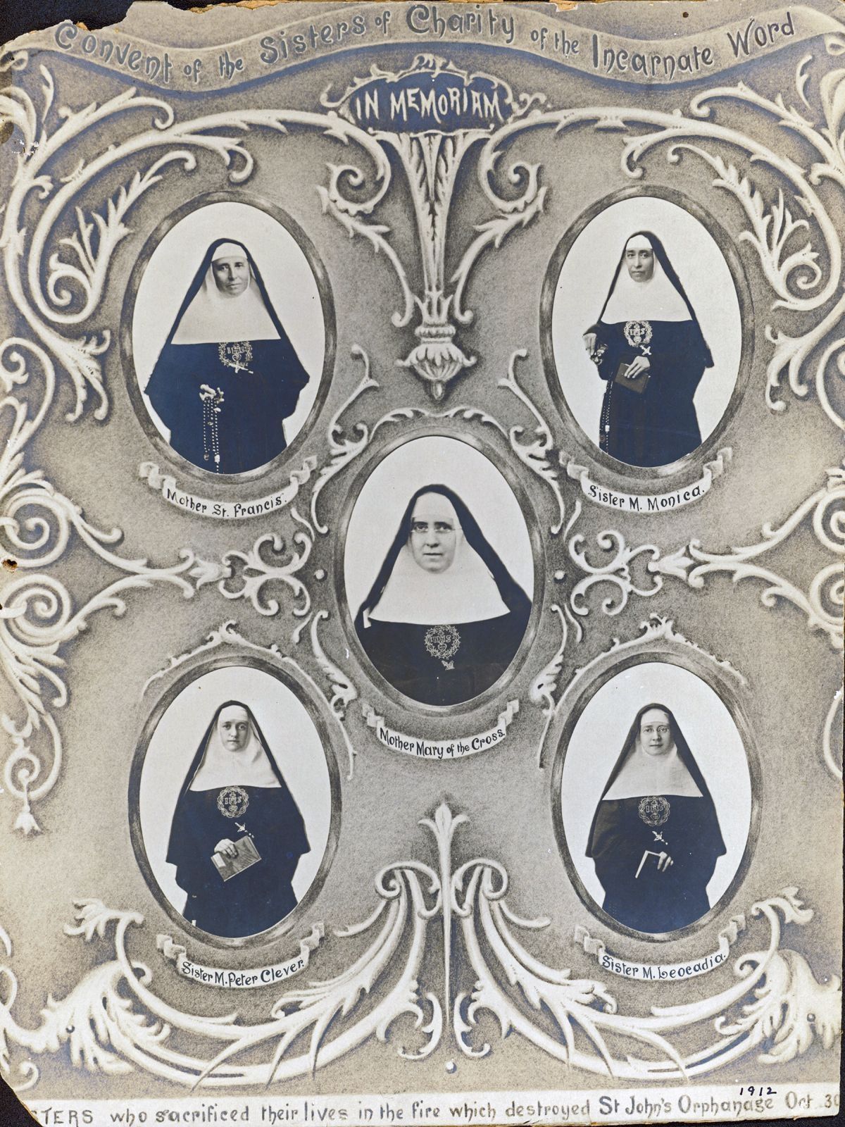 This photographic print memorializes the five Sisters of Charity of the Incarnate Word (CCVI) who perished in the fire at St. John's Orphanage in San Antonio, Texas on October 30, 1912. Sister Margaret Patrice Slattery, CCVI, wrote about the fire in Volume 1 of her 1995 book, “Promises to Keep:”