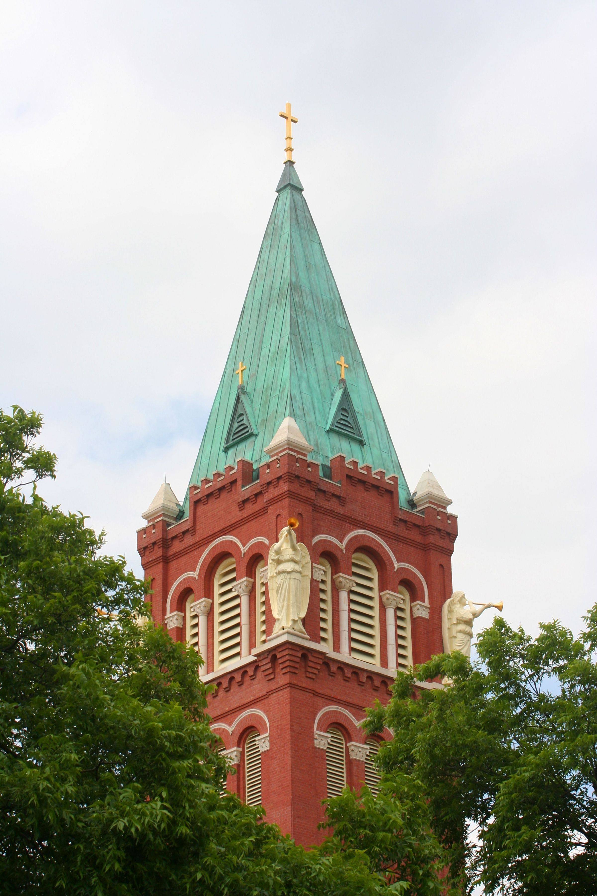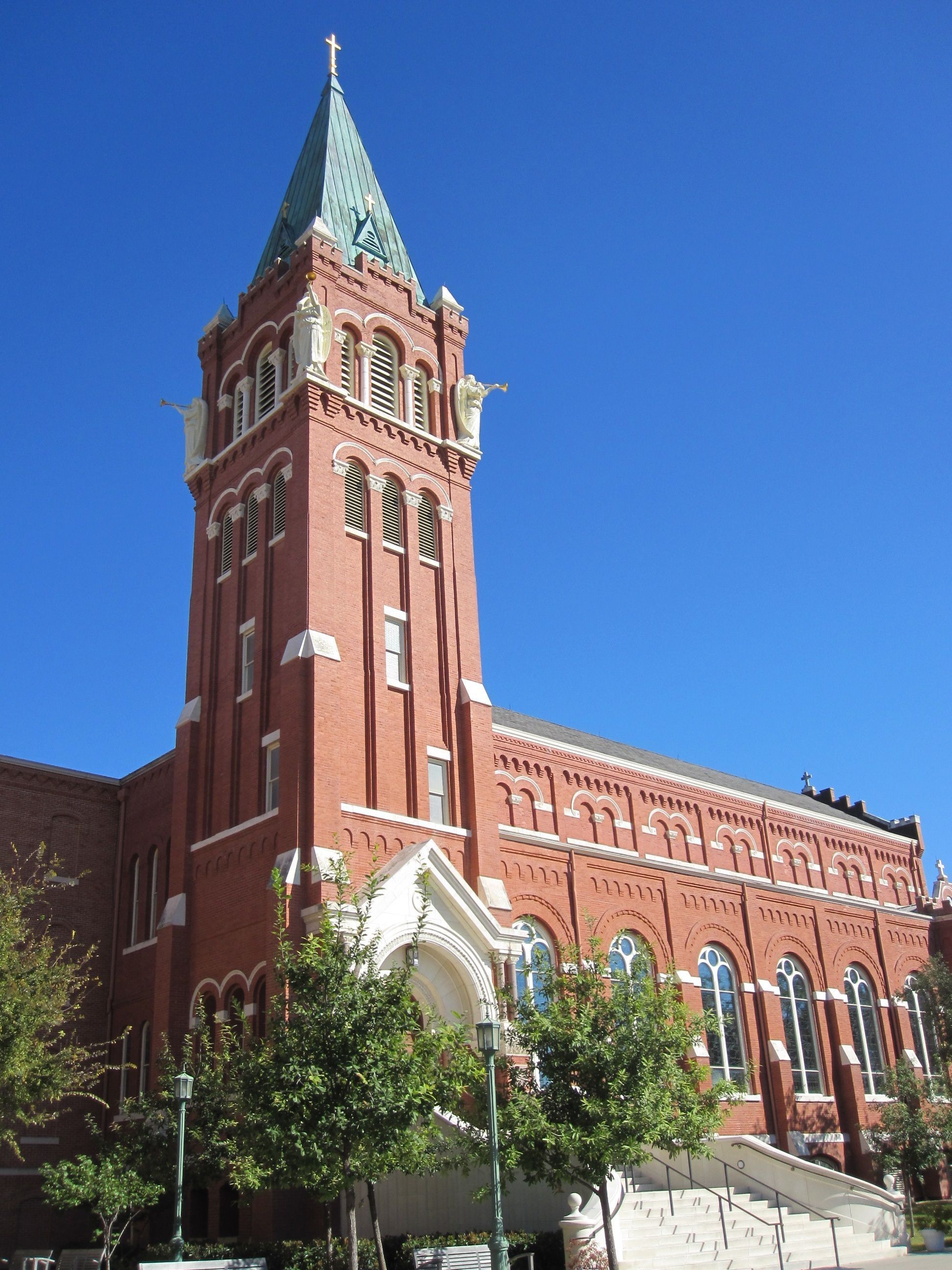 Designed in the Romanesque style of architecture, the completed chapel was an imposing structure of cathedral-size dimensions. Built of red brick with white stone facings and slate roof, the building soon became an impressive landmark in San Antonio. The towering steeple topped with a gold cross and with figures of trumpeting angels could be seen from all directions in the city.