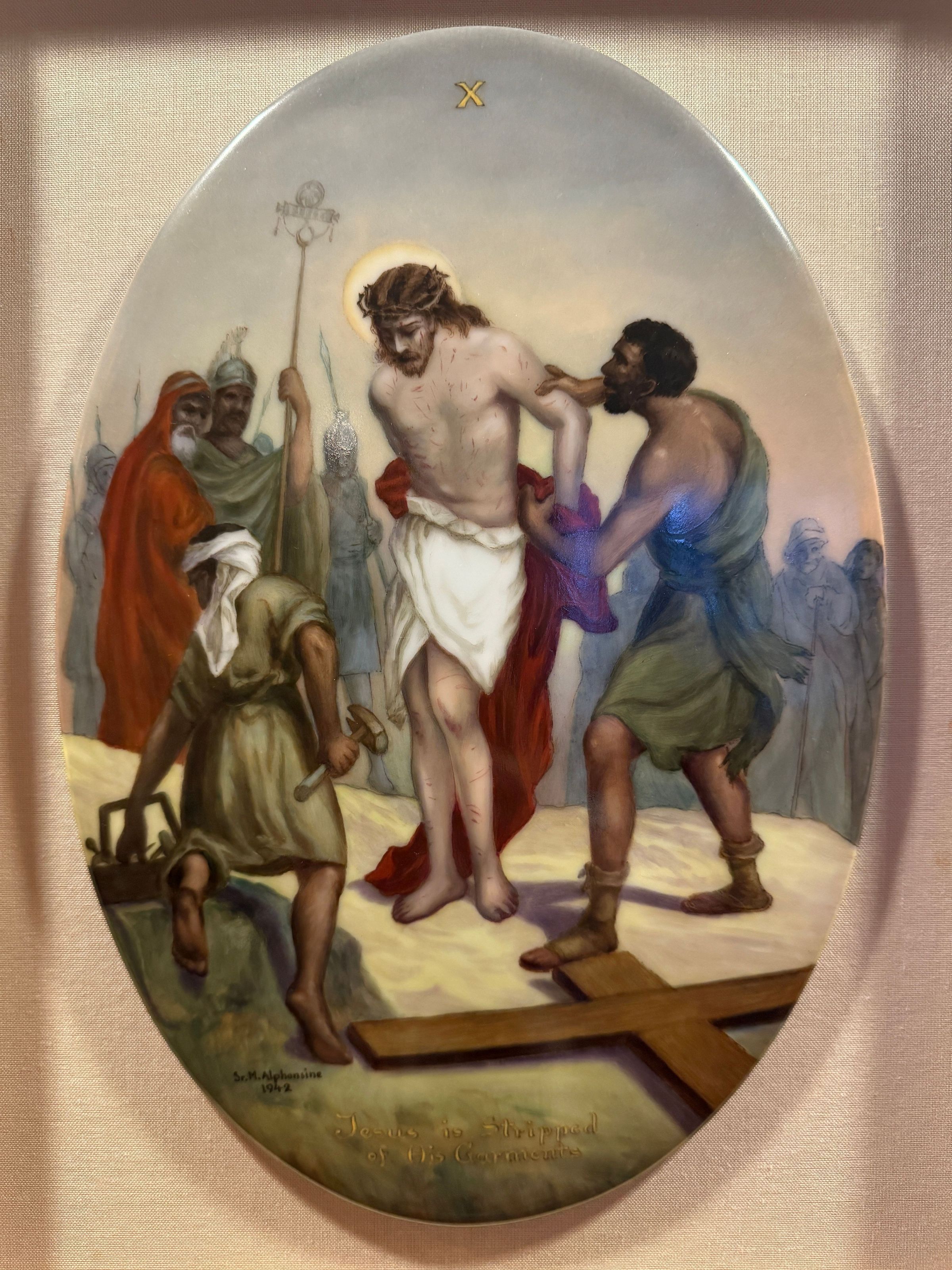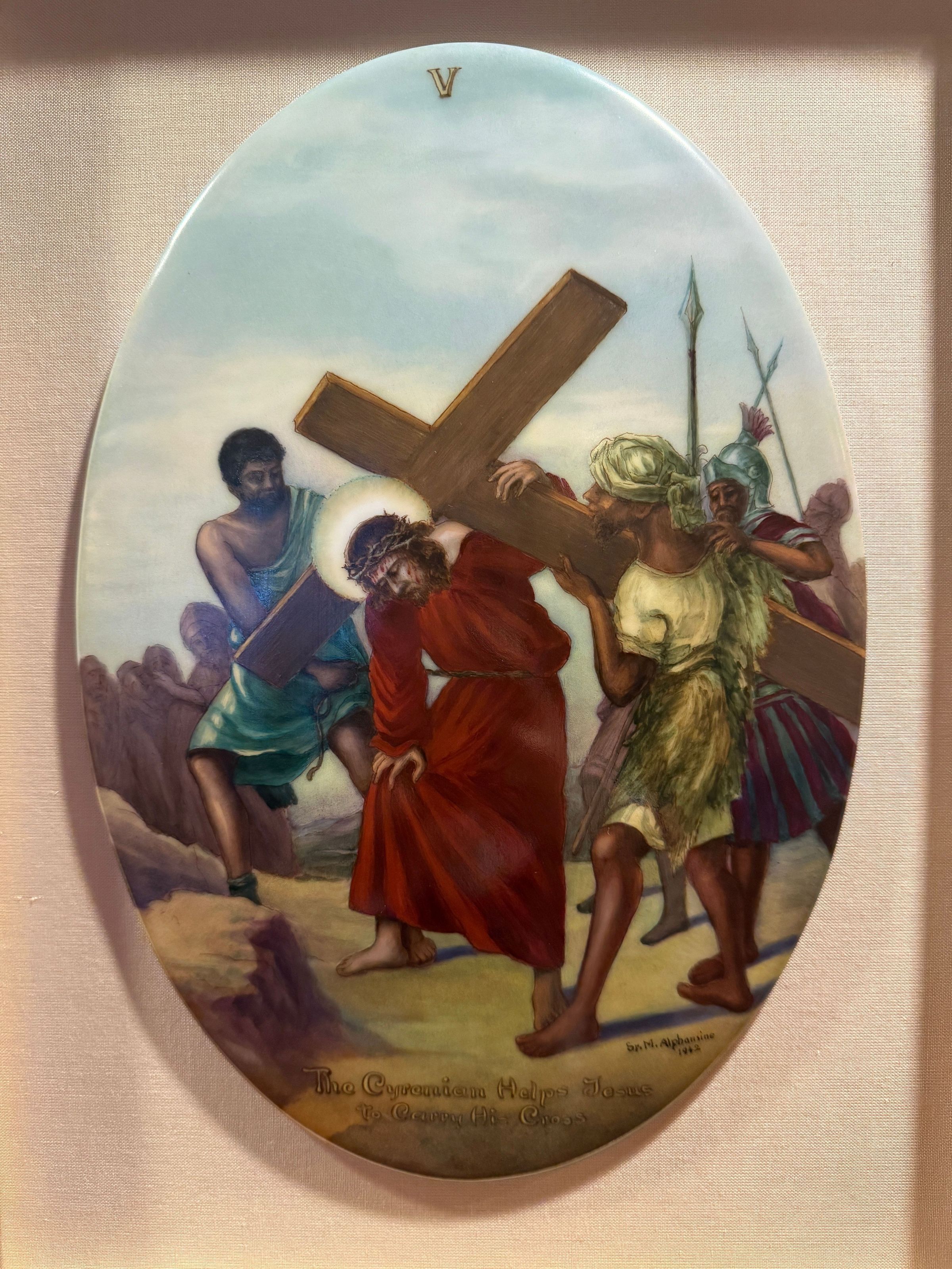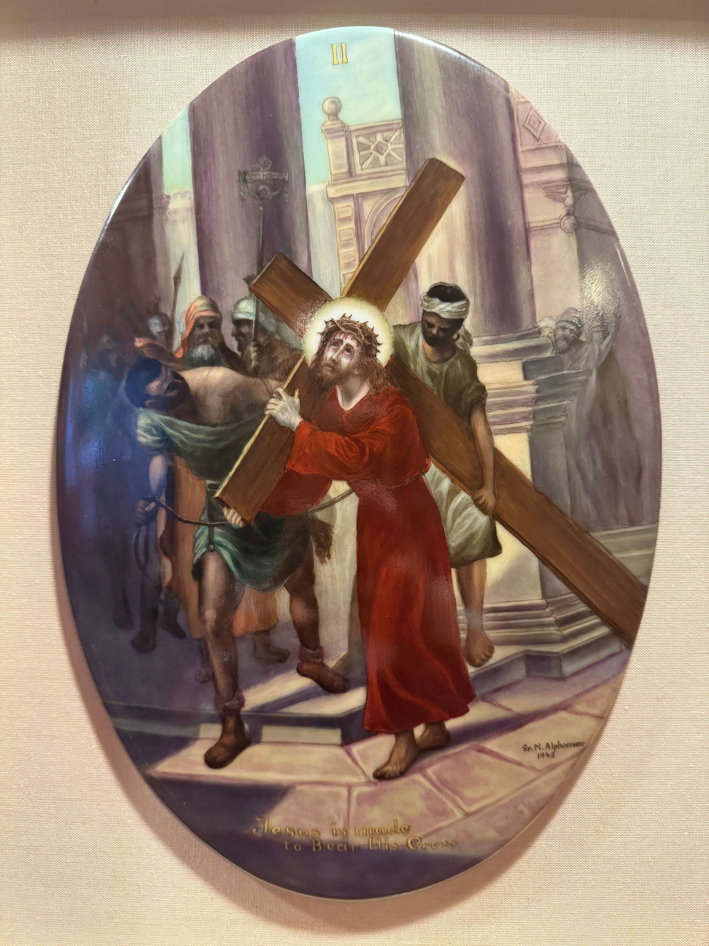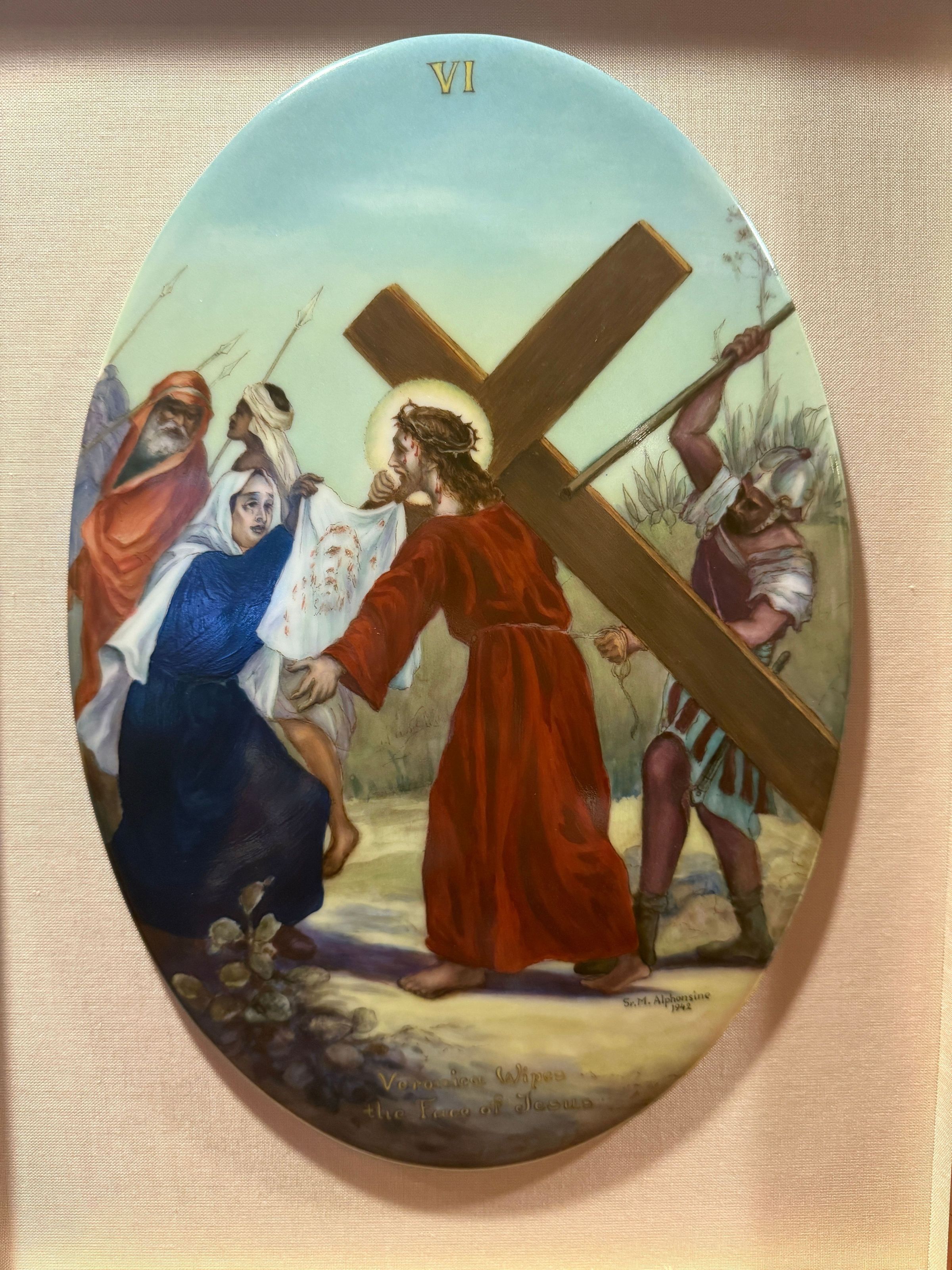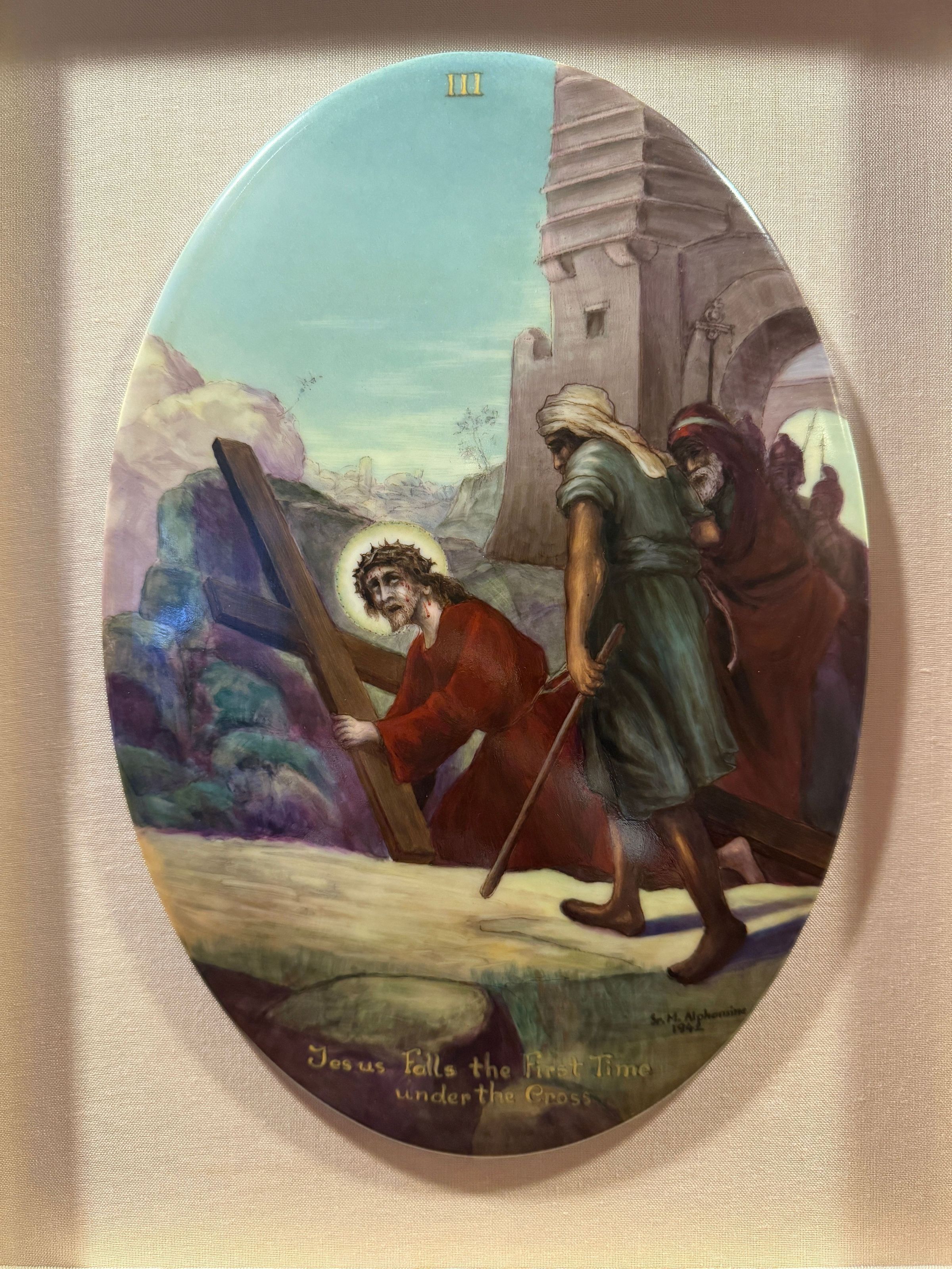 Estas catorce pinturas acrílicas representan las estaciones del Vía Crucis, una serie de imágenes de Jesucristo a lo largo del día de su crucifixión. Estas estaciones son una herramienta contemplativa que permite a los fieles realizar una peregrinación espiritual meditativa a través de la Pasión de Cristo. Sor Alphonsine Seiwert (1884-1959) captura las estaciones con un notable detalle a pequeña escala; cada imagen está finamente pintada en una placa de cerámica convexa de forma ovalada de 20 x 30 cm.