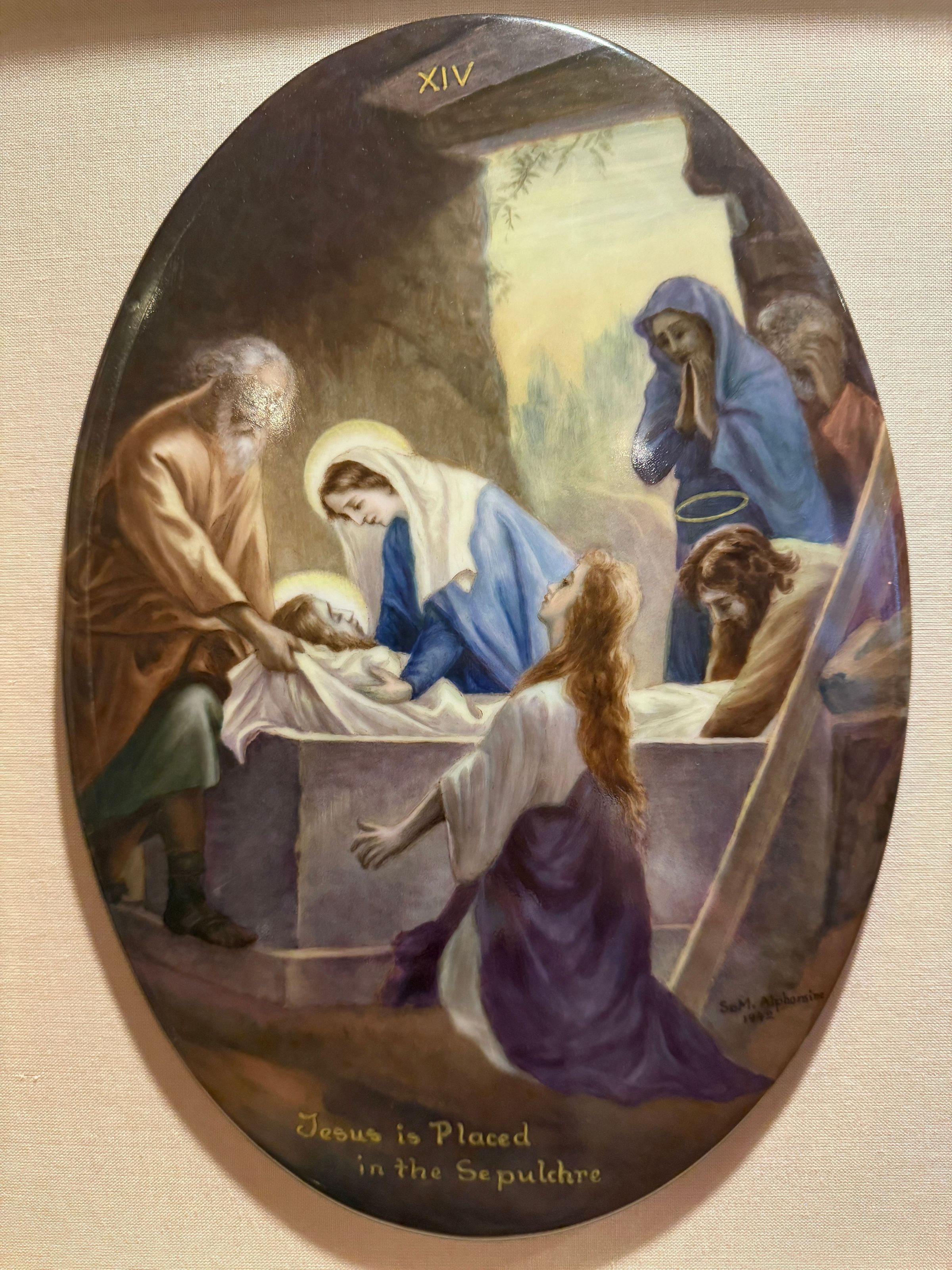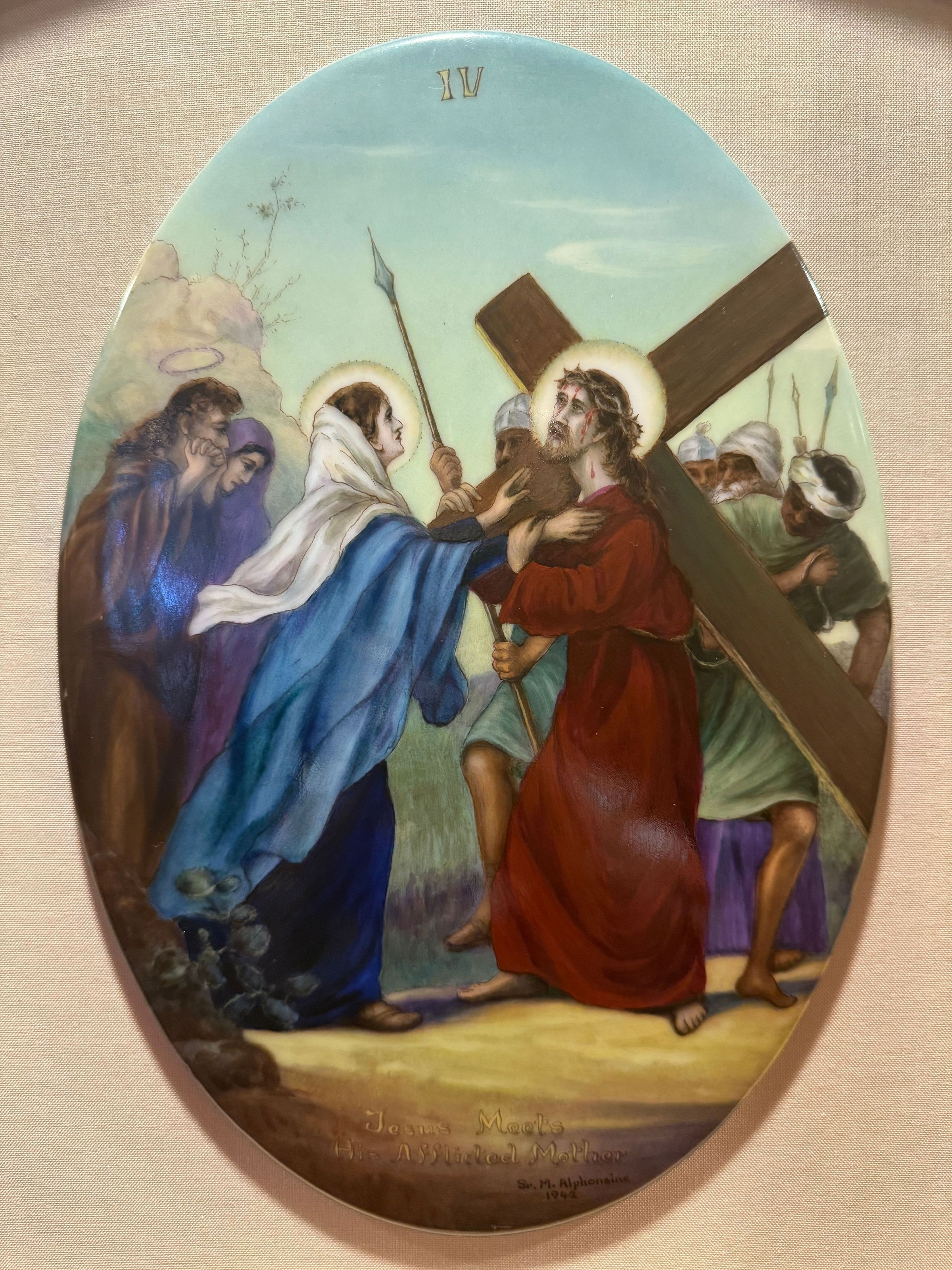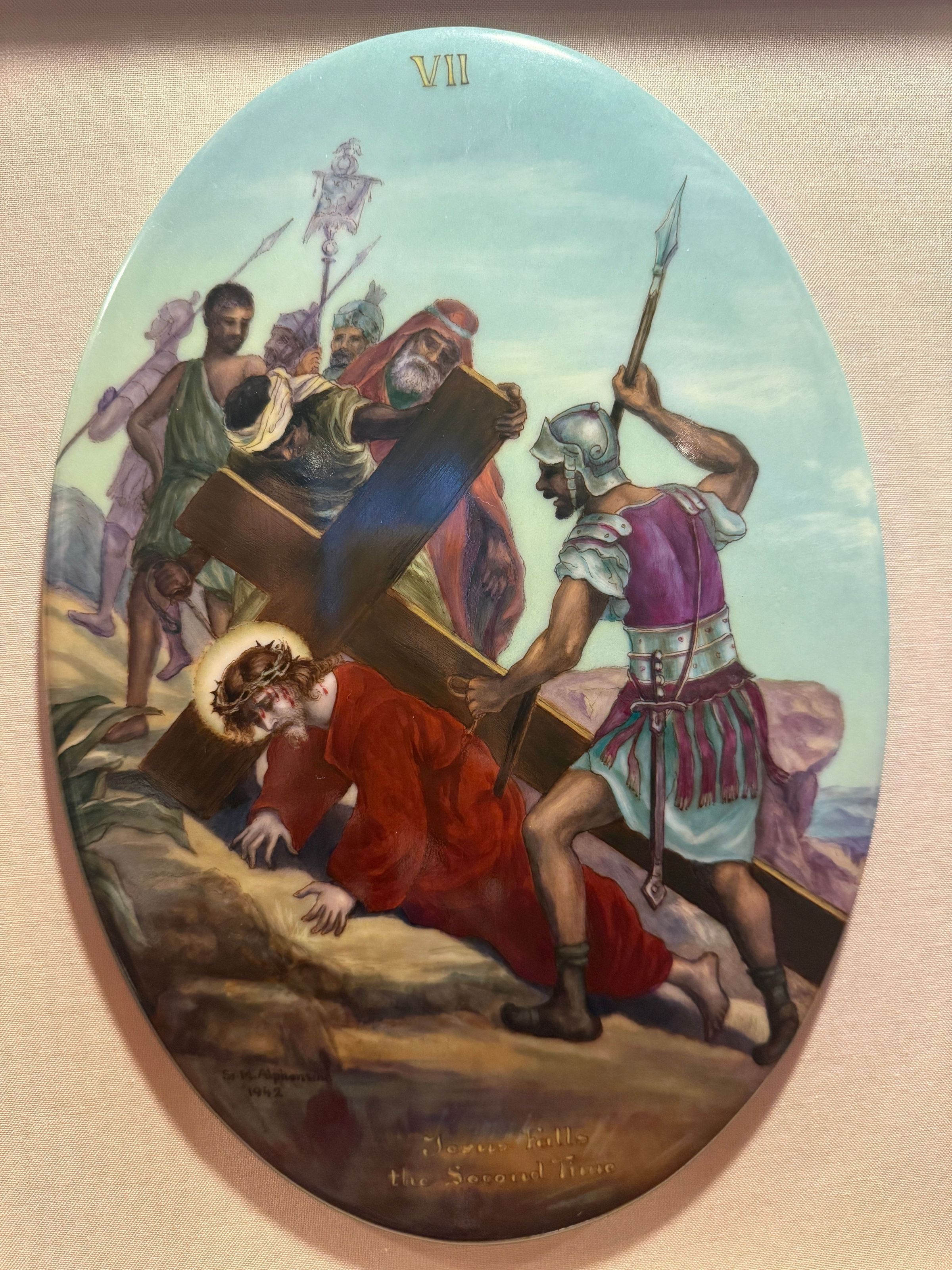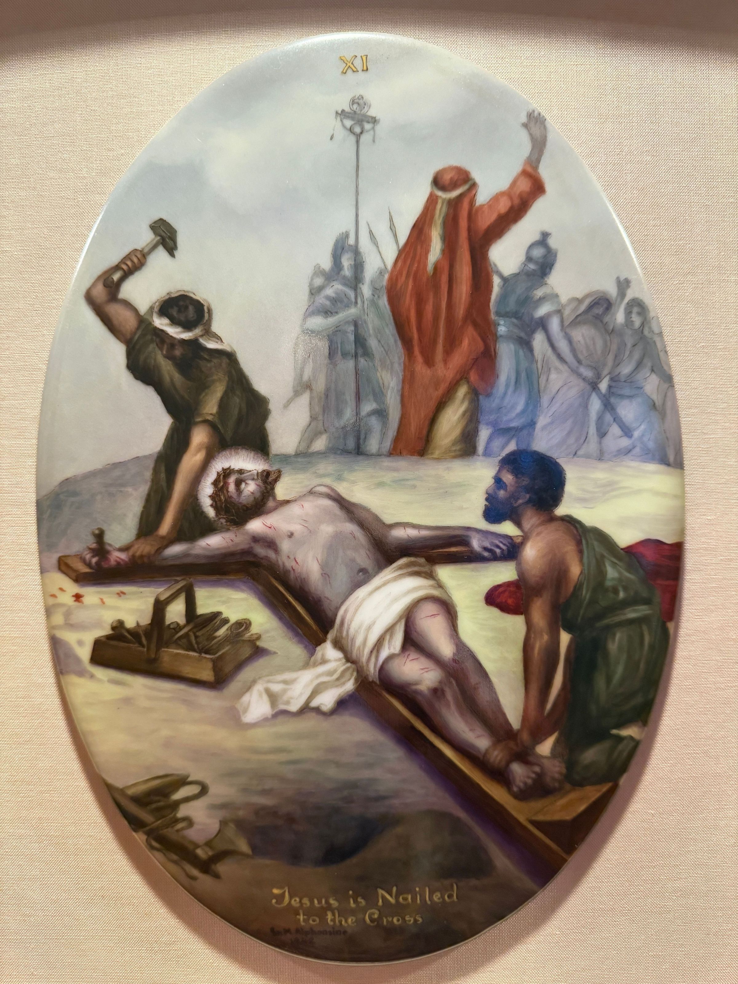 Estas catorce pinturas acrílicas representan las estaciones del Vía Crucis, una serie de imágenes de Jesucristo a lo largo del día de su crucifixión. Estas estaciones son una herramienta contemplativa que permite a los fieles realizar una peregrinación espiritual meditativa a través de la Pasión de Cristo. Sor Alphonsine Seiwert (1884-1959) captura las estaciones con un notable detalle a pequeña escala; cada imagen está finamente pintada en una placa de cerámica convexa de forma ovalada de 20 x 30 cm.