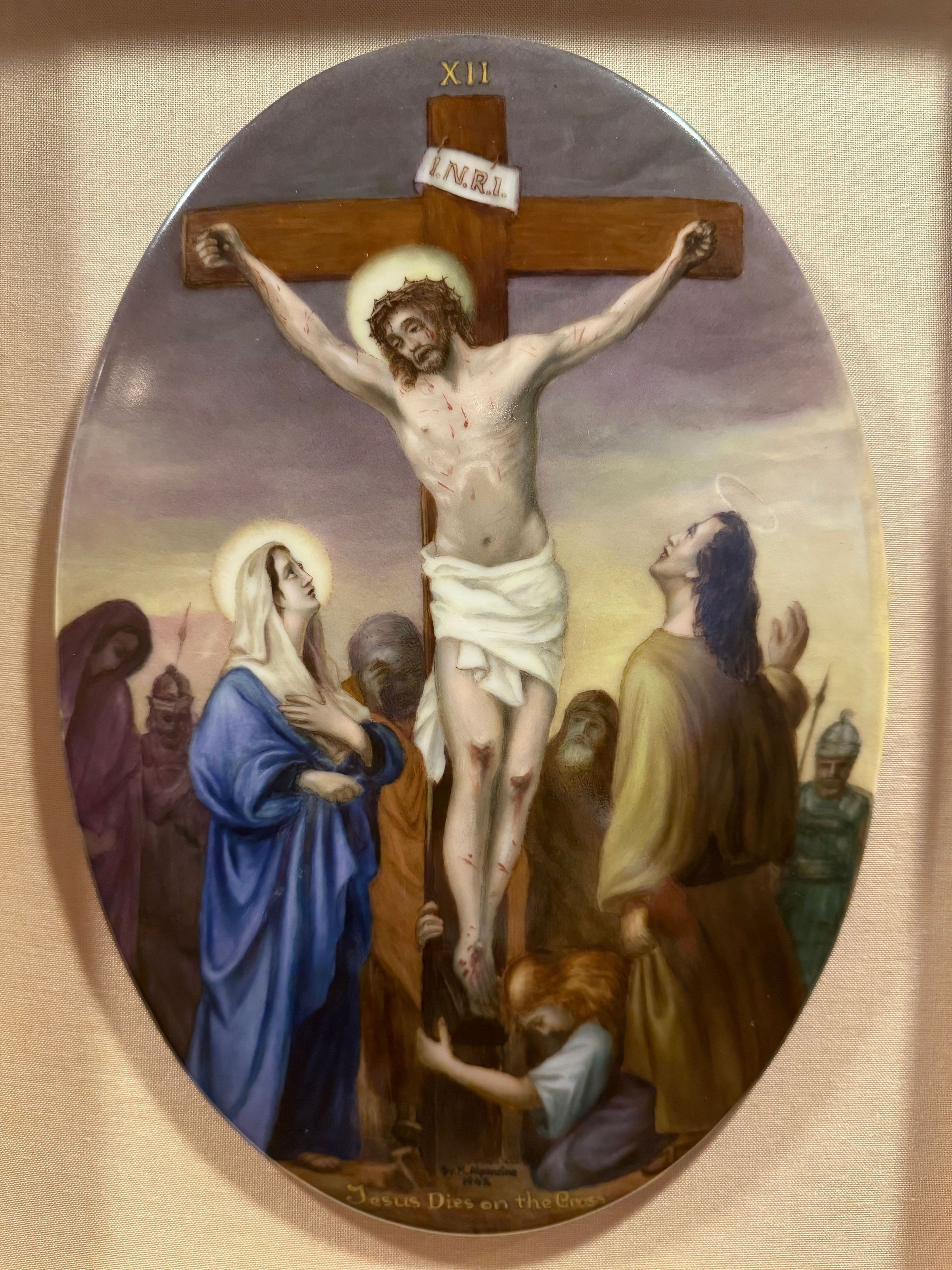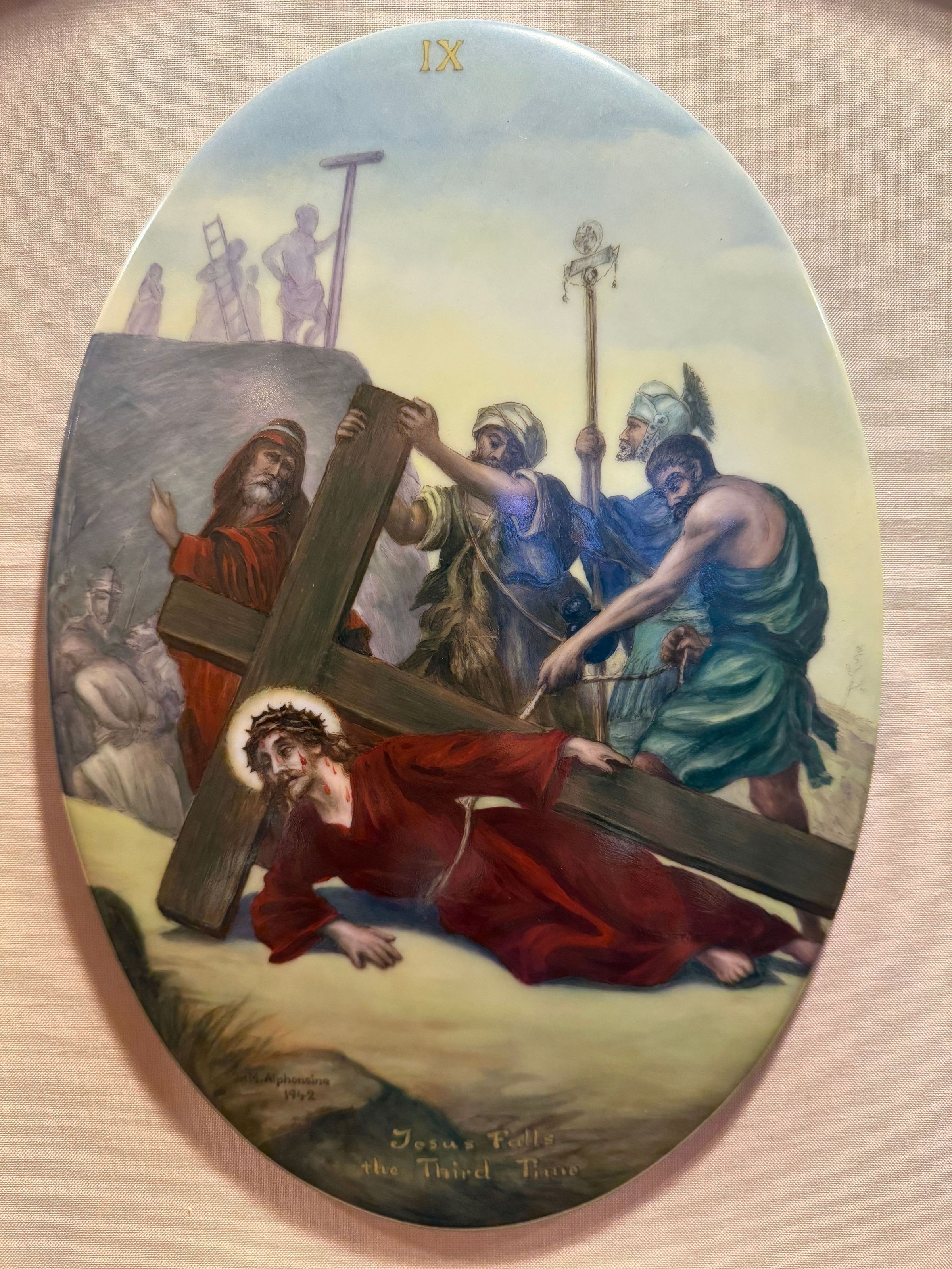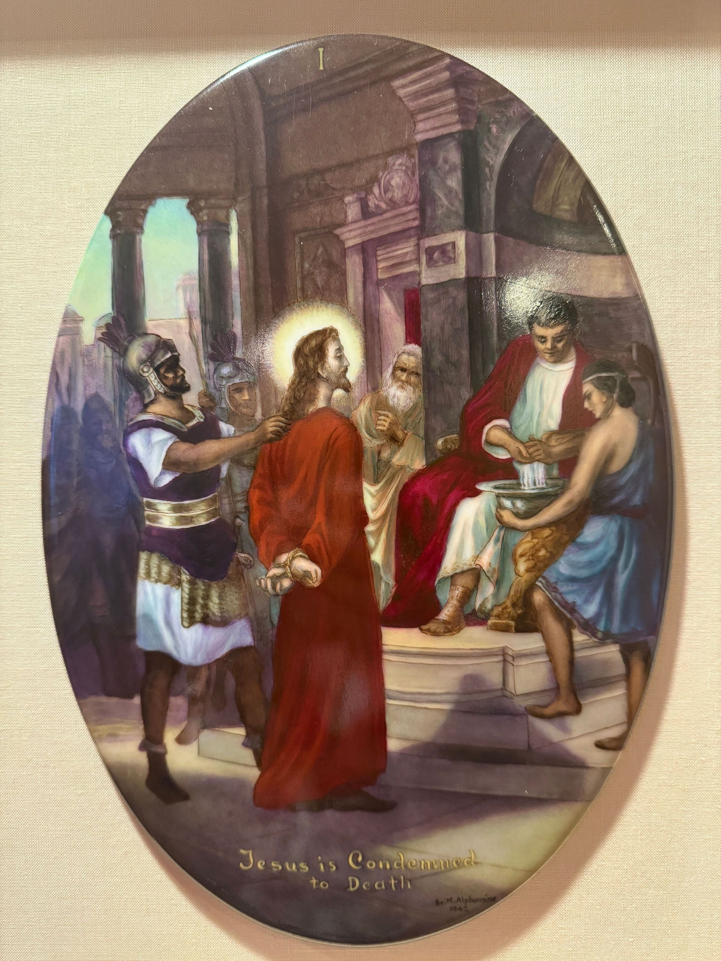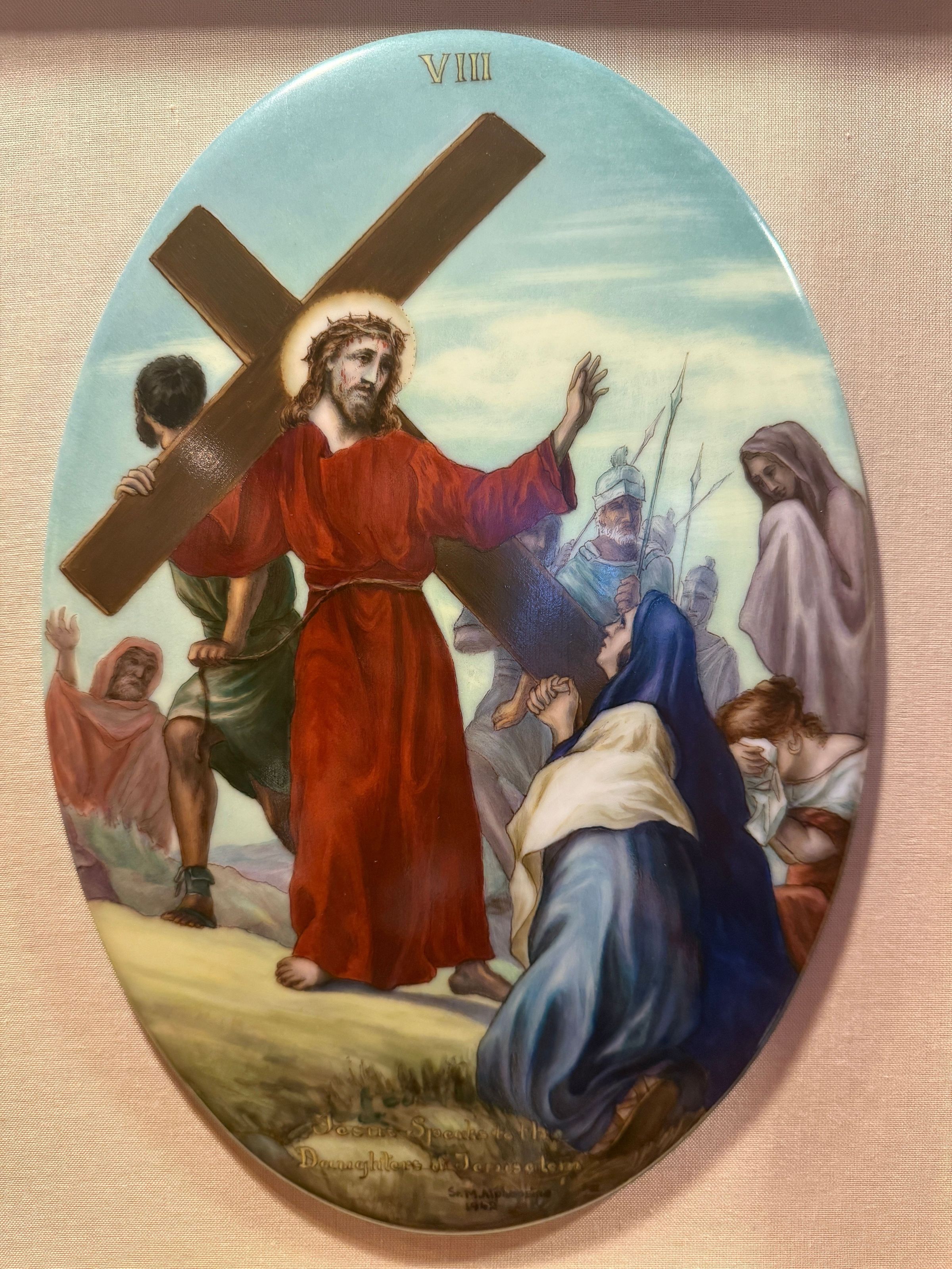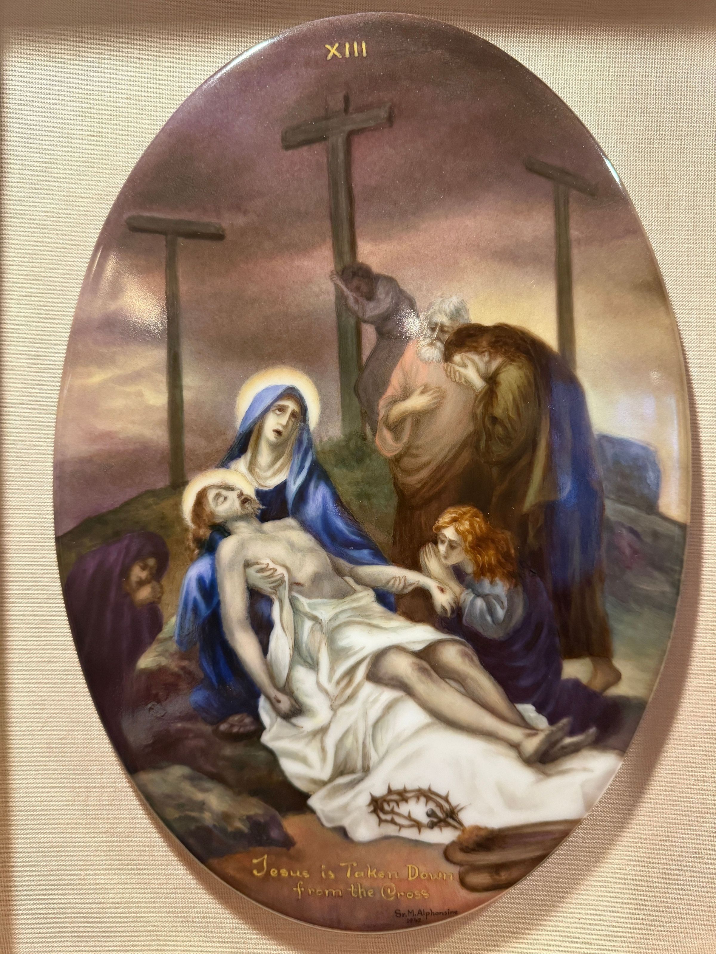 Estas catorce pinturas acrílicas representan las estaciones del Vía Crucis, una serie de imágenes de Jesucristo a lo largo del día de su crucifixión. Estas estaciones son una herramienta contemplativa que permite a los fieles realizar una peregrinación espiritual meditativa a través de la Pasión de Cristo. Sor Alphonsine Seiwert (1884-1959) captura las estaciones con un notable detalle a pequeña escala; cada imagen está finamente pintada en una placa de cerámica convexa de forma ovalada de 20 x 30 cm.
