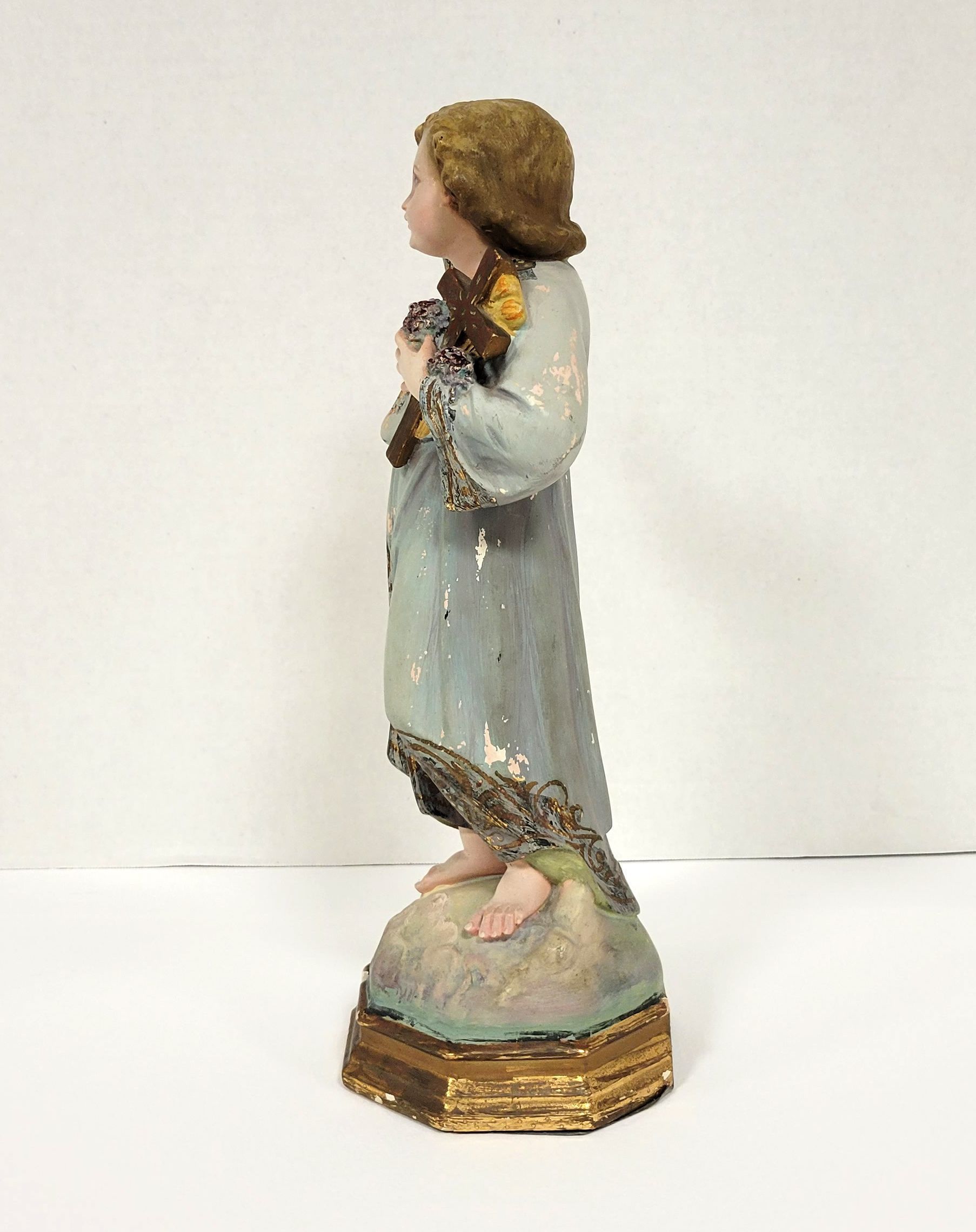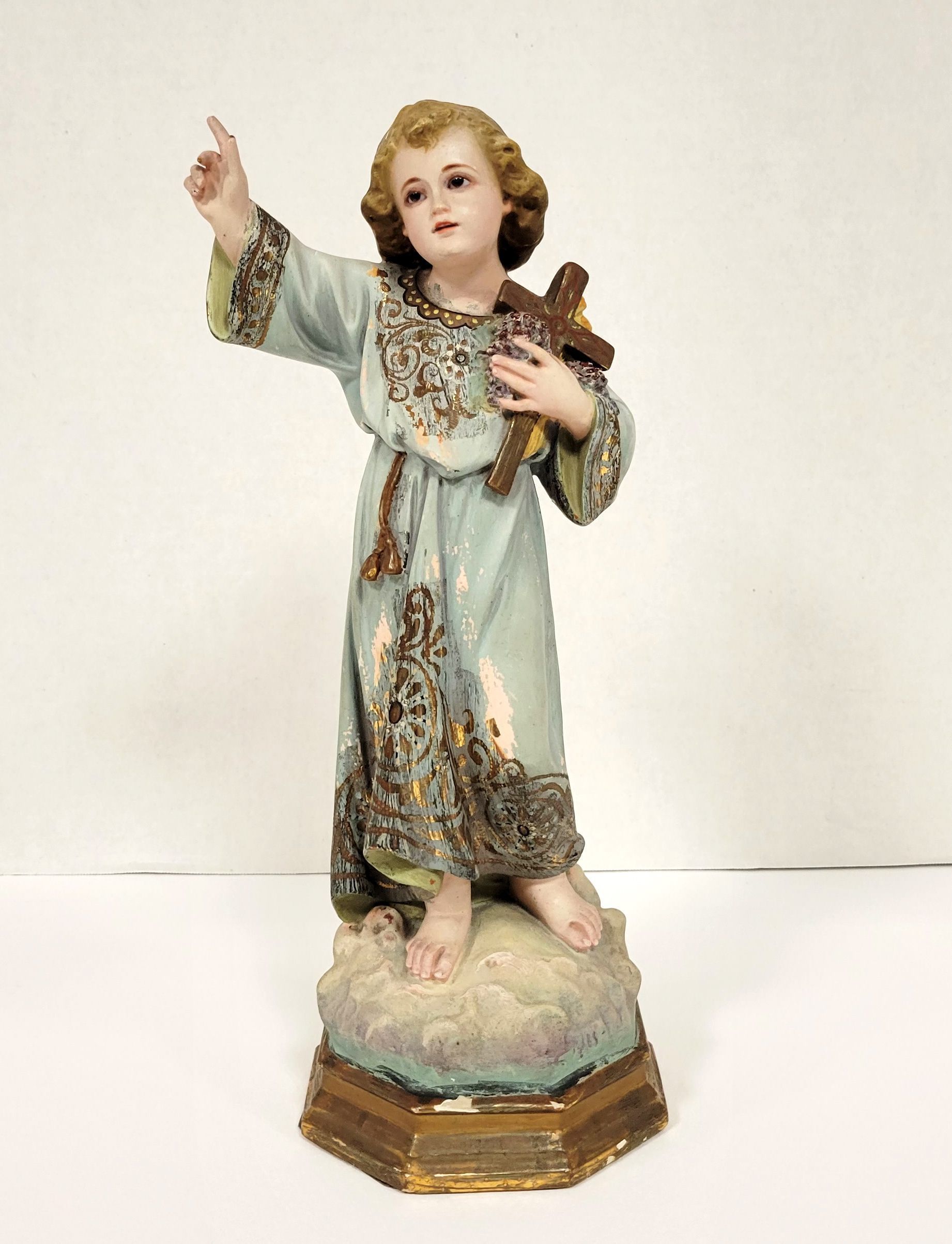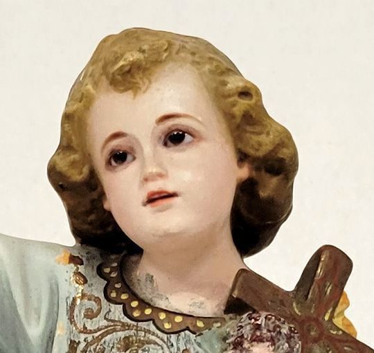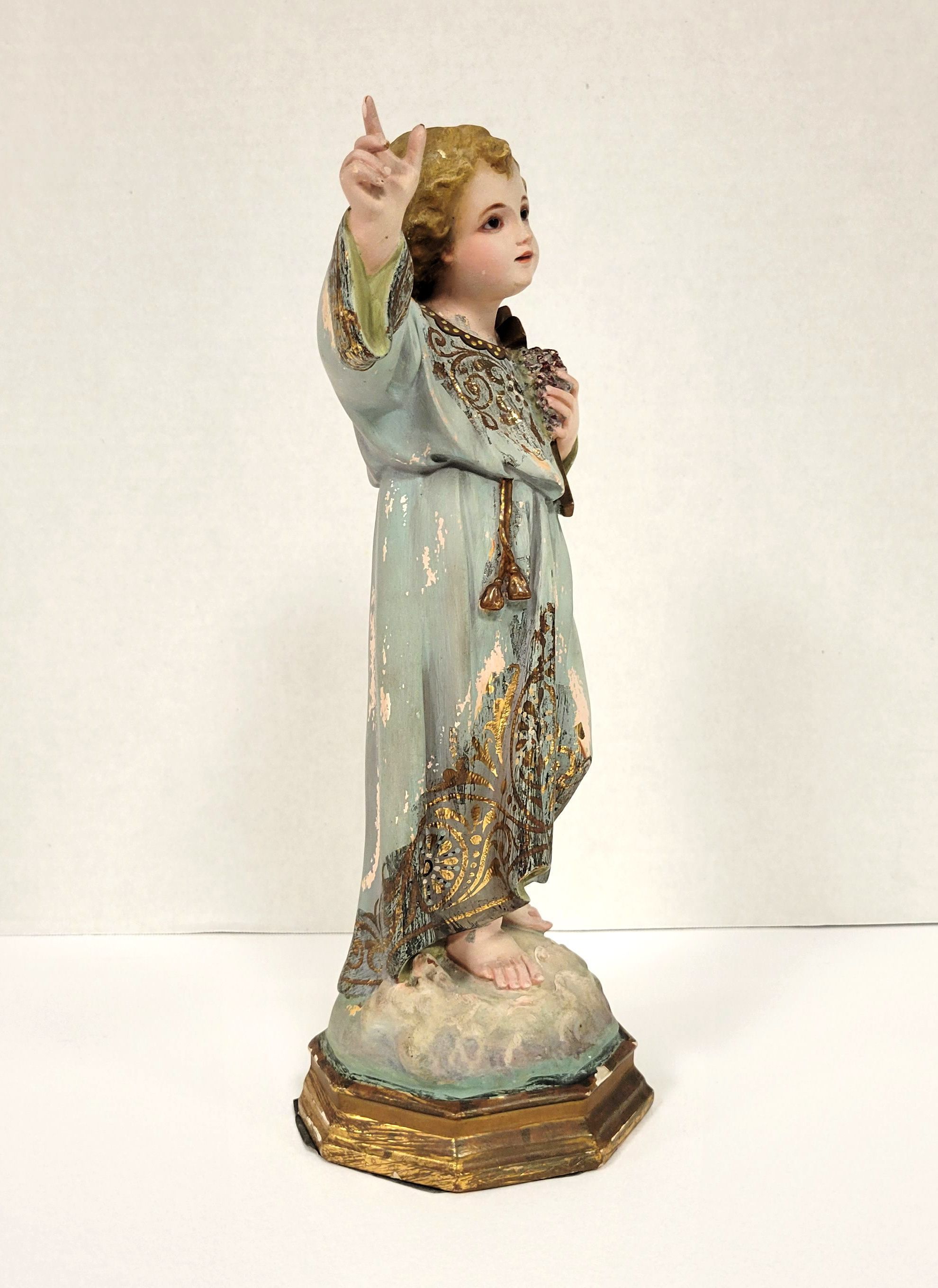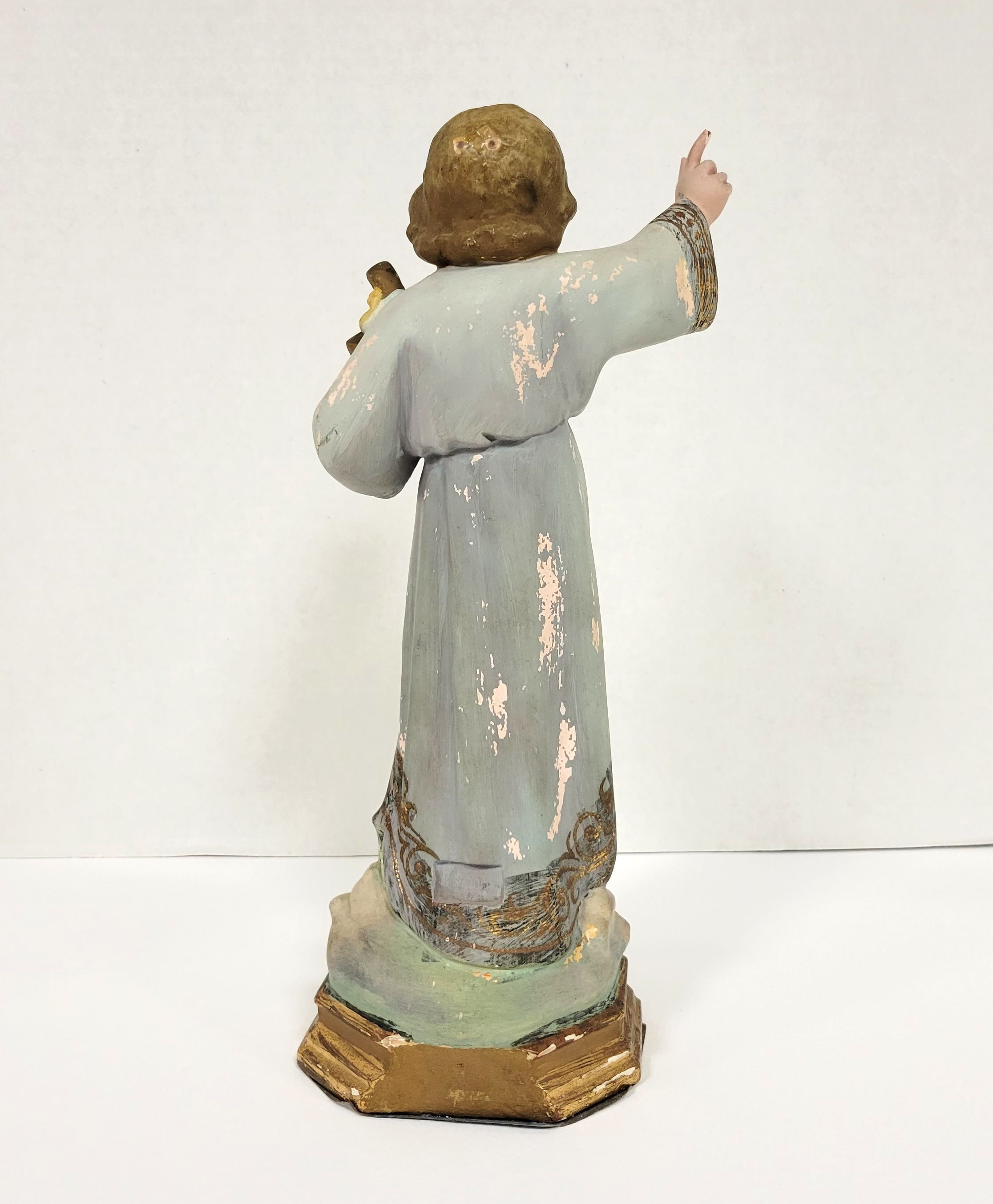 Statue of the Incarnate Word, about ten inches high, tinted blue, found in the wreckage of Spohn Hospital Corpus Christi, following the 1919 Hurricane.Language