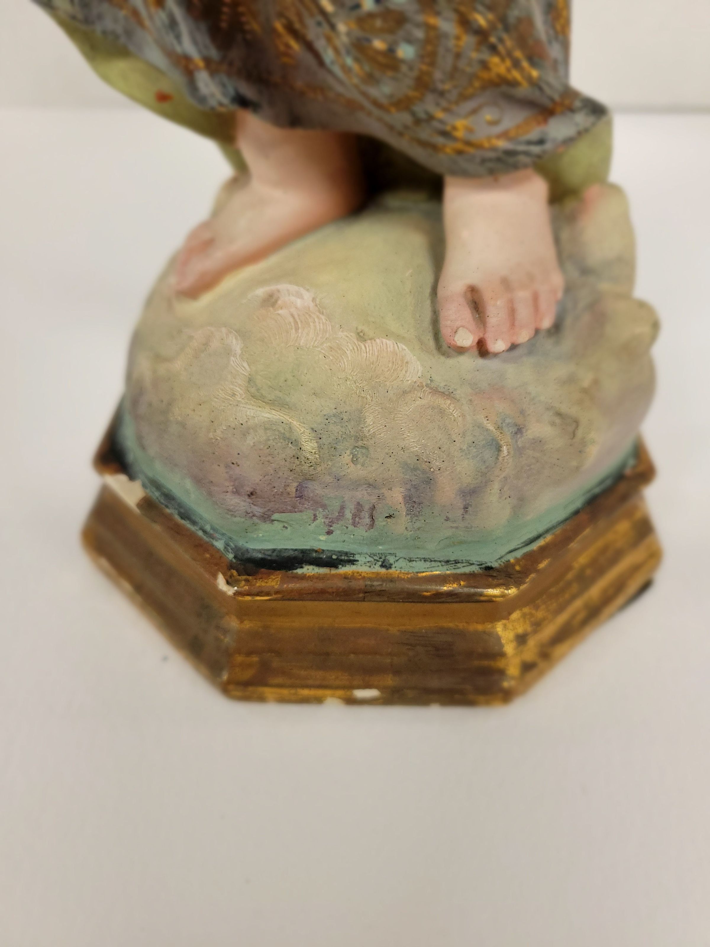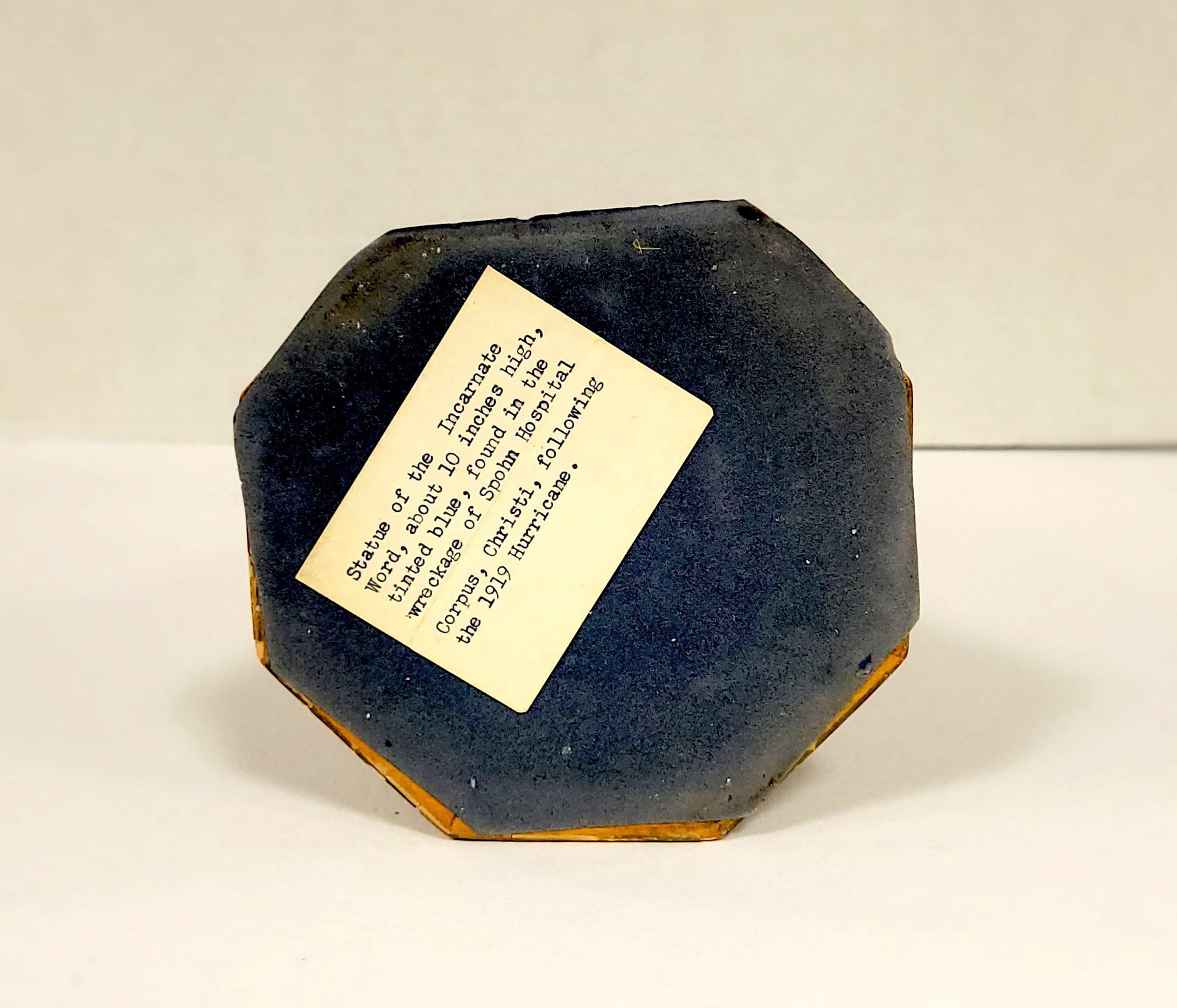 La estatua del Verbo Encarnado, de unos diez pulgadas de alto, pintada de color azul, encontrada entre los escombros del Hospital Spohn, Corpus Christi, tras el huracán de 1919.
