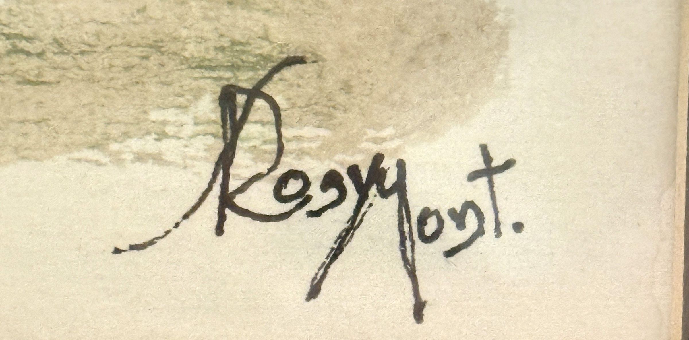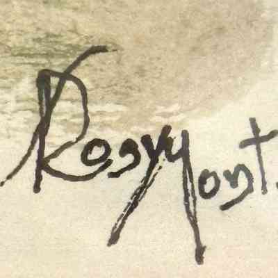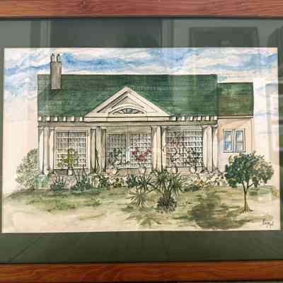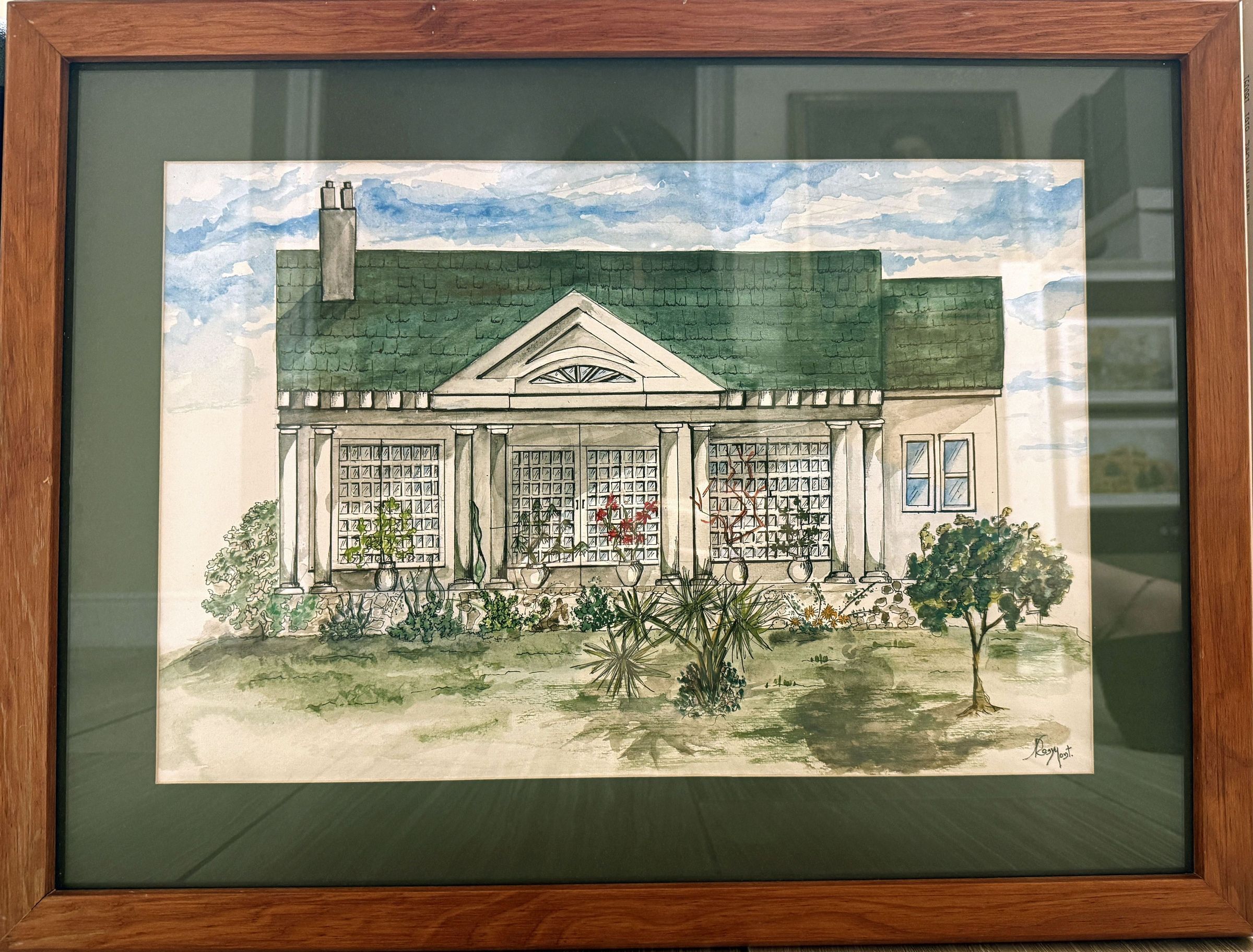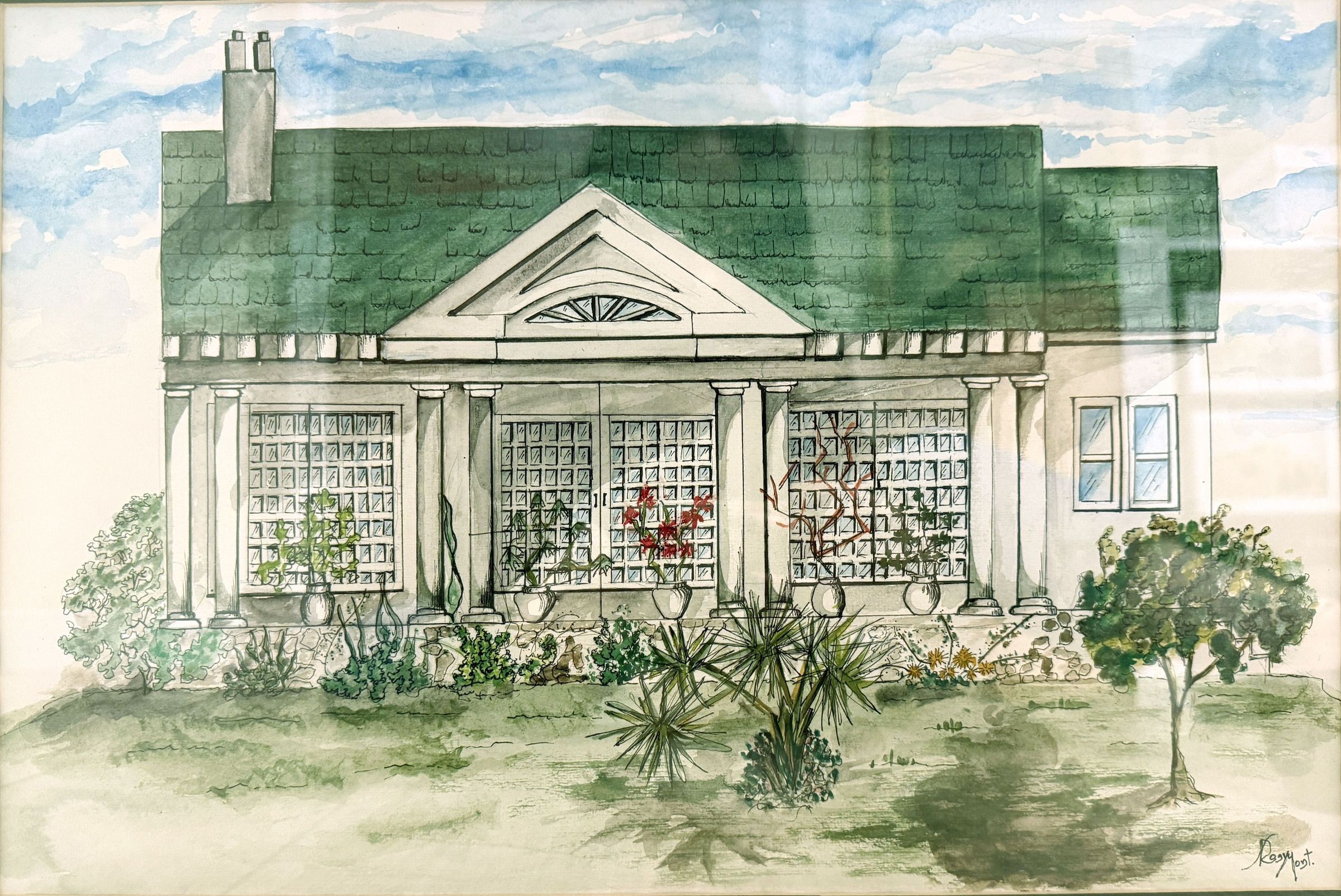 Title [assigned by archives]: White House with Green Roof In this undated watercolor, Sor Rosa María Montiel y Castellanos, CCVI (1931–2025), depicts a single-story white house with a green roof. A gable rises above the double front doors, and the façade is almost entirely lined with gridded sunroom windows. These windows overlook a small porch supported by Doric columns. Five varieties of potted plants sit along the porch, with additional greenery growing at the base of the house. A cactus and a small tree stand in the front yard. The CCVI Archives hold no records regarding the work’s provenance. However, the signature closely resembles that on Sor Rosa María’s “Church with Mountains,” supporting its attribution to her. Título [asignado por los archivos]: Casa blanca con techo verde En esta acuarela sin fecha, Sor Rosa María Montiel y Castellanos, CCVI (1931-2025), representa una casa blanca de una sola planta con techo verde. Un frontón se eleva sobre las puertas dobles de la entrada, y la fachada está casi totalmente revestida con ventanas enrejadas. Estas ventanas dan a un pequeño porche sostenido por columnas dóricas. Hay cinco variedades de plantas en macetas a lo largo del porche, y más vegetación creciendo en la base de la casa. En el jardín delantero hay un cactus y un pequeño árbol. Los archivos de CCVI no contienen registros sobre la procedencia de la obra. Sin embargo, la firma se asemeja mucho a la de «Iglesia con montañas», de Sor Rosa María, lo que respalda su atribución a ella.