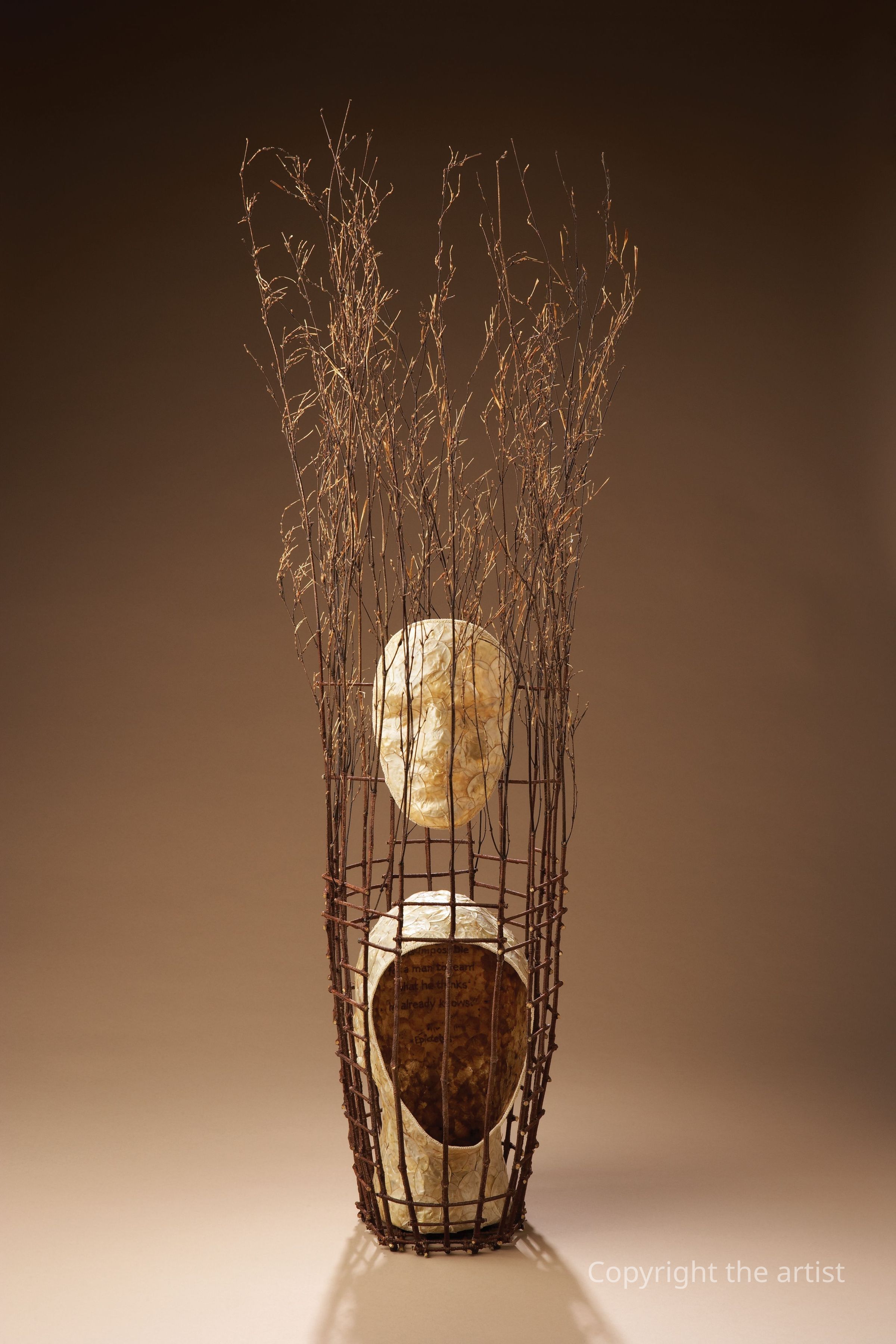 silver dollar pod centers, weathered hydrangea petals, black bamboo, paper and waxed linen