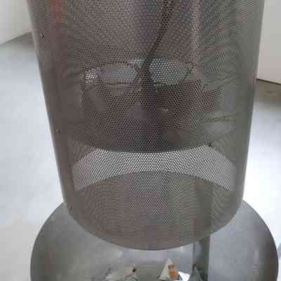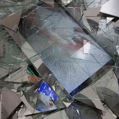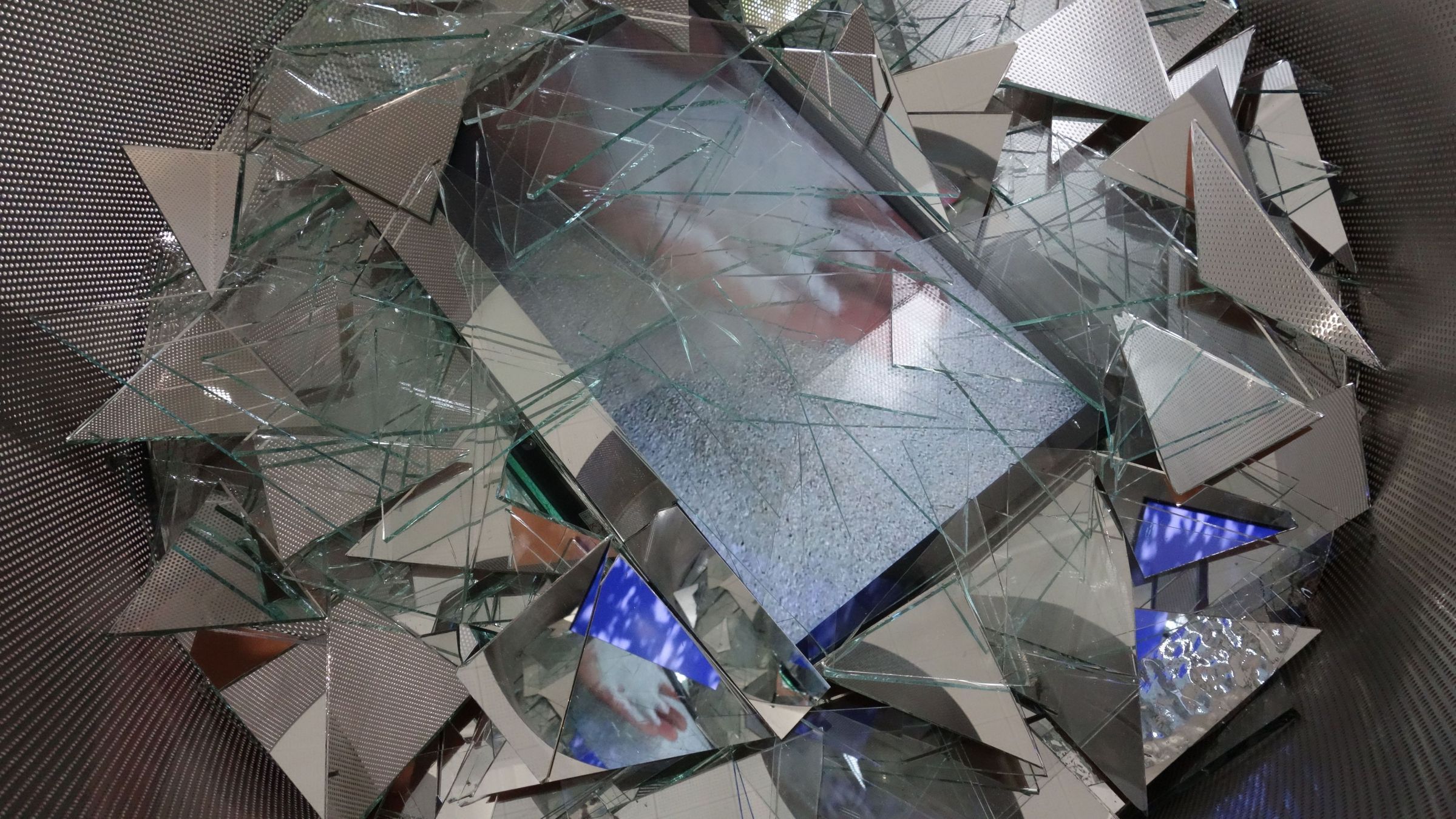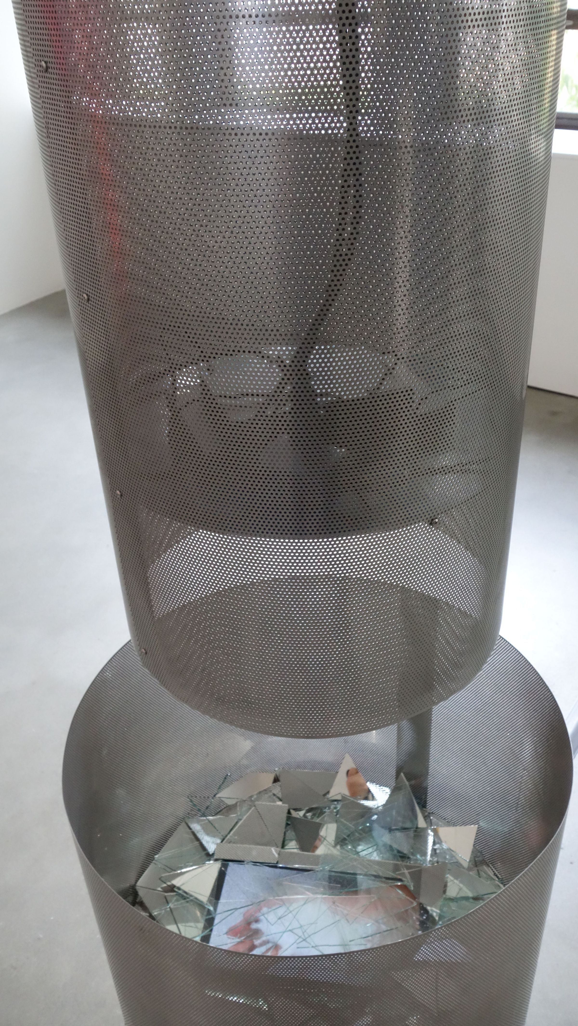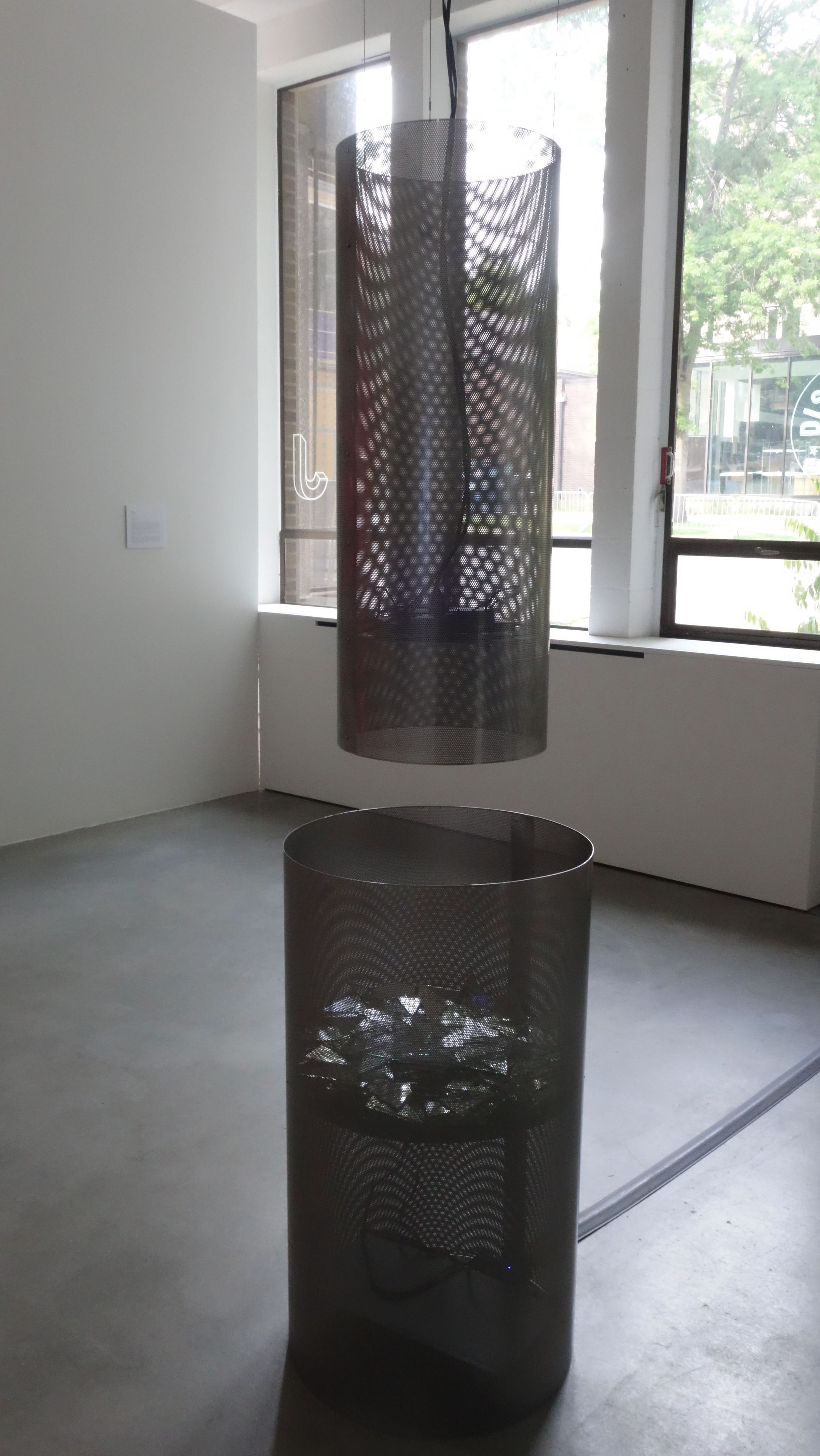 Requires a bit of installation by the artist and electrical connections, one above (toward th e ceiling) and one at the floor level. All the glass/mirror pieces in the bottom are placed by the artist in a more or less “improvised manner”.
