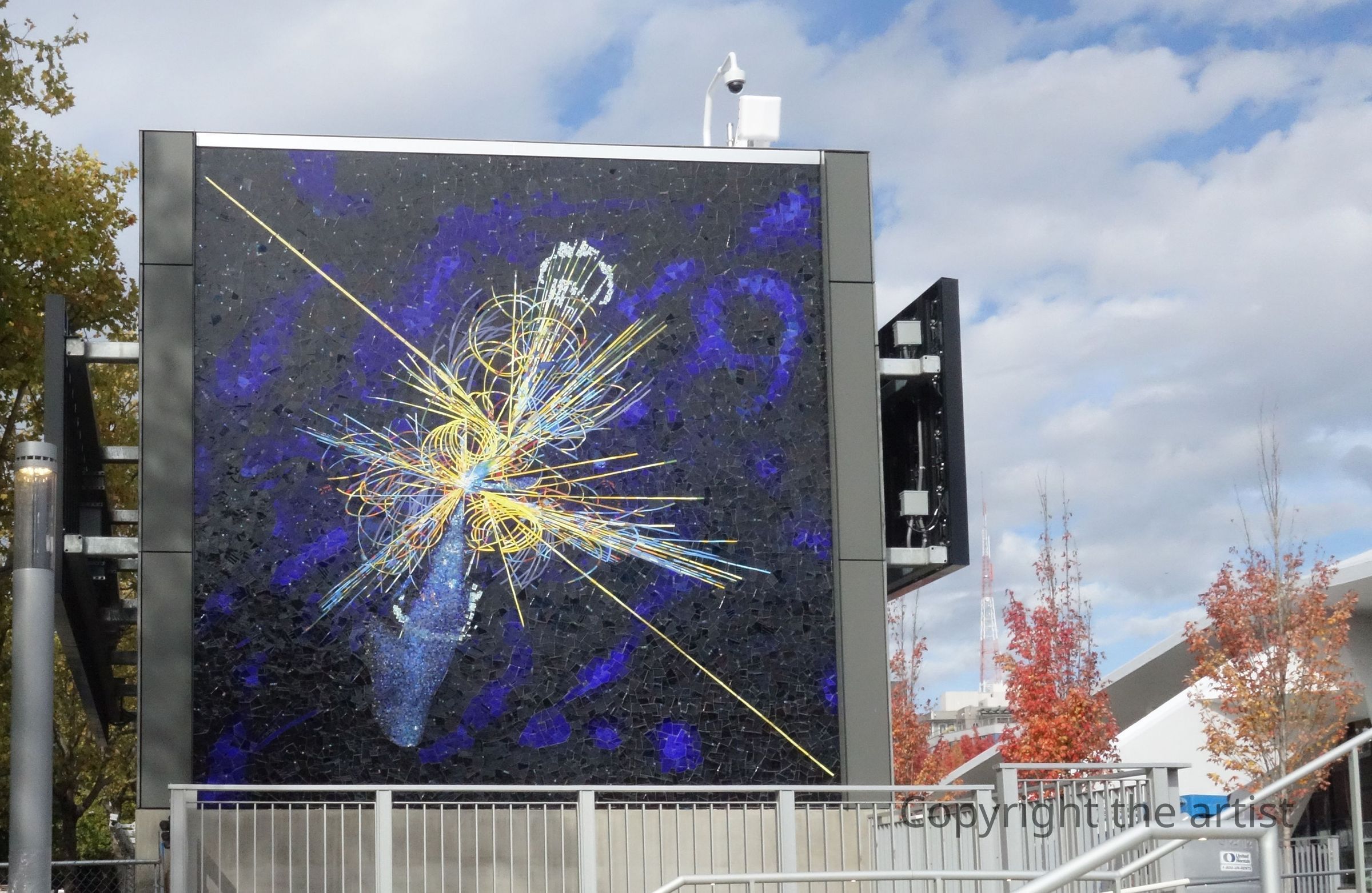 A mosaic based on atomic movement, particle collisions, galaxies and star explosions, the micro and macro of energy evokes the movement of human bodies, the beauty of attraction, the energy of sports and the movement within a city.Note